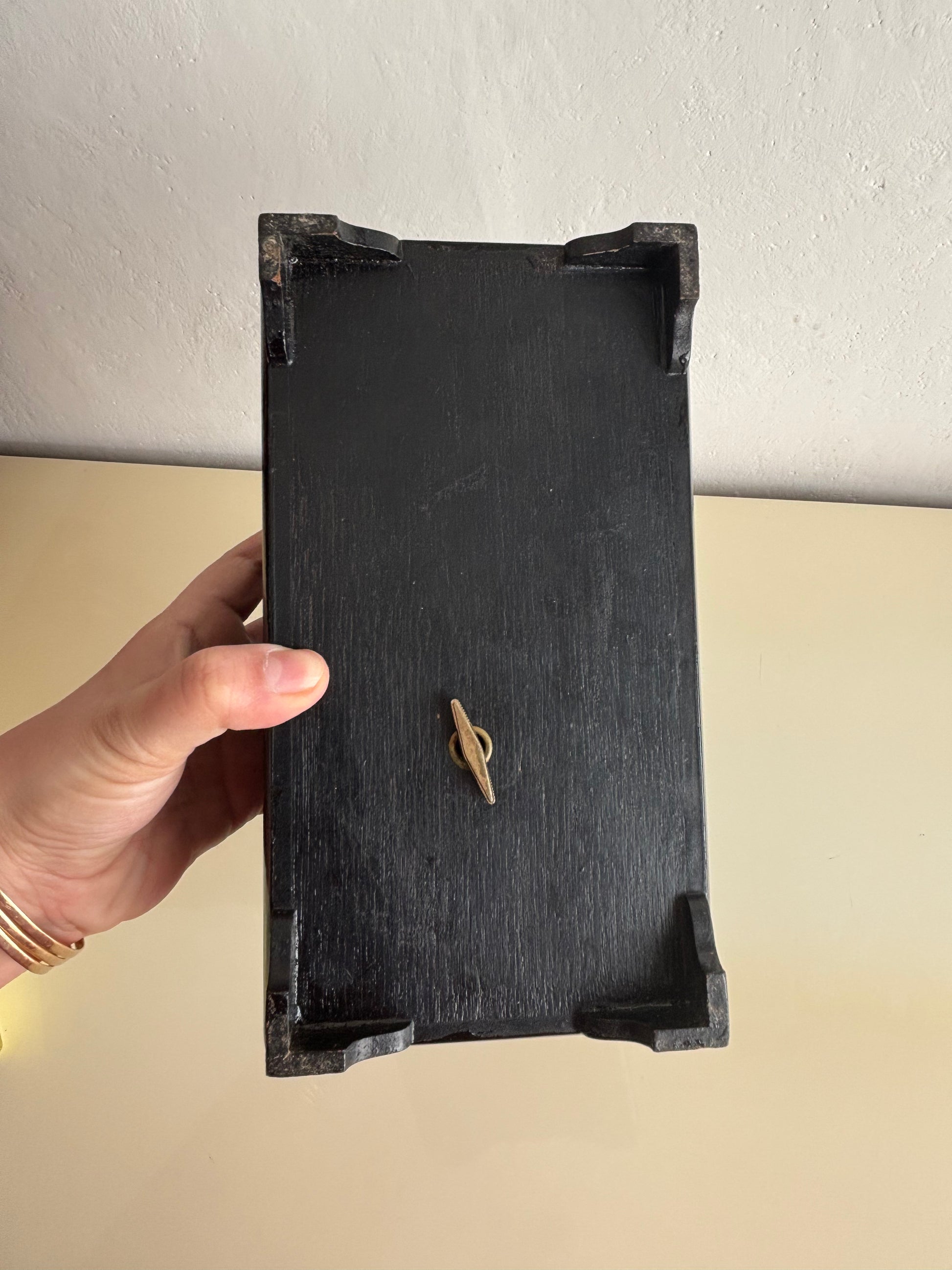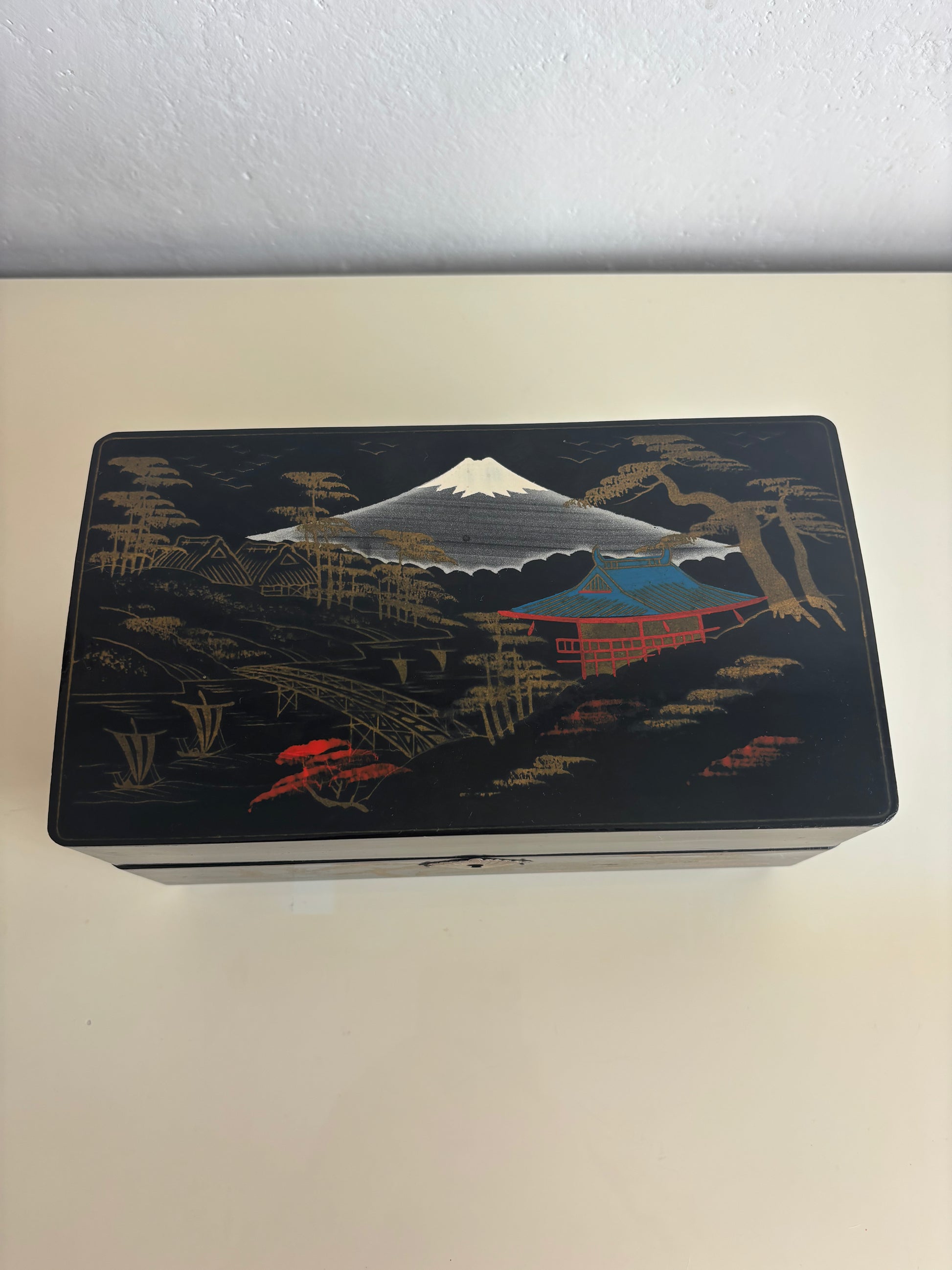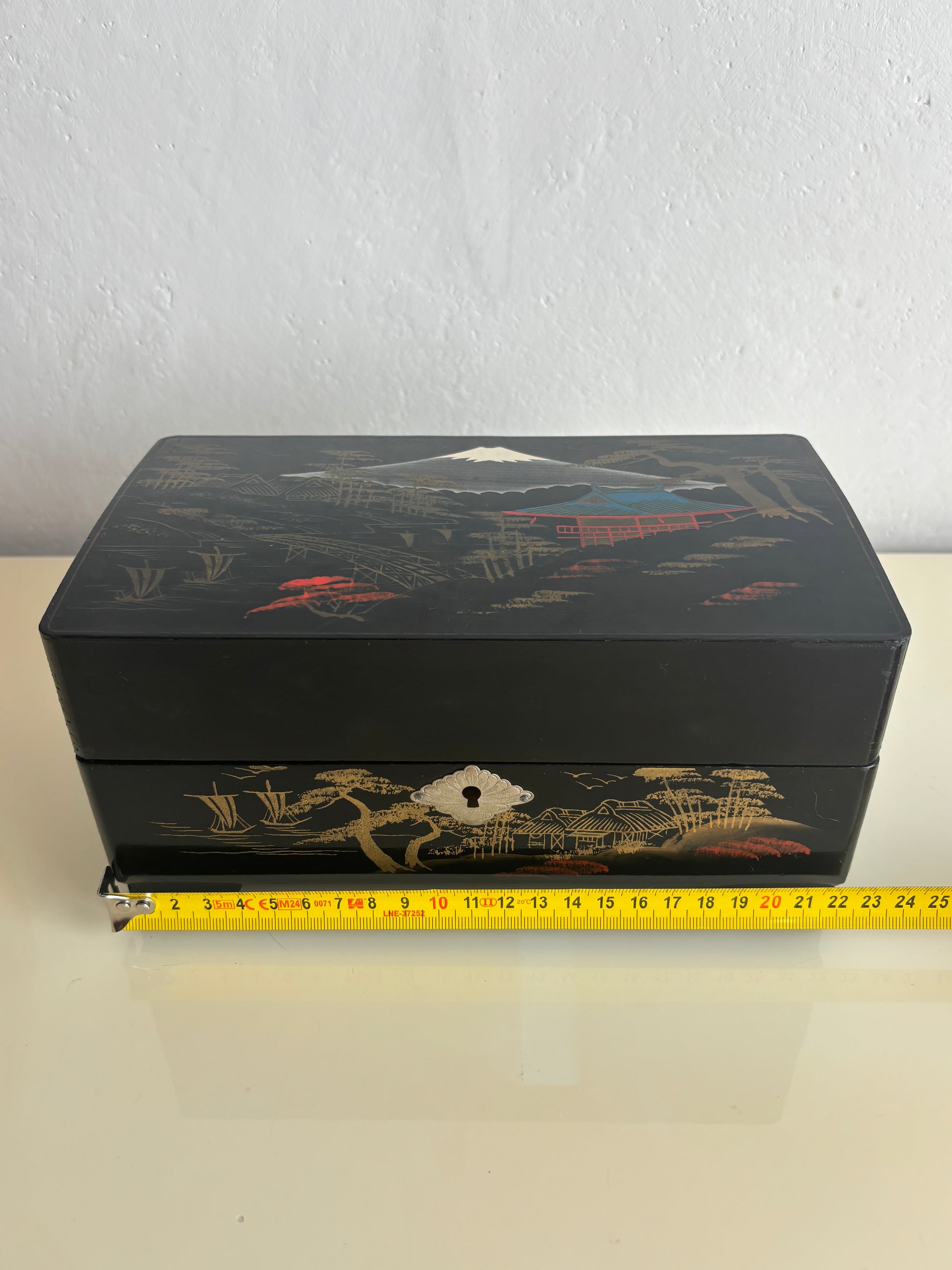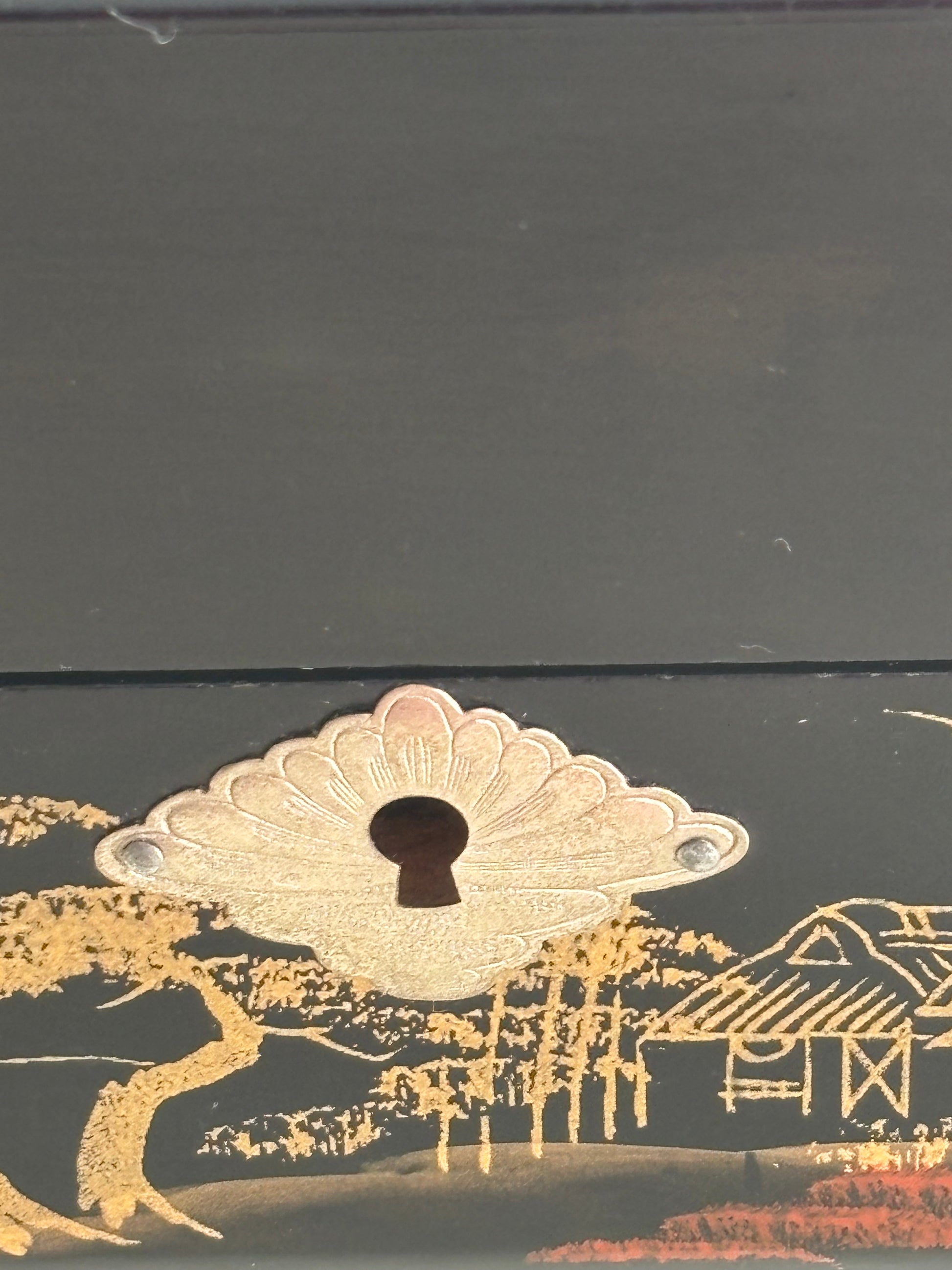 La struttura in legno laccato nero è decorata con paesaggi dorati e motivi tradizionali, mentre l’interno è rivestito in velluto rosso con scomparti per gioielli e una nappina gialla sul coperchio del vano centrale. Il carillon è perfettamente funzionante e si attiva all’apertura del cofanetto, regalando un’atmosfera nostalgica e delicata.