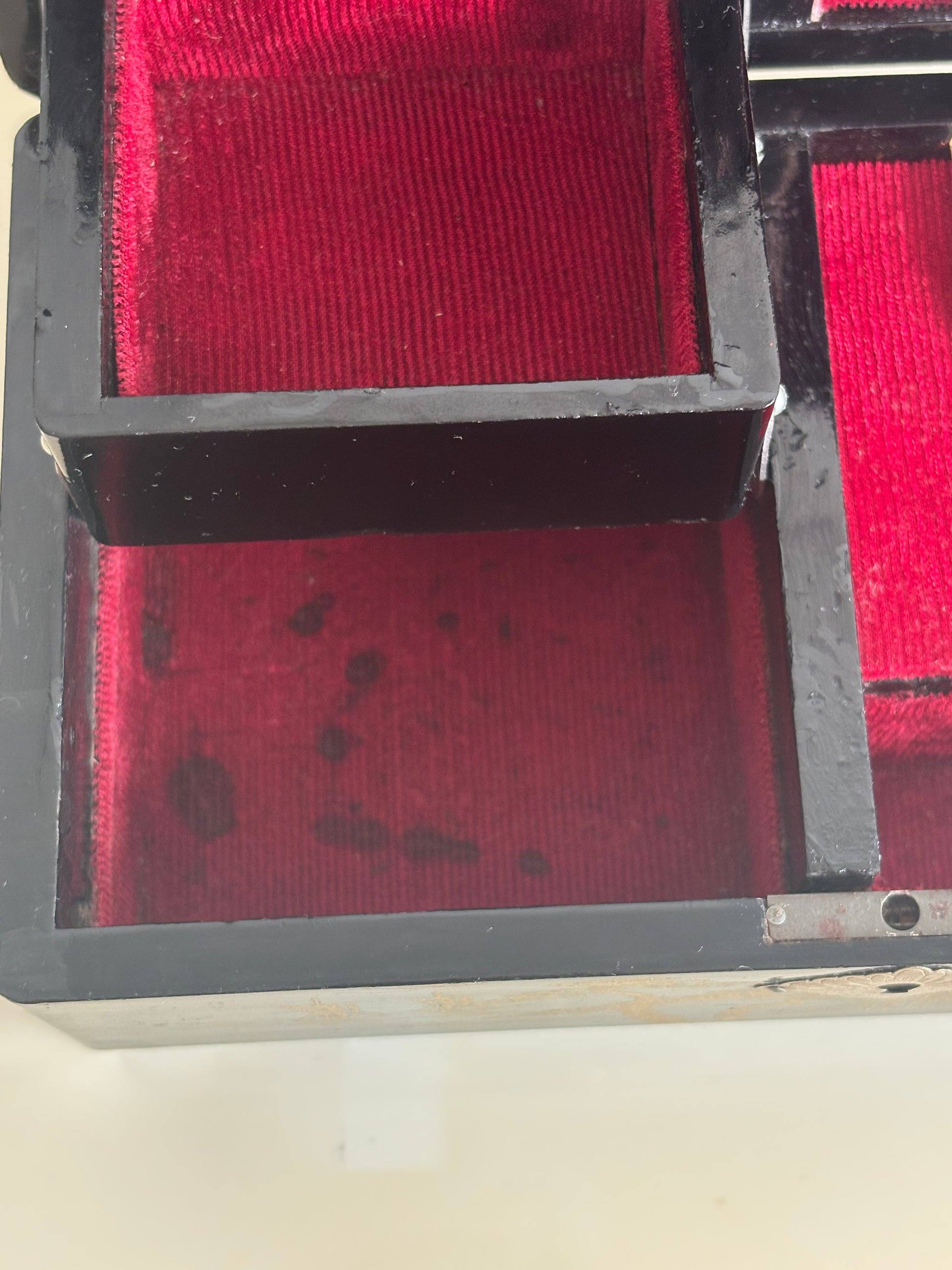 Sono presenti segni di usura e restauri visibili sulla lacca e sullo specchio, oltre ad alcune macchie sul velluto, come documentato in foto. La chiave non è inclusa.