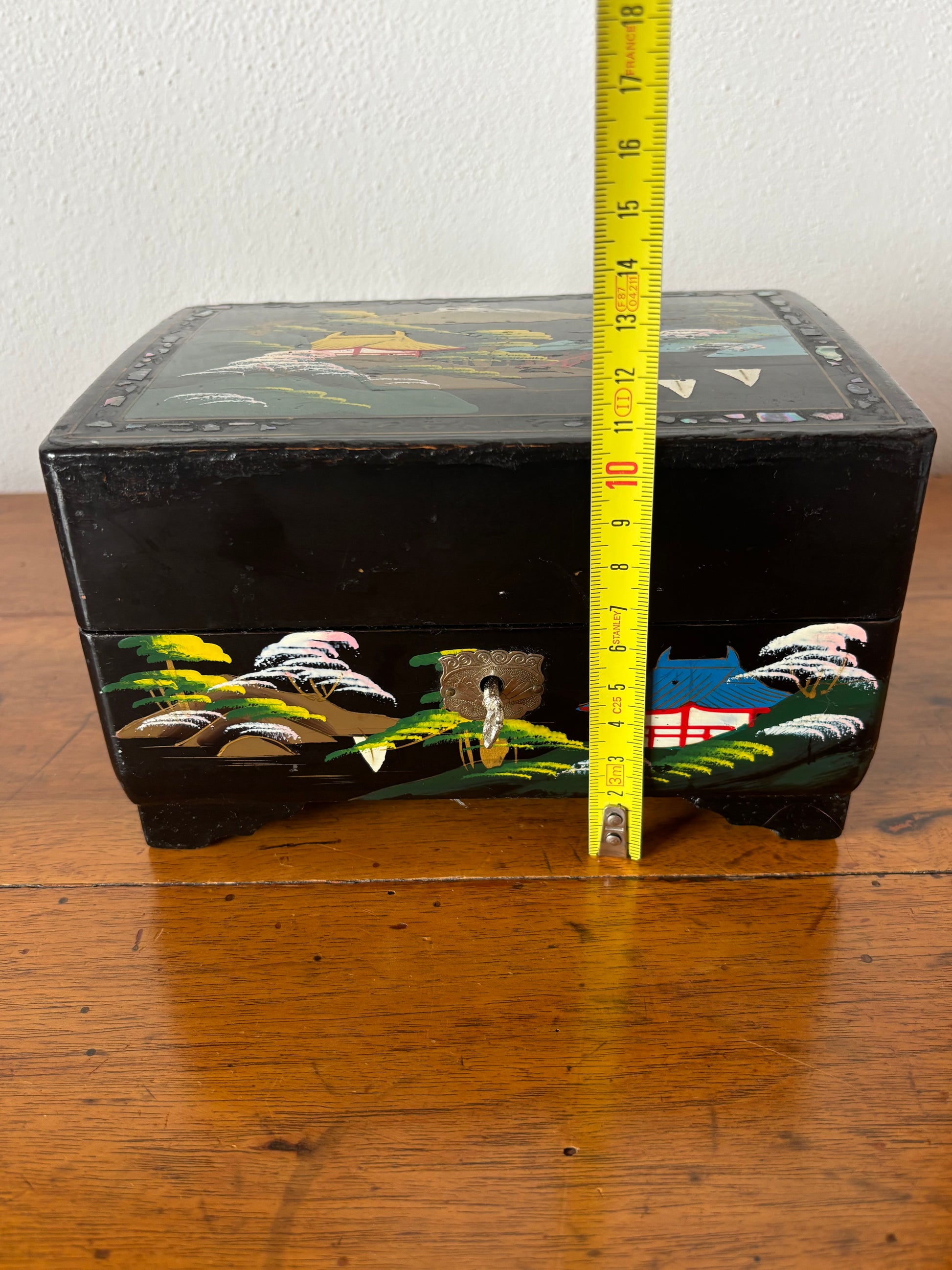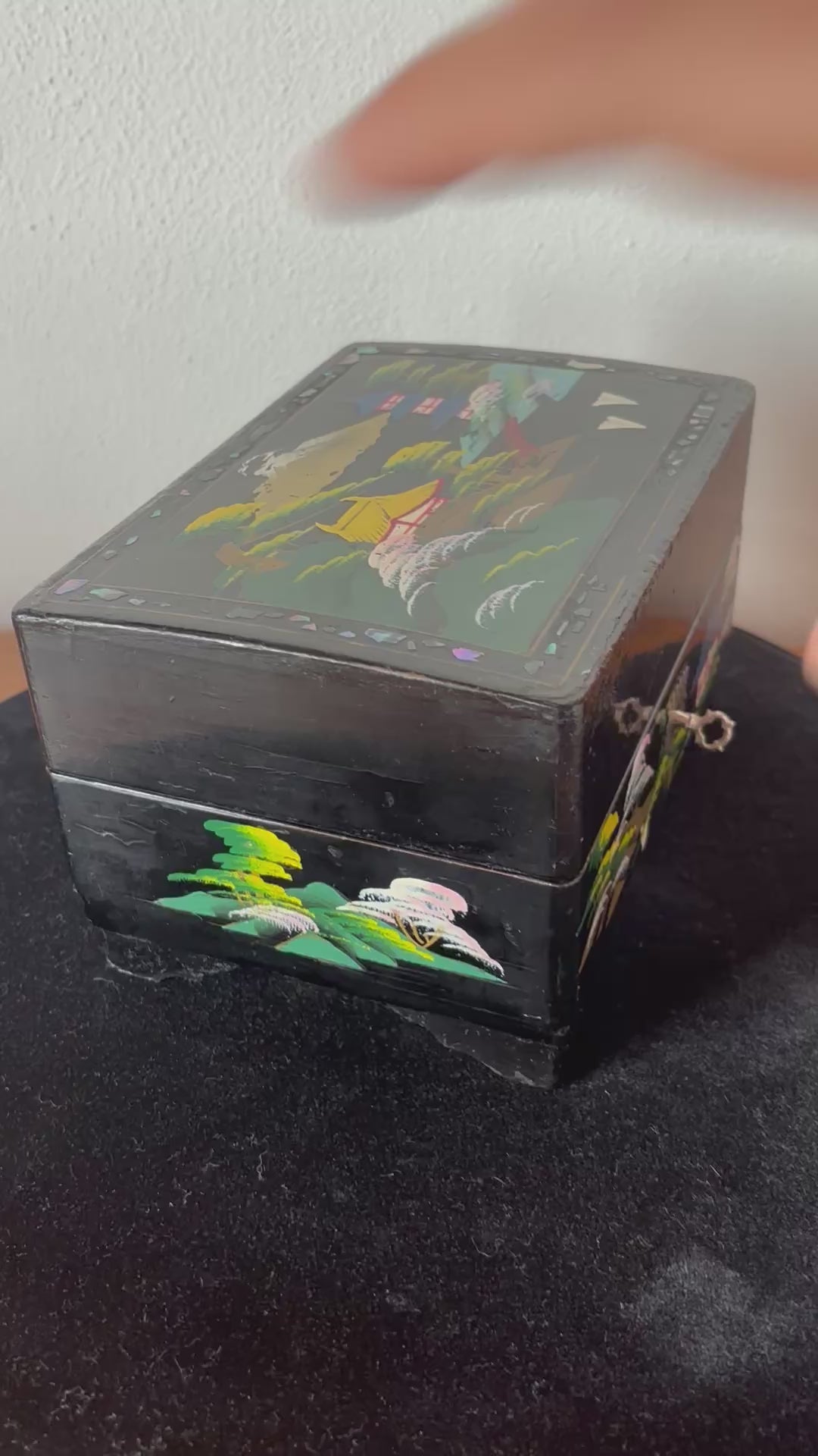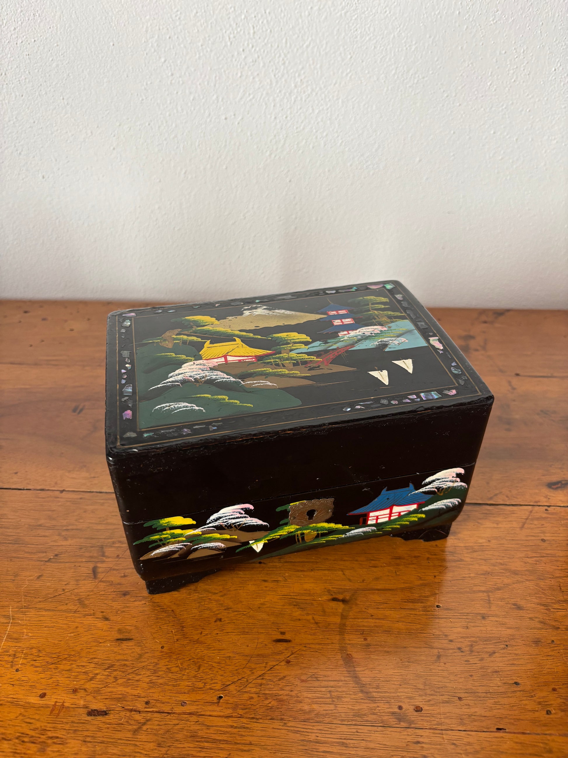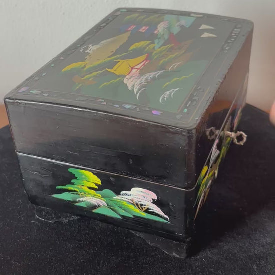 Scopri questo raffinato portagioie giapponese con carillon dal fascino vintage, un oggetto d’arte che unisce valore estetico e funzionalità musicale. La struttura è realizzata in legno laccato con finitura nera, decorata con un paesaggio tradizionale giapponese: pagode, alberi stilizzati e montagne si intrecciano in una scena armoniosa che richiama l’eleganza dell’estetica classica nipponica.