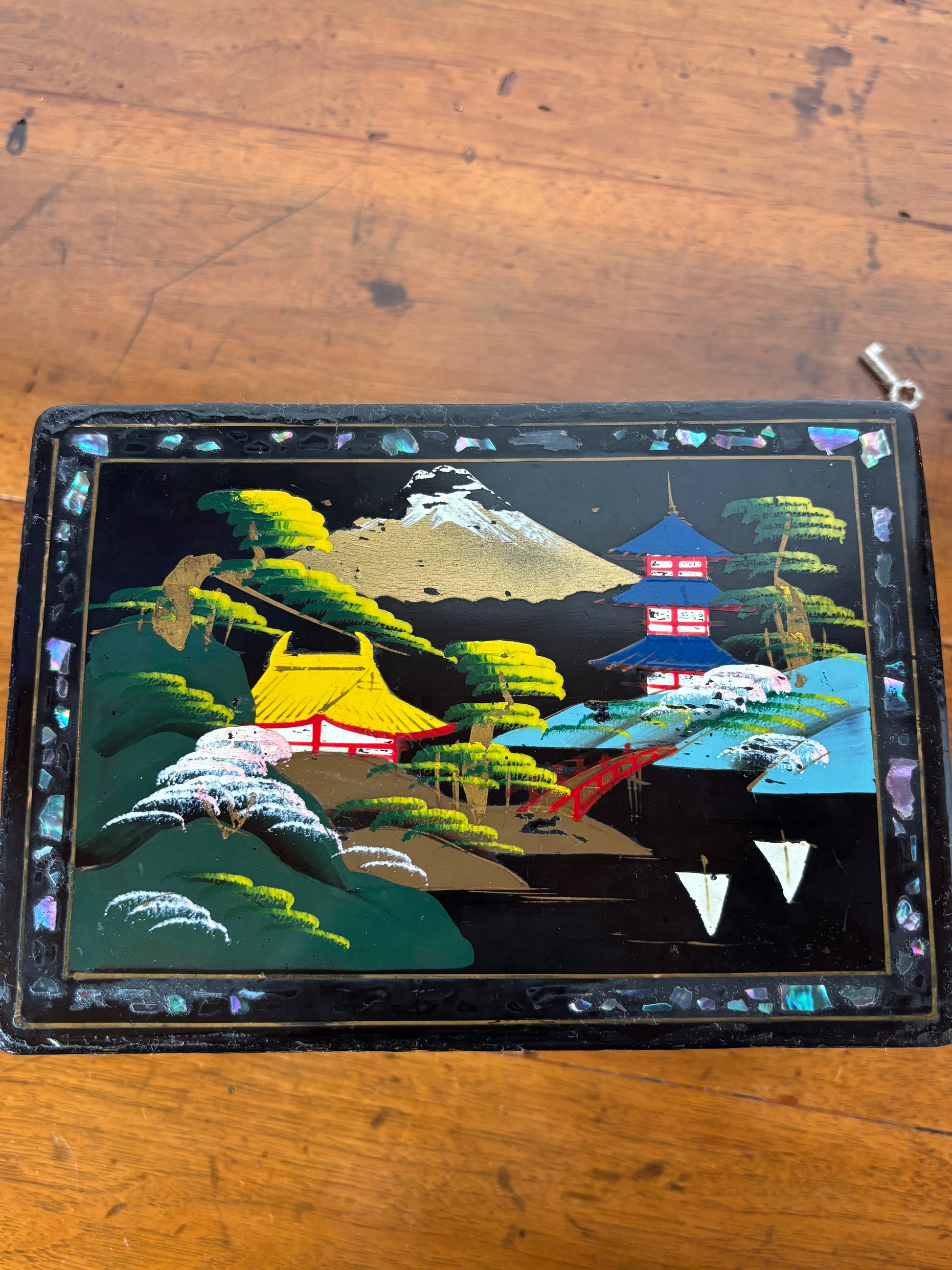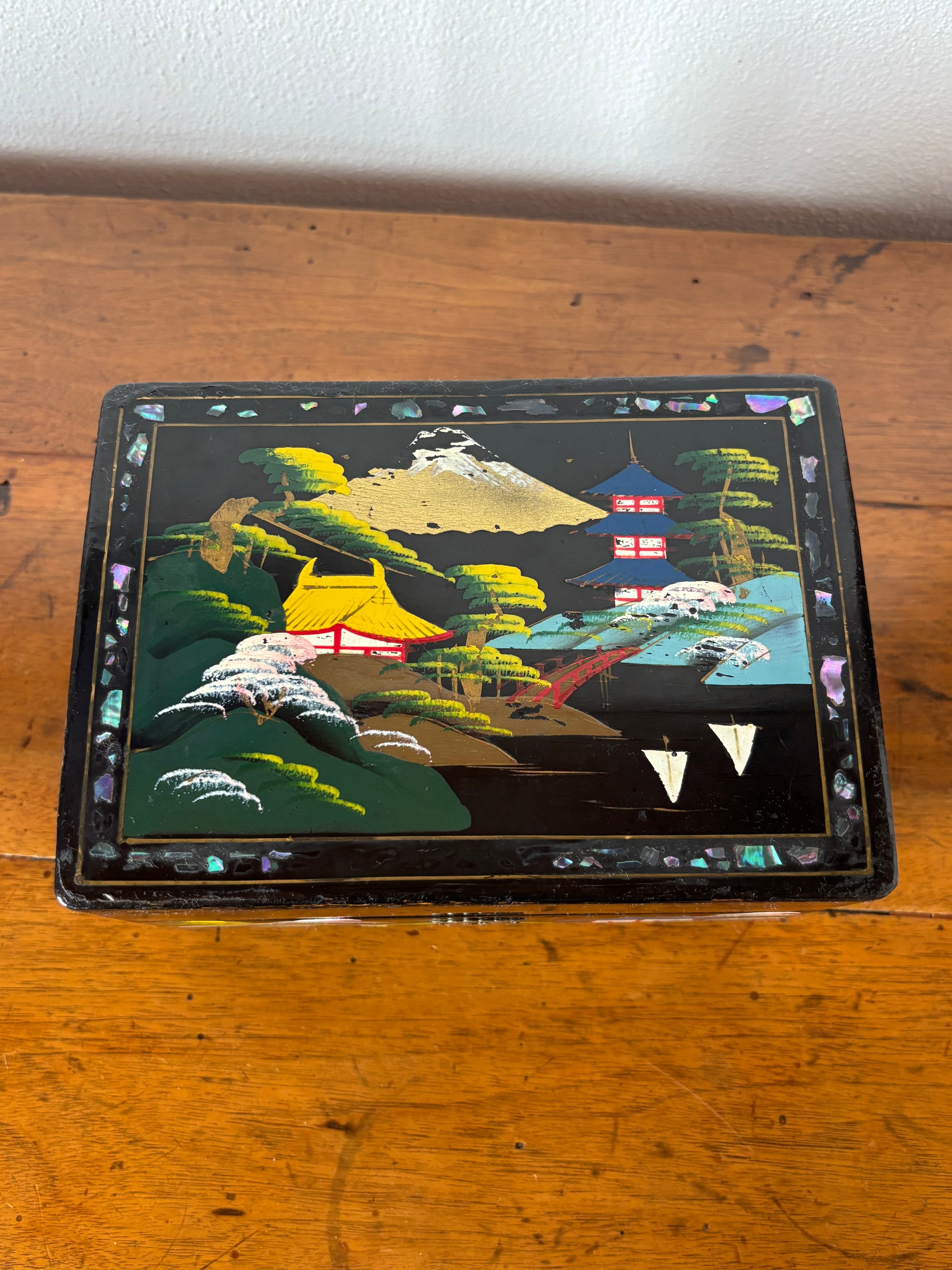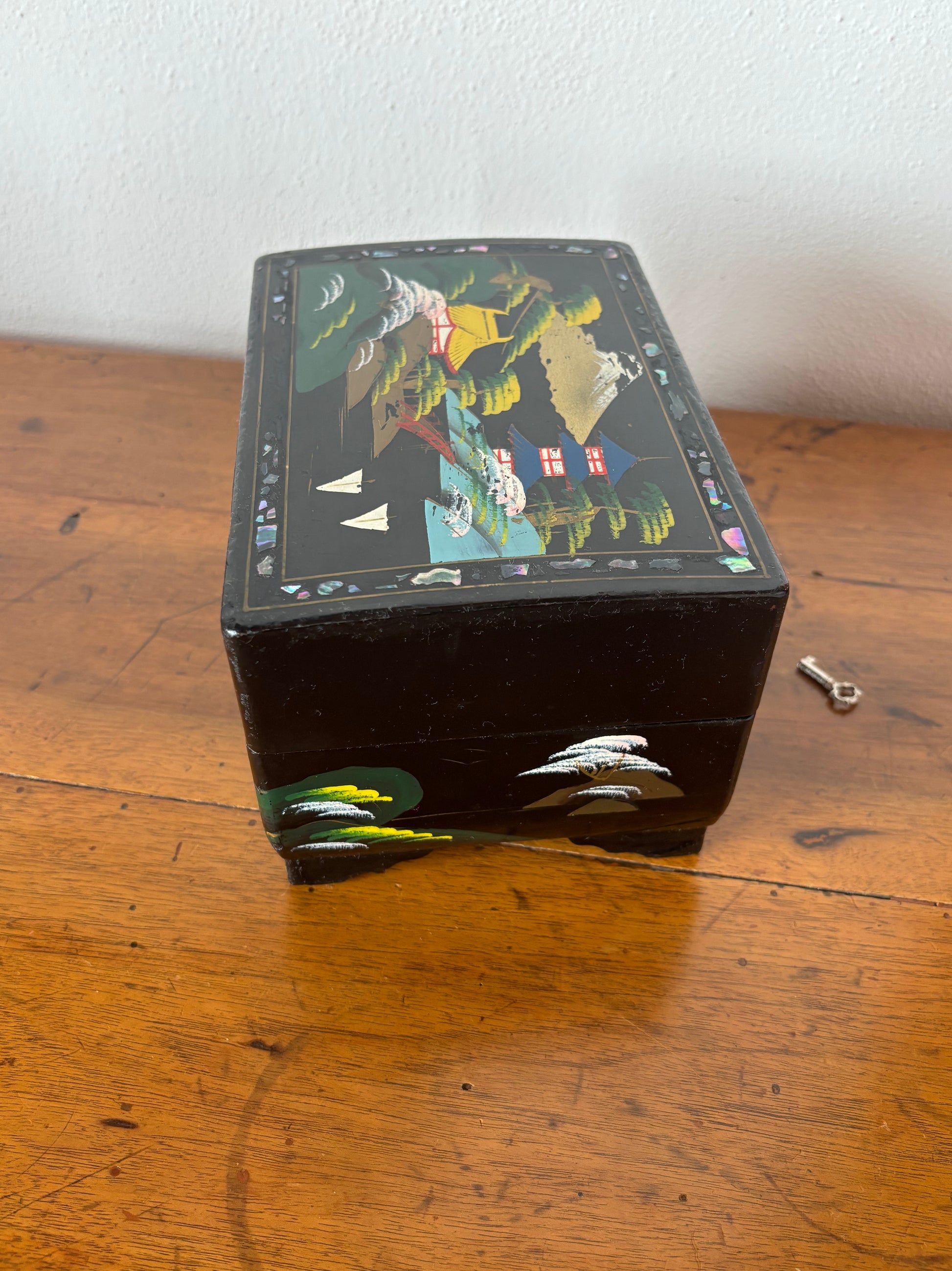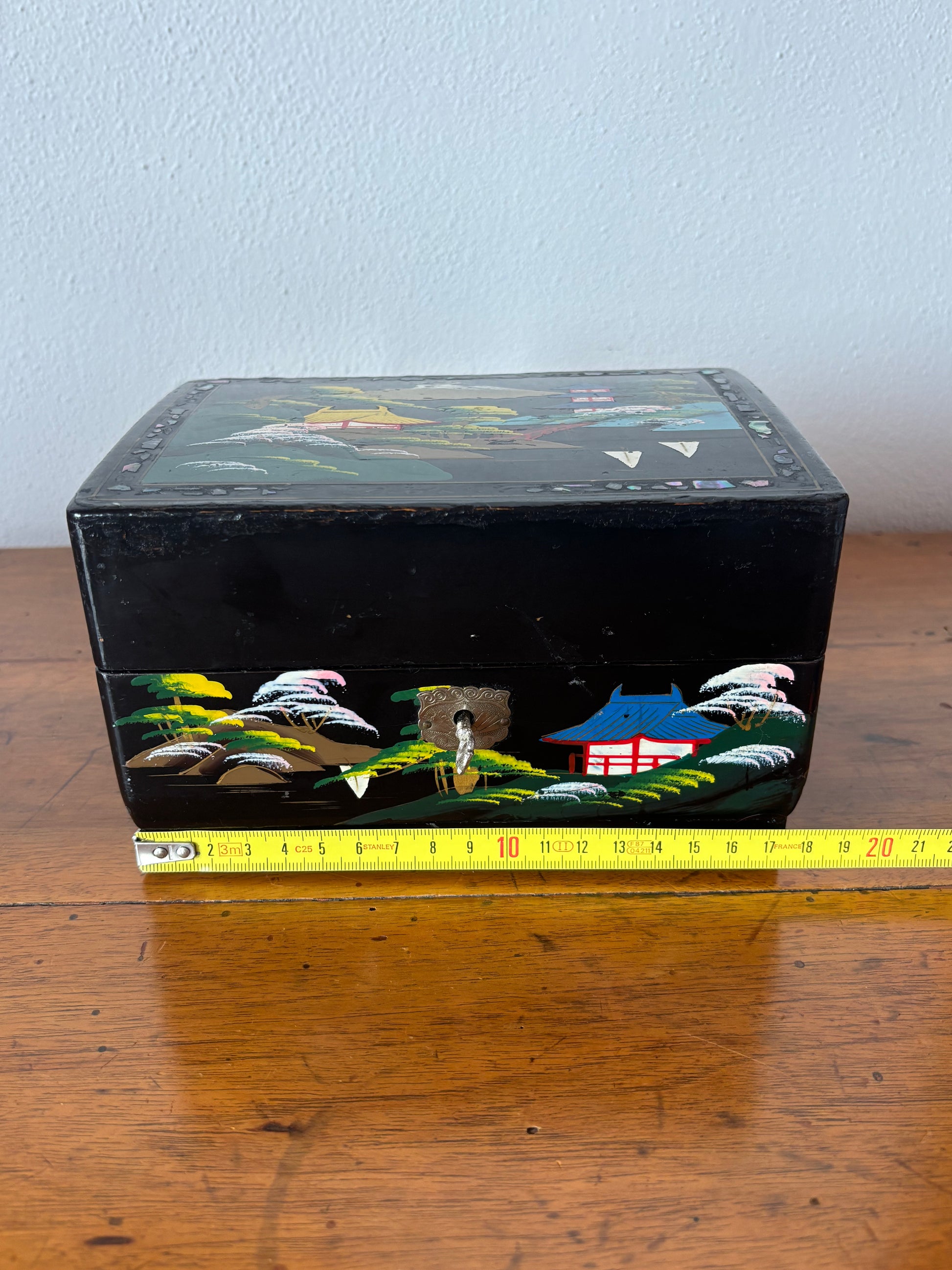 Scopri questo raffinato portagioie giapponese con carillon dal fascino vintage, un oggetto d’arte che unisce valore estetico e funzionalità musicale. La struttura è realizzata in legno laccato con finitura nera, decorata con un paesaggio tradizionale giapponese: pagode, alberi stilizzati e montagne si intrecciano in una scena armoniosa che richiama l’eleganza dell’estetica classica nipponica.