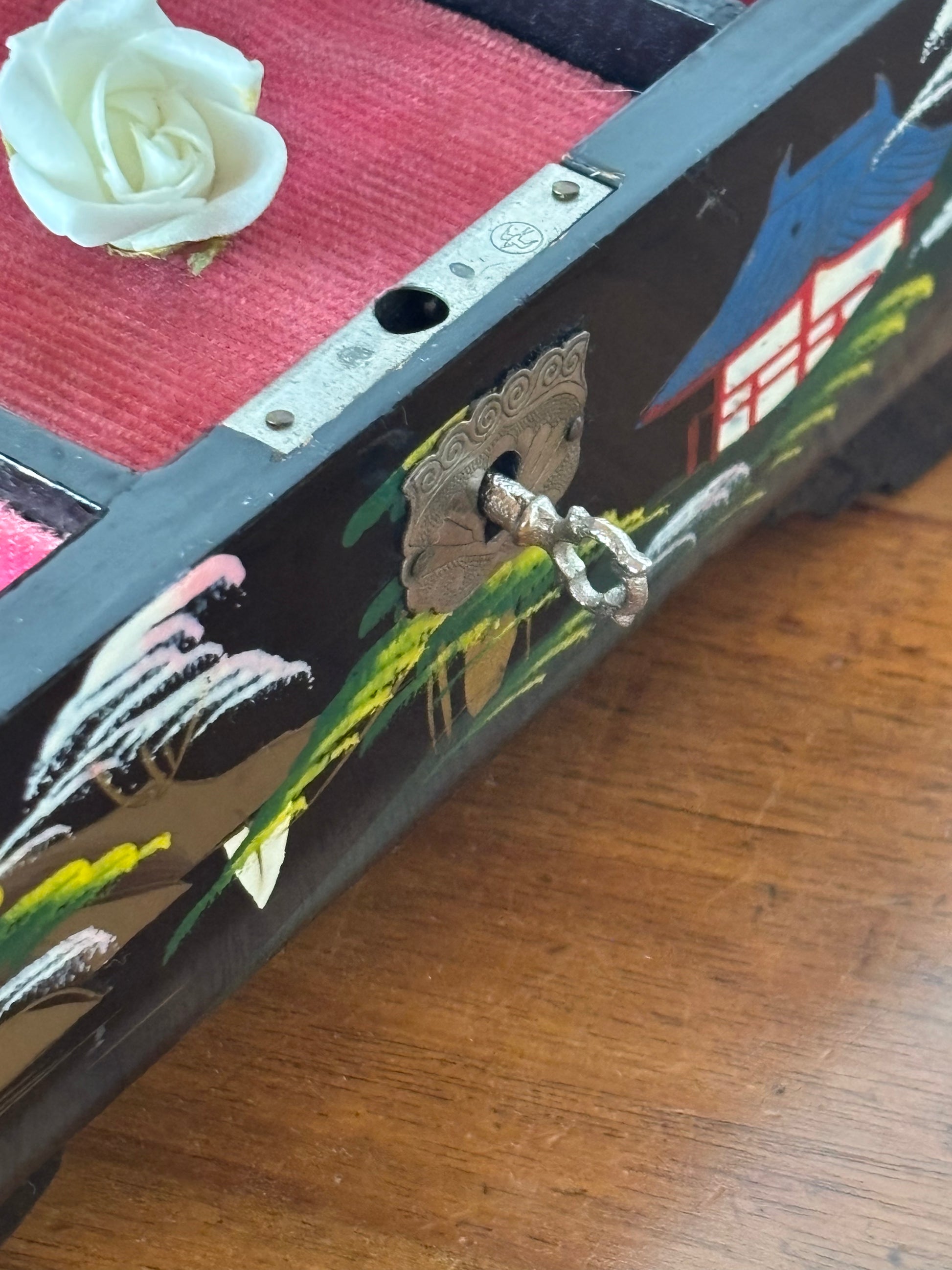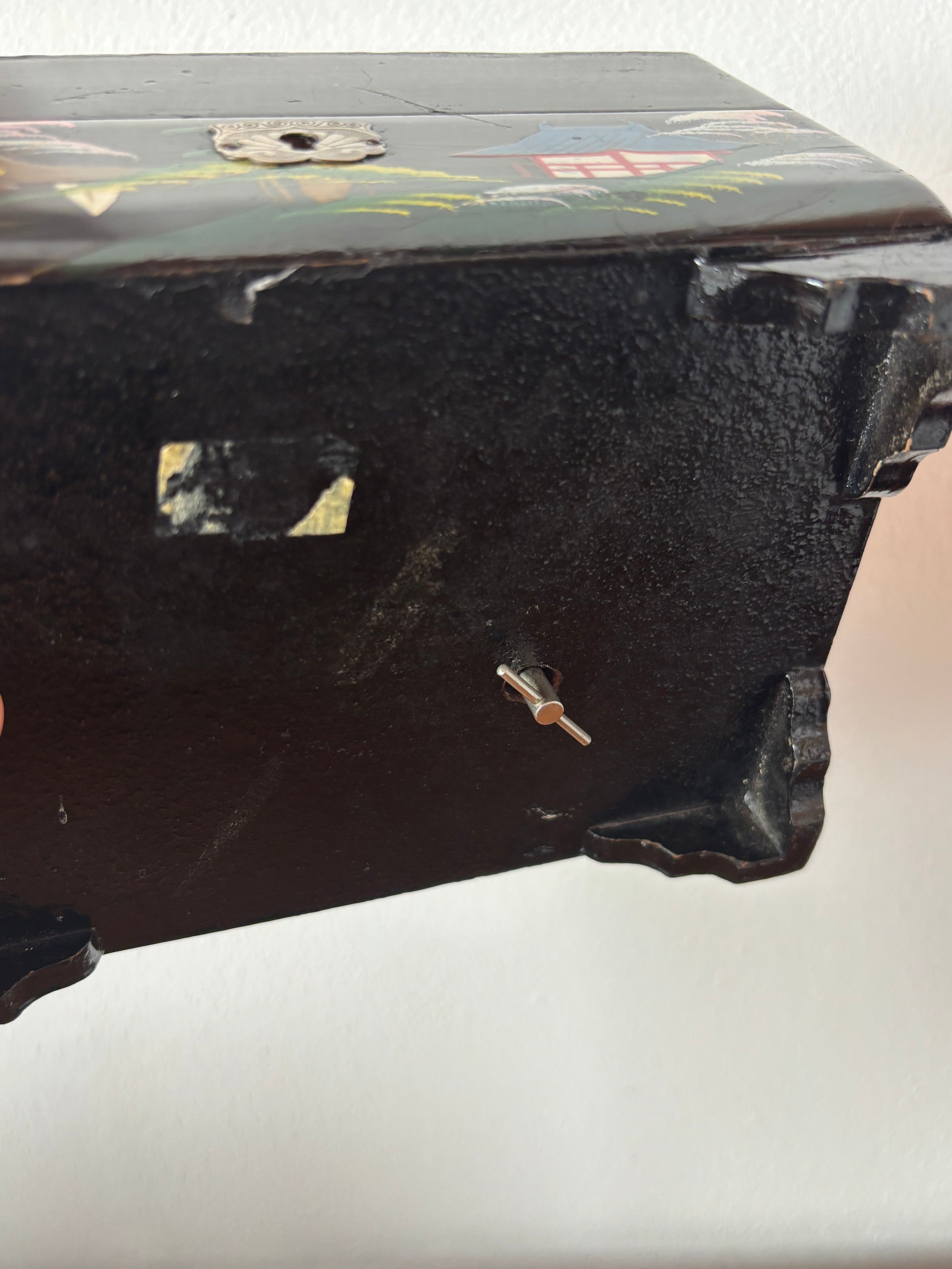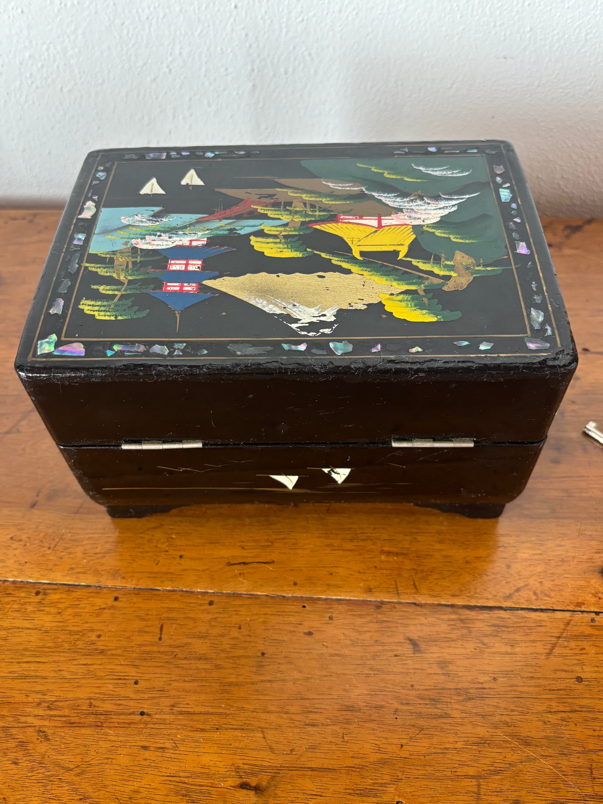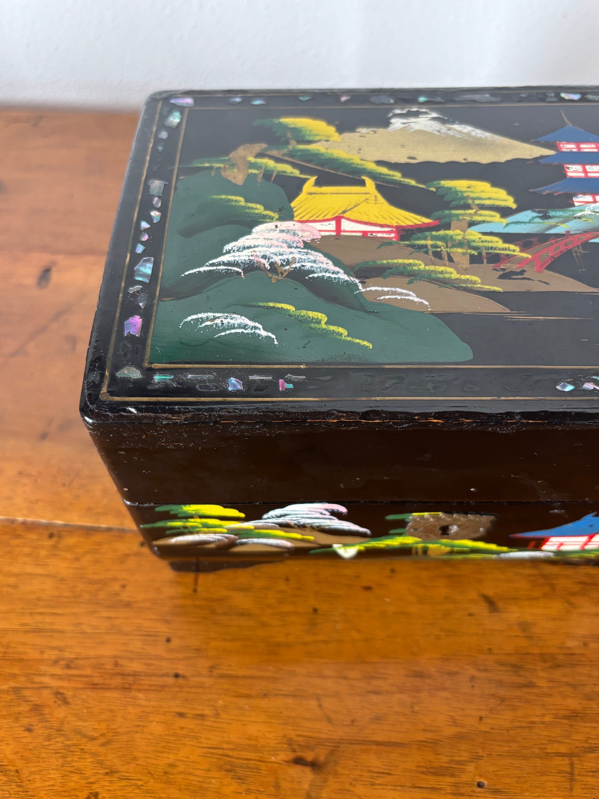 Scopri questo raffinato portagioie giapponese con carillon dal fascino vintage, un oggetto d’arte che unisce valore estetico e funzionalità musicale. La struttura è realizzata in legno laccato con finitura nera, decorata con un paesaggio tradizionale giapponese: pagode, alberi stilizzati e montagne si intrecciano in una scena armoniosa che richiama l’eleganza dell’estetica classica nipponica.