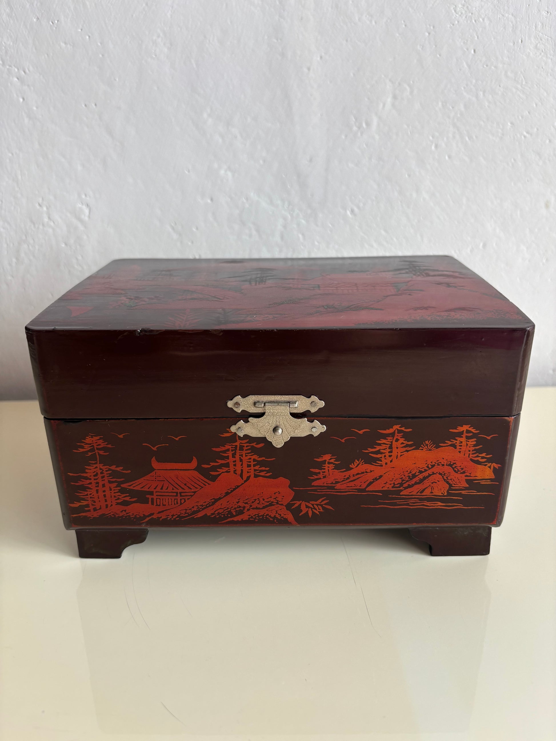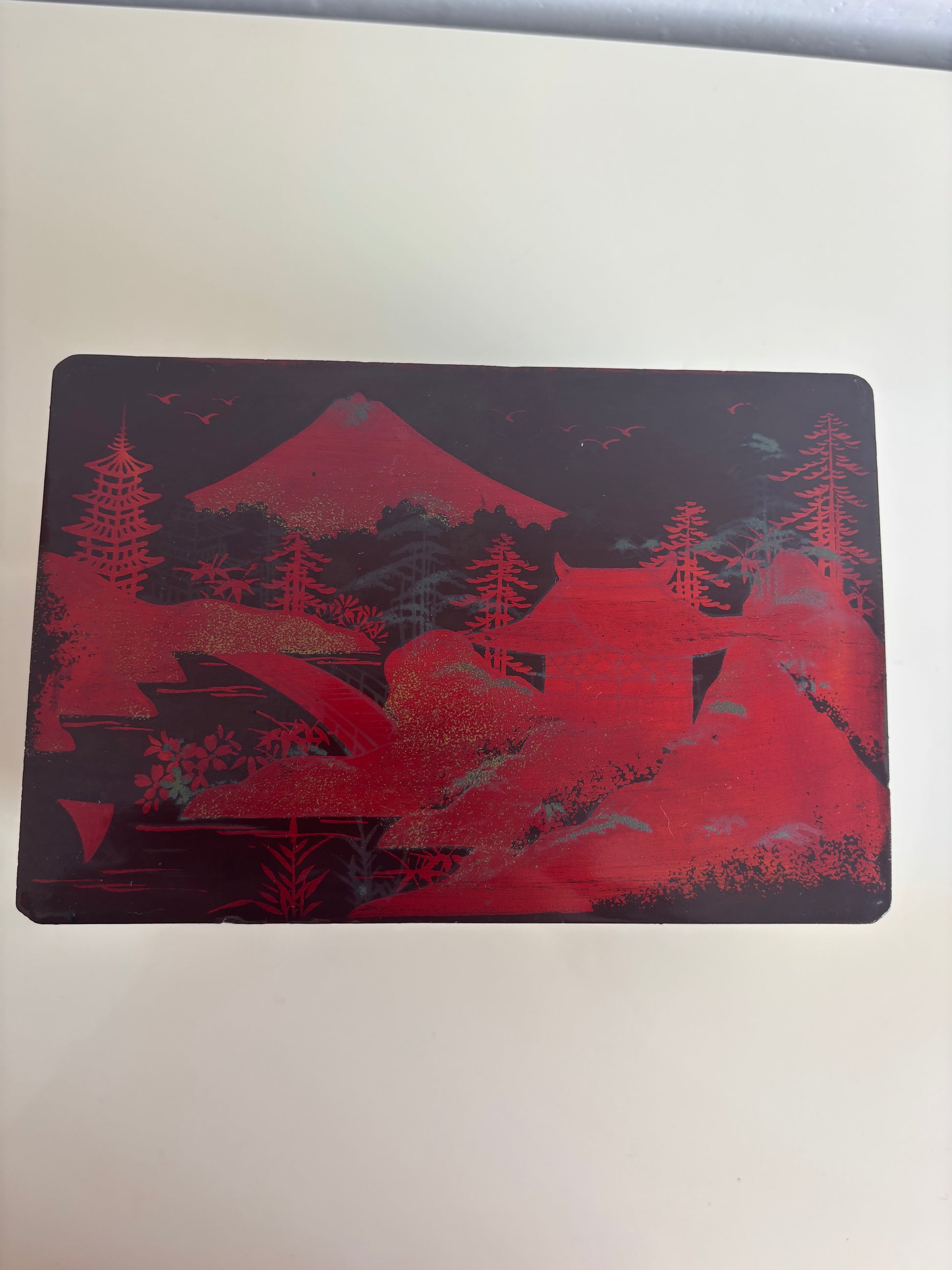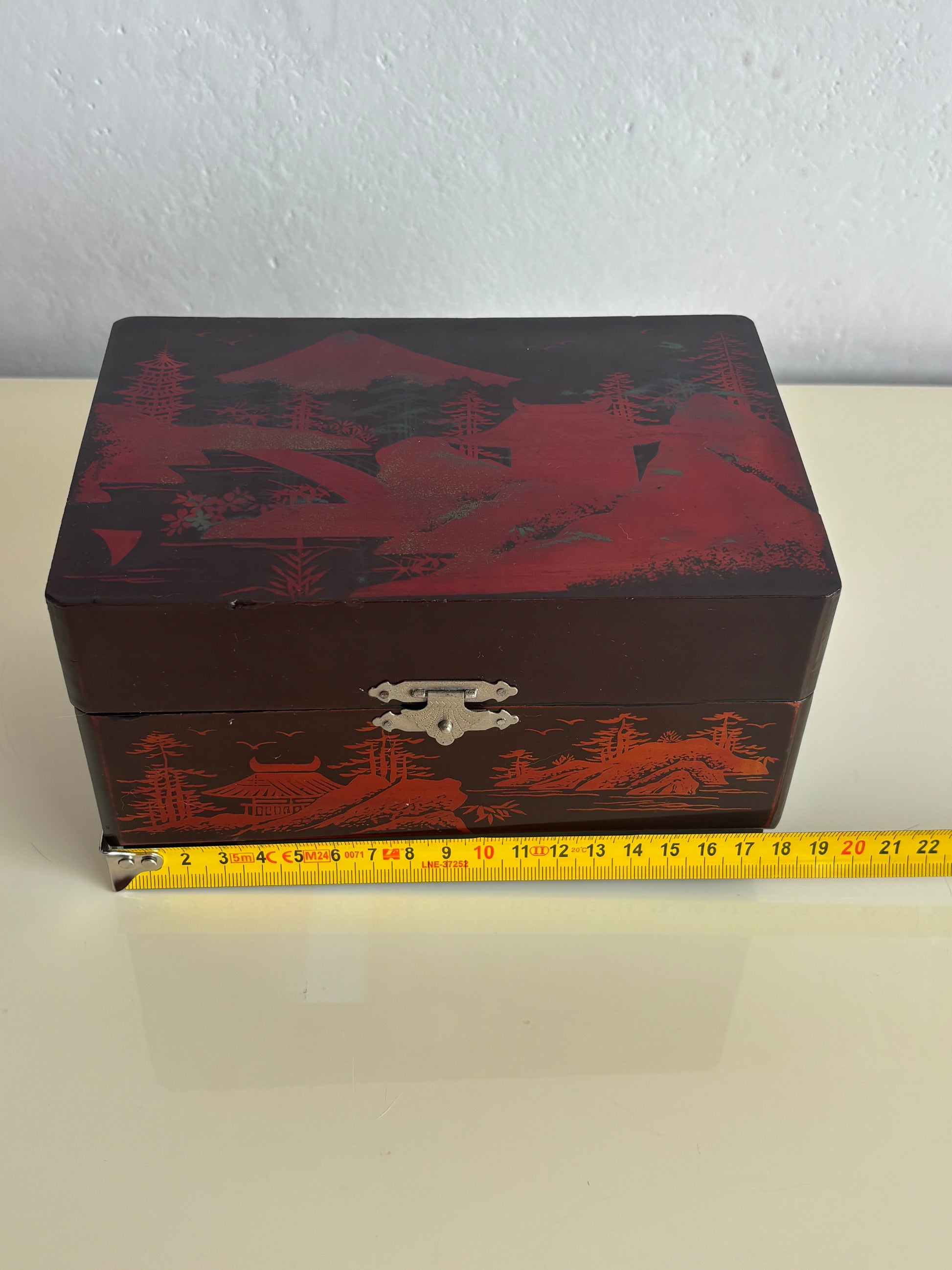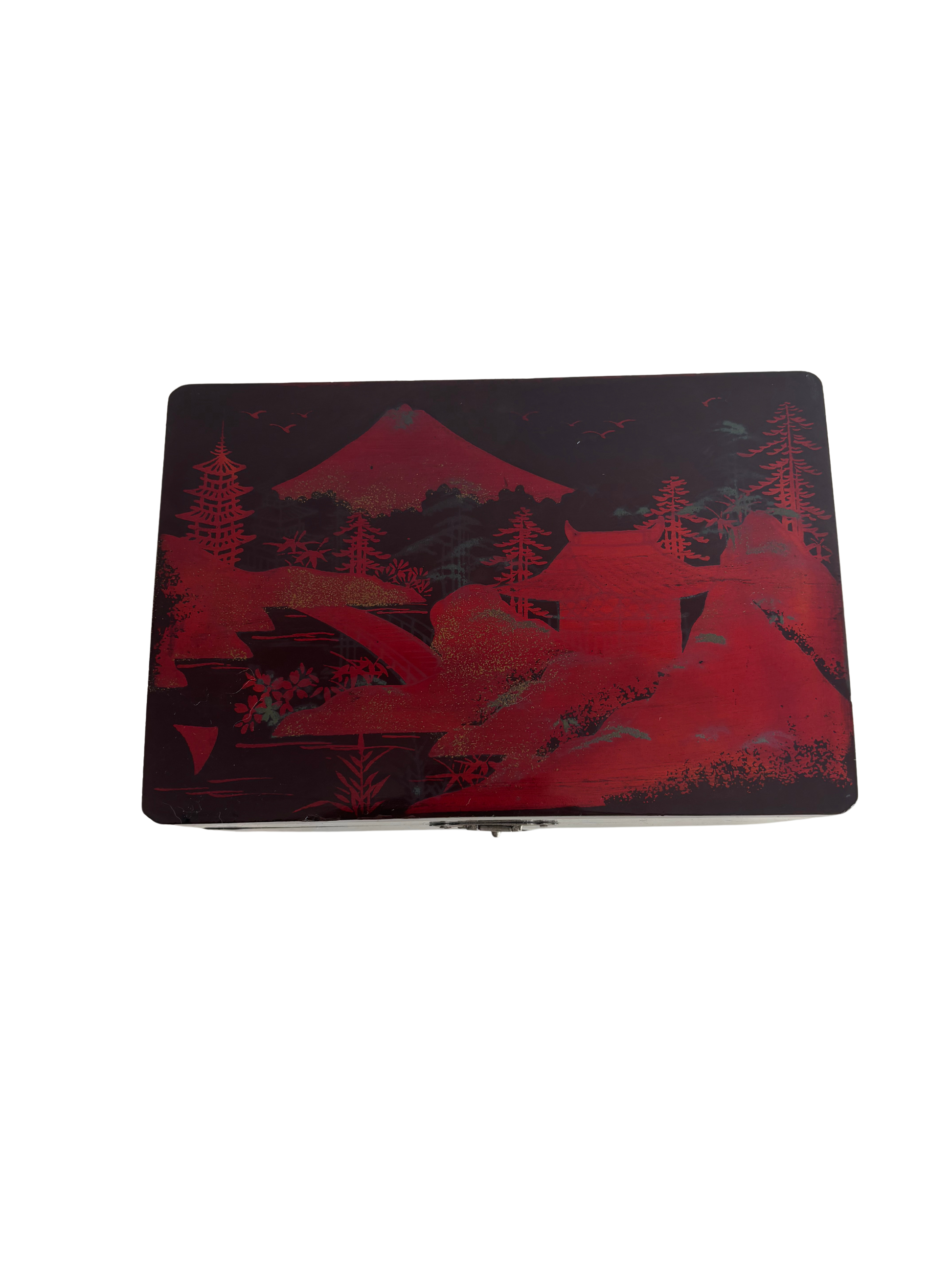 Elegante portagioie giapponese vintage con carillon, realizzato in legno laccato nero e decorato con paesaggi tradizionali, raffiguranti il Monte Fuji, pagode, ponti e alberi stilizzati. Il cofanetto presenta una decorazione con dettagli rossi che risaltano sul fondo scuro.