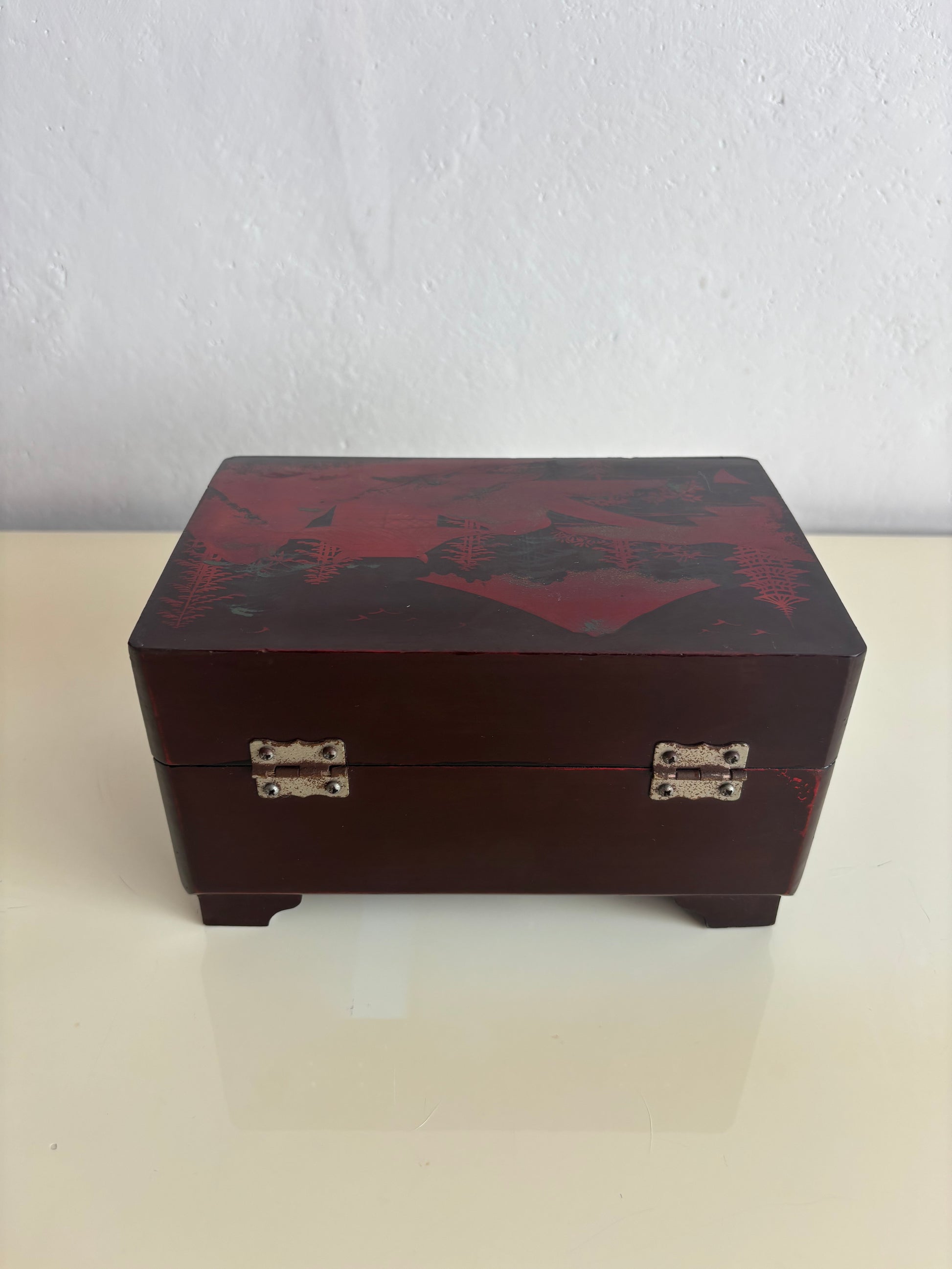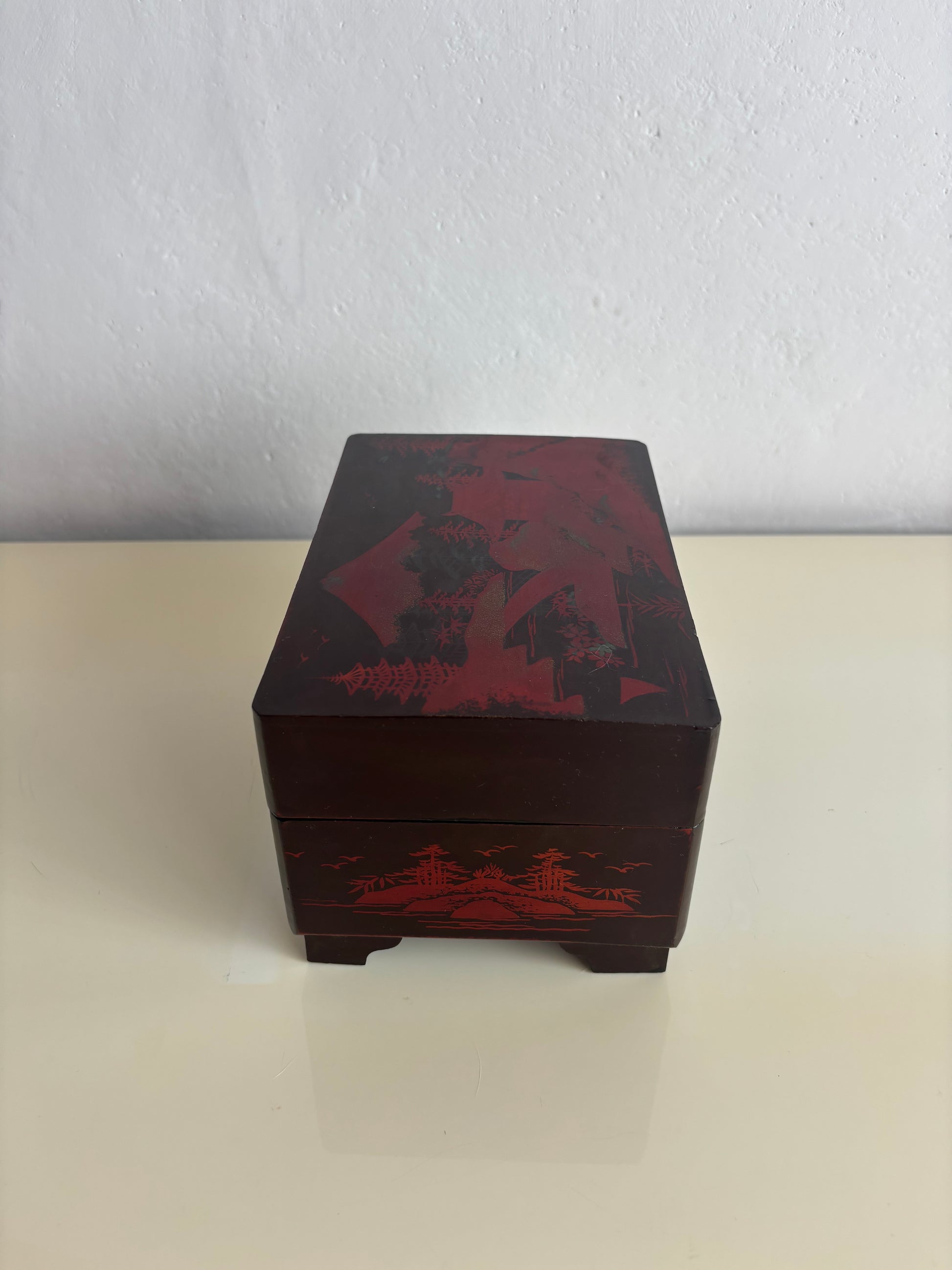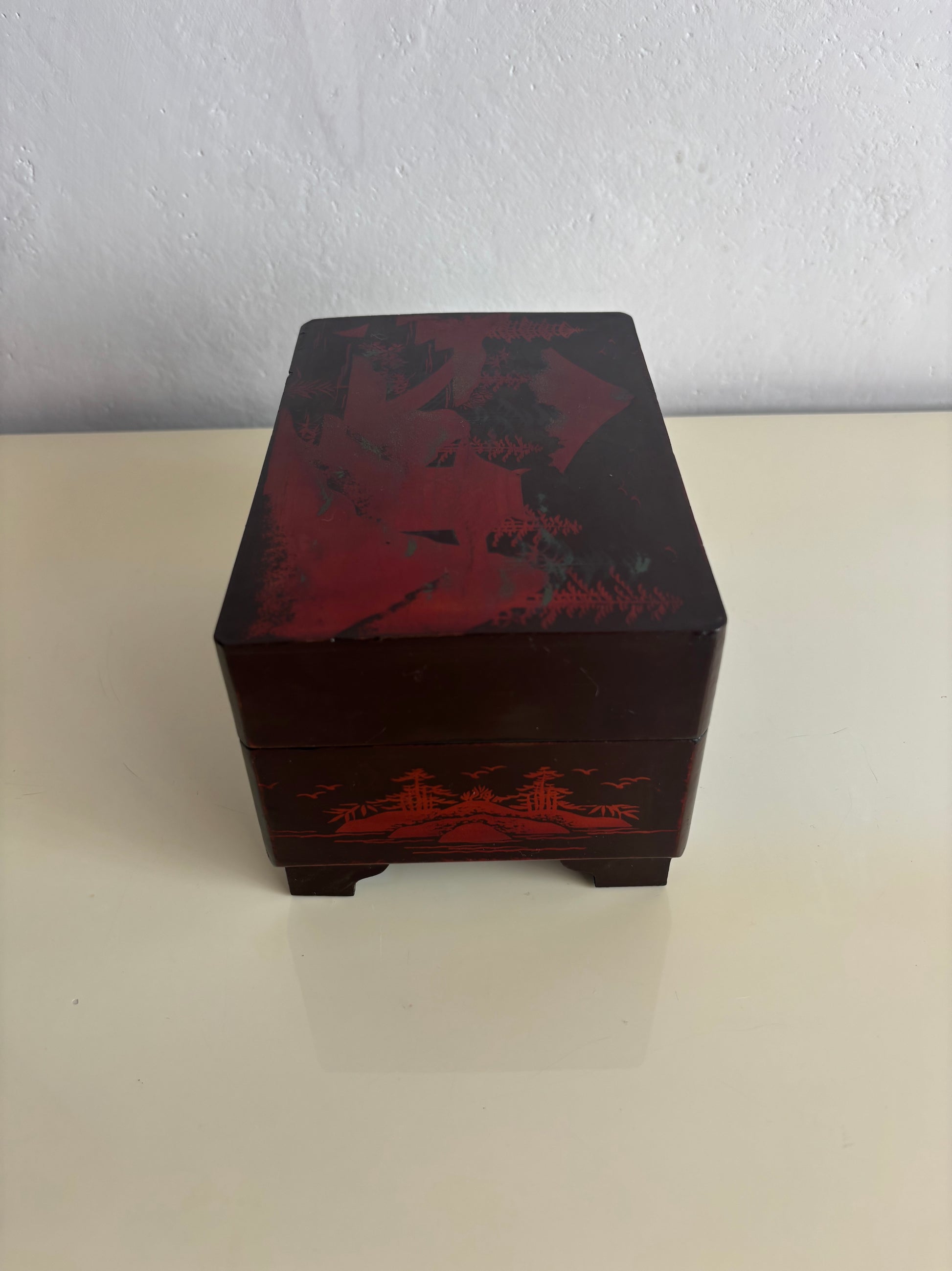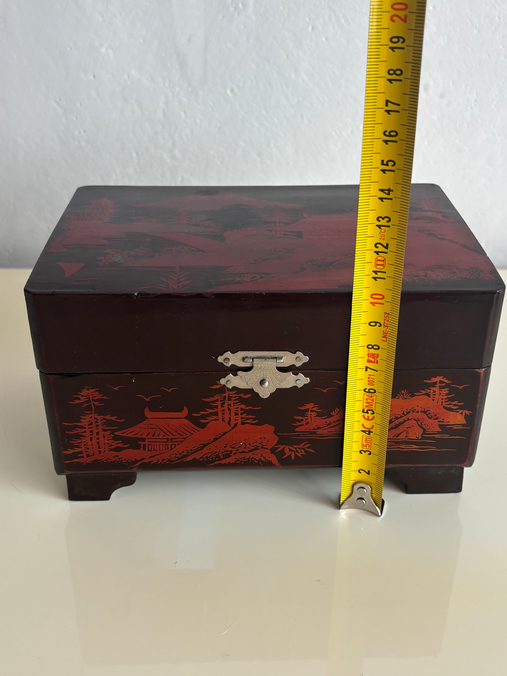 Elegante portagioie giapponese vintage con carillon, realizzato in legno laccato nero e decorato con paesaggi tradizionali, raffiguranti il Monte Fuji, pagode, ponti e alberi stilizzati. Il cofanetto presenta una decorazione con dettagli rossi che risaltano sul fondo scuro.
