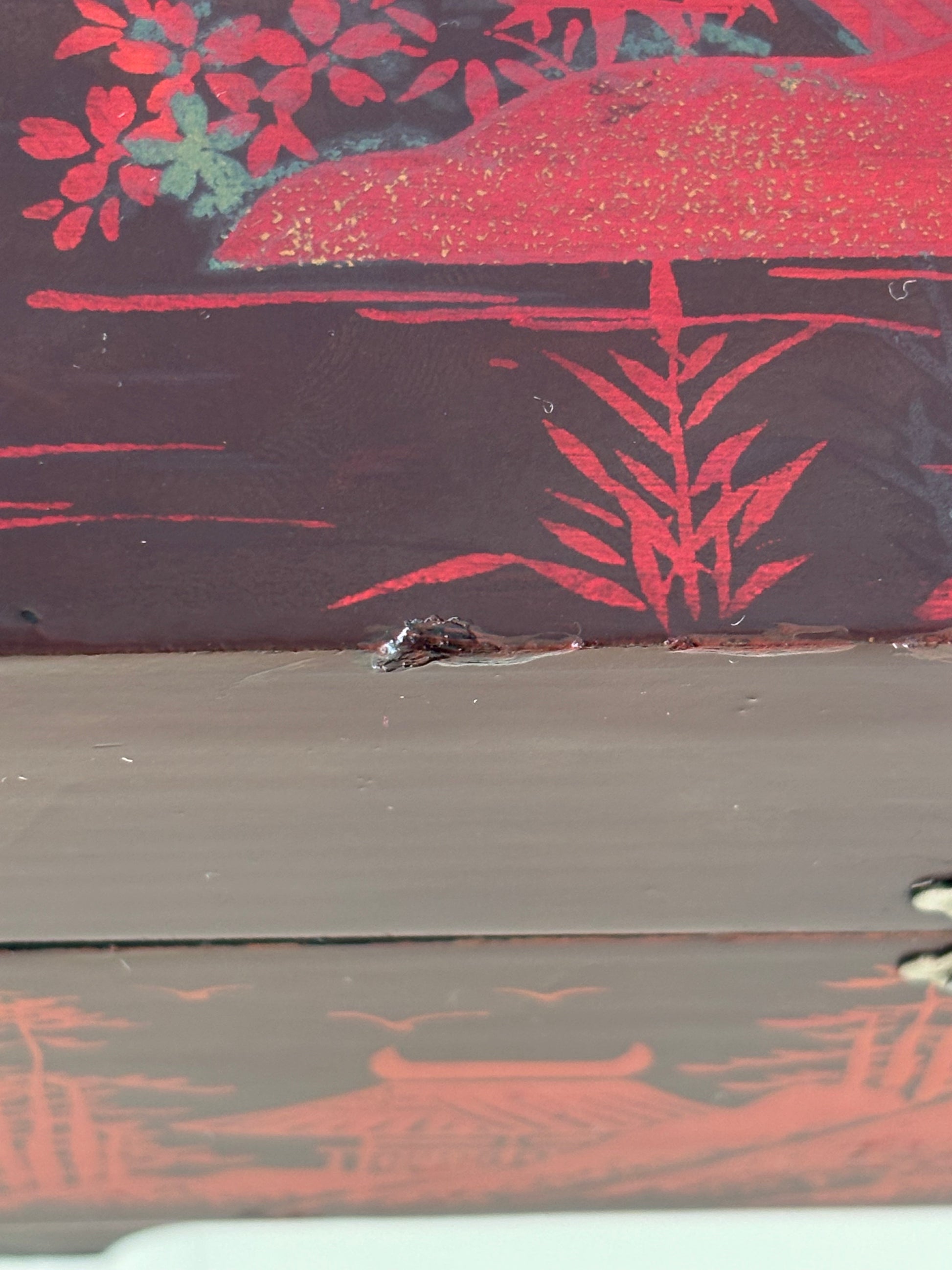 Il carillon è perfettamente funzionante e si attiva all’apertura del coperchio, accompagnando il gesto con una melodia delicata. Sono presenti alcuni segni di usura e interventi di restauro visibili sulla superficie laccata, compatibili con l’età e l’uso dell’oggetto.