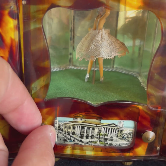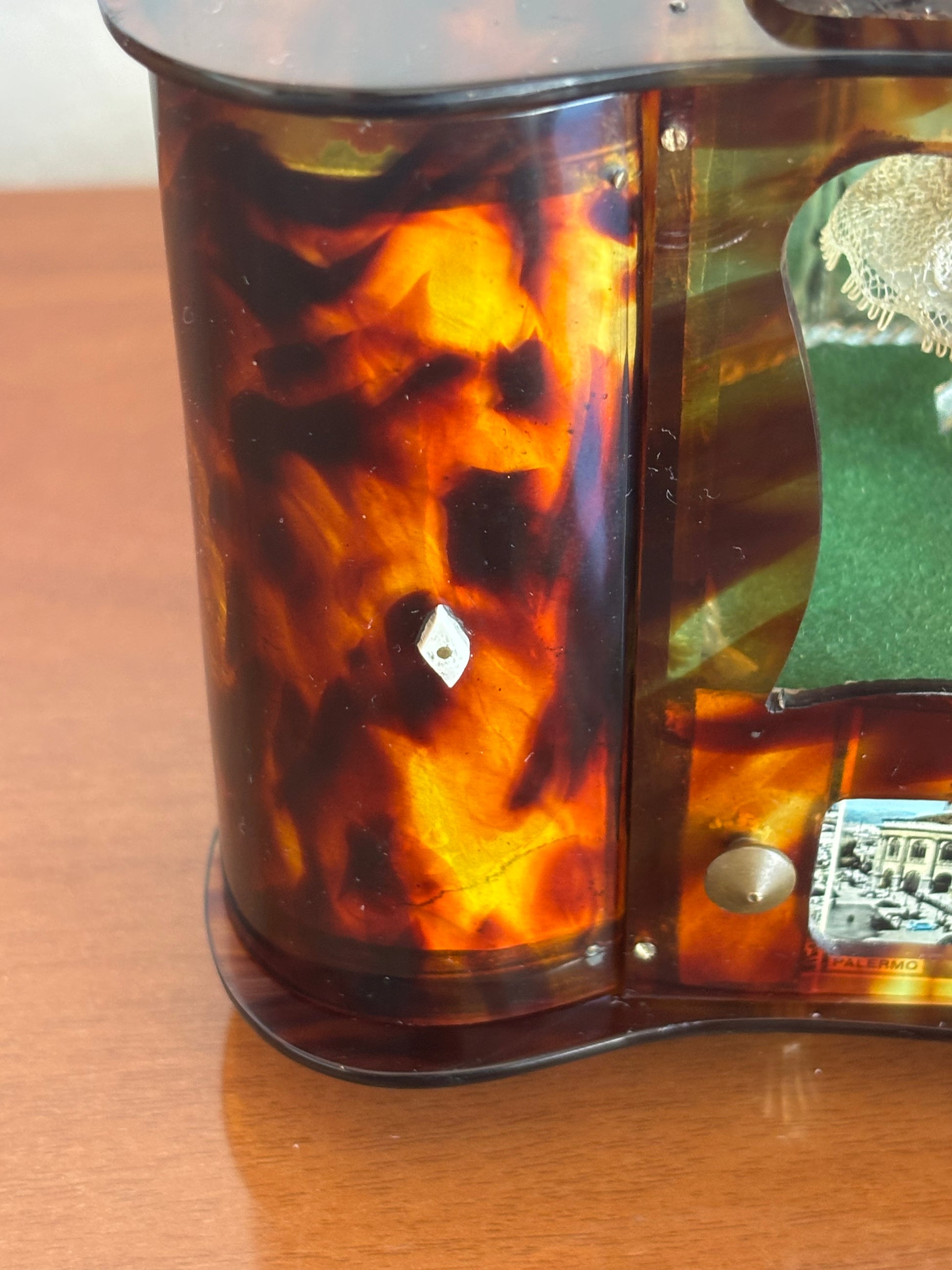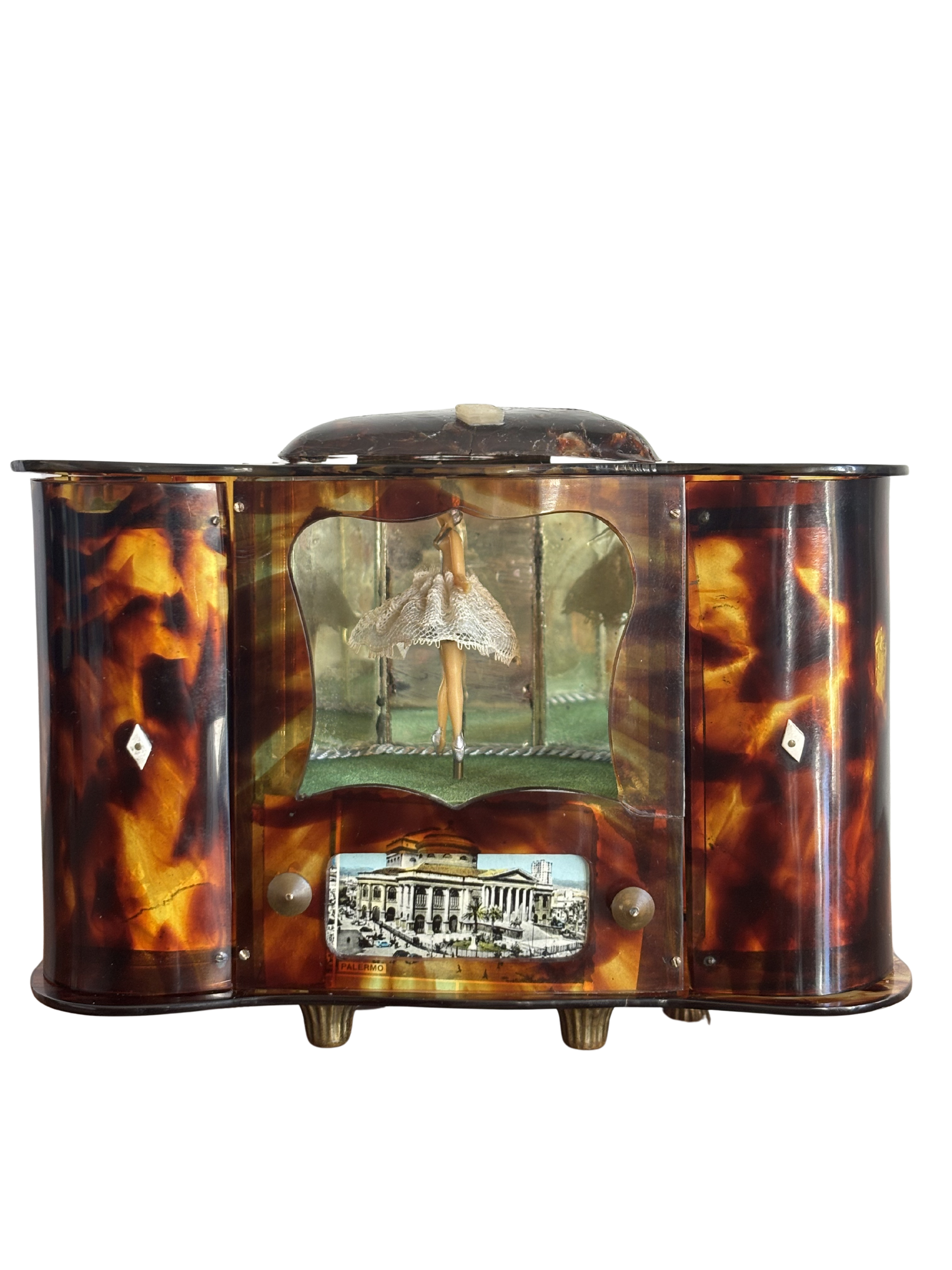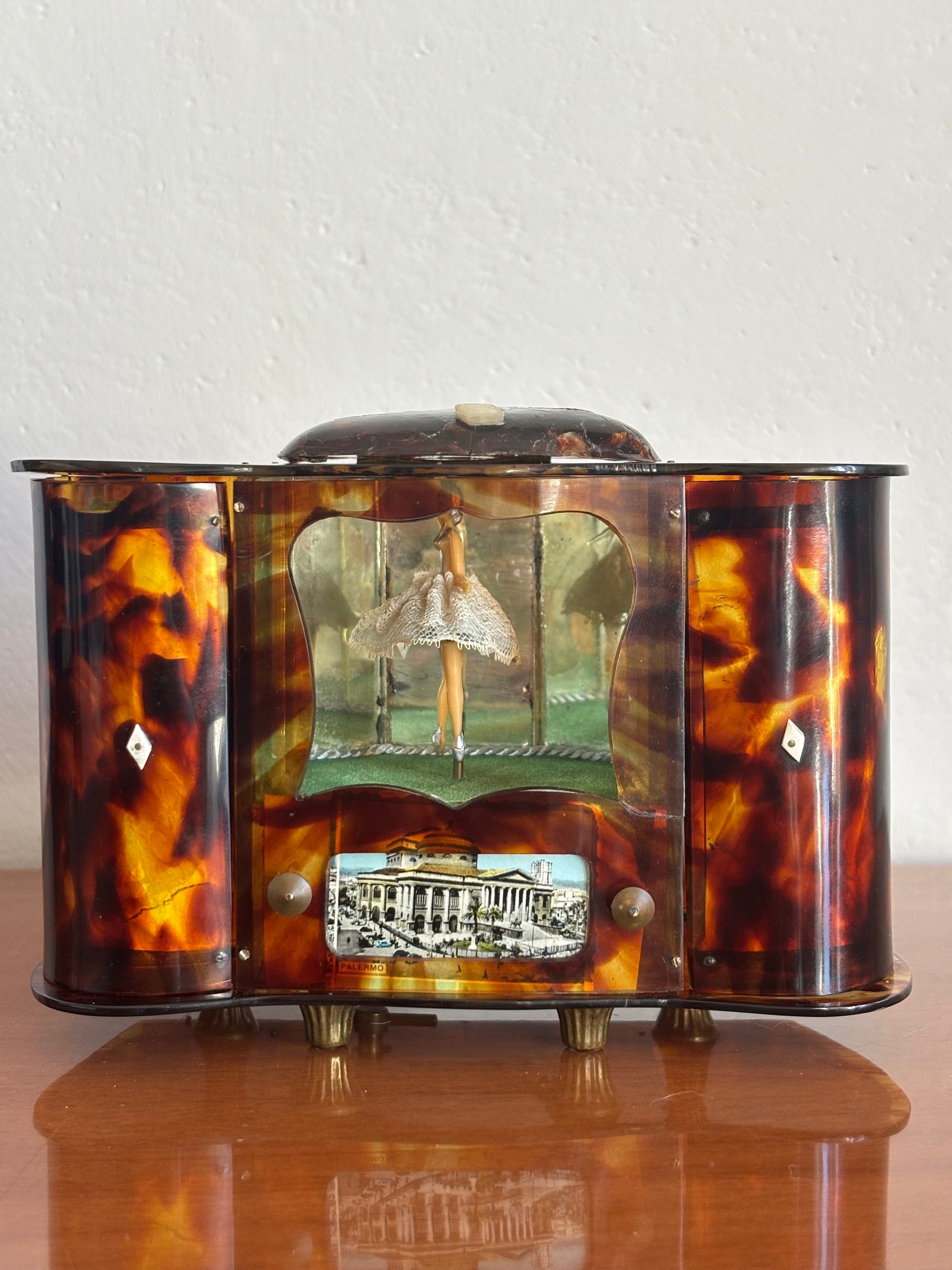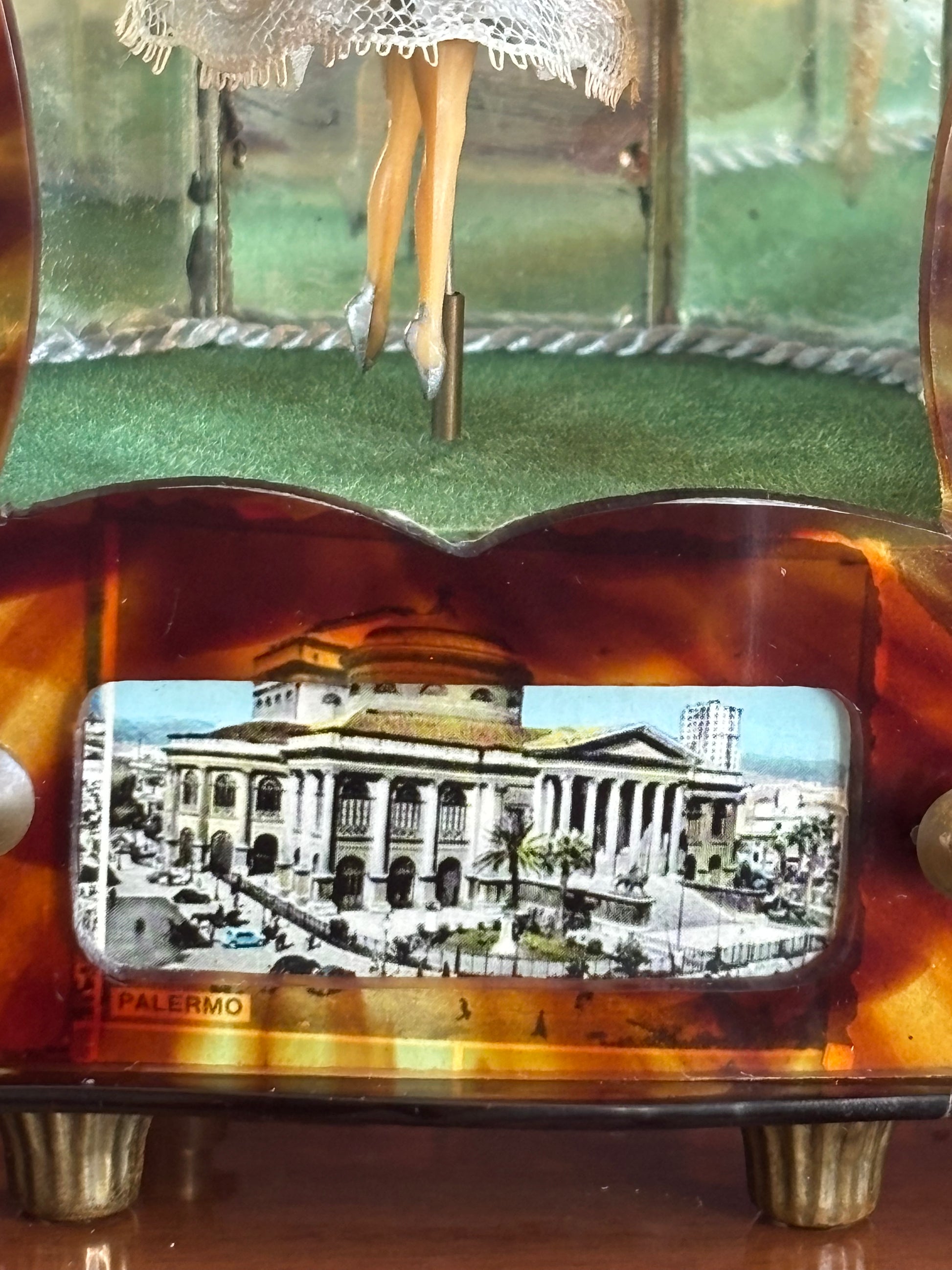 La struttura presenta una finitura effetto tartarugato con inserti decorativi e una piccola ballerina che si attiva ruotando una delle manopole centrali. All’interno, gli specchi e i pannelli riflettenti creano un’atmosfera scenografica, mentre nella parte inferiore è presente l’immagine del Teatro Massimo di Palermo, che ne fa un elegante souvenir siciliano.