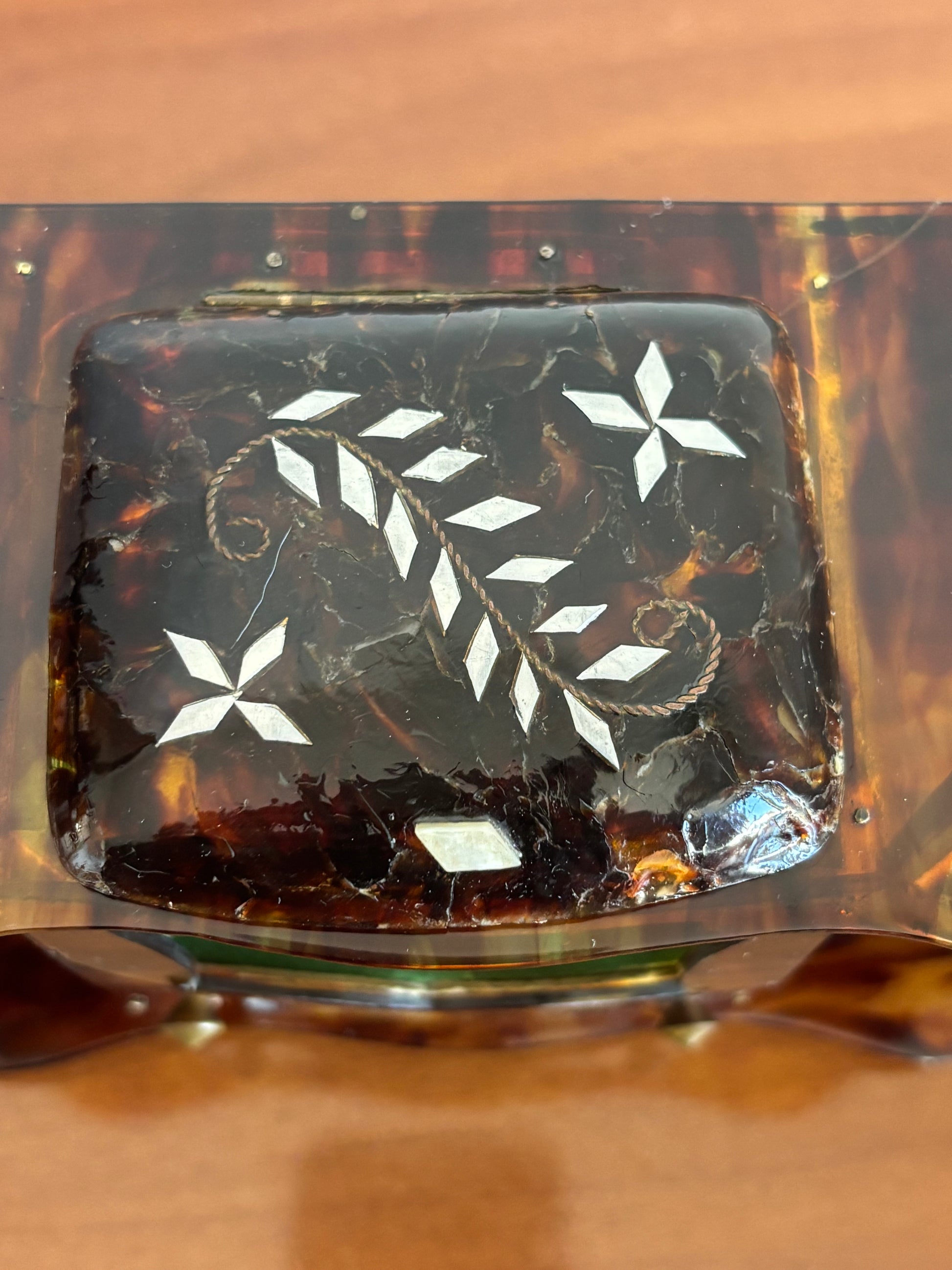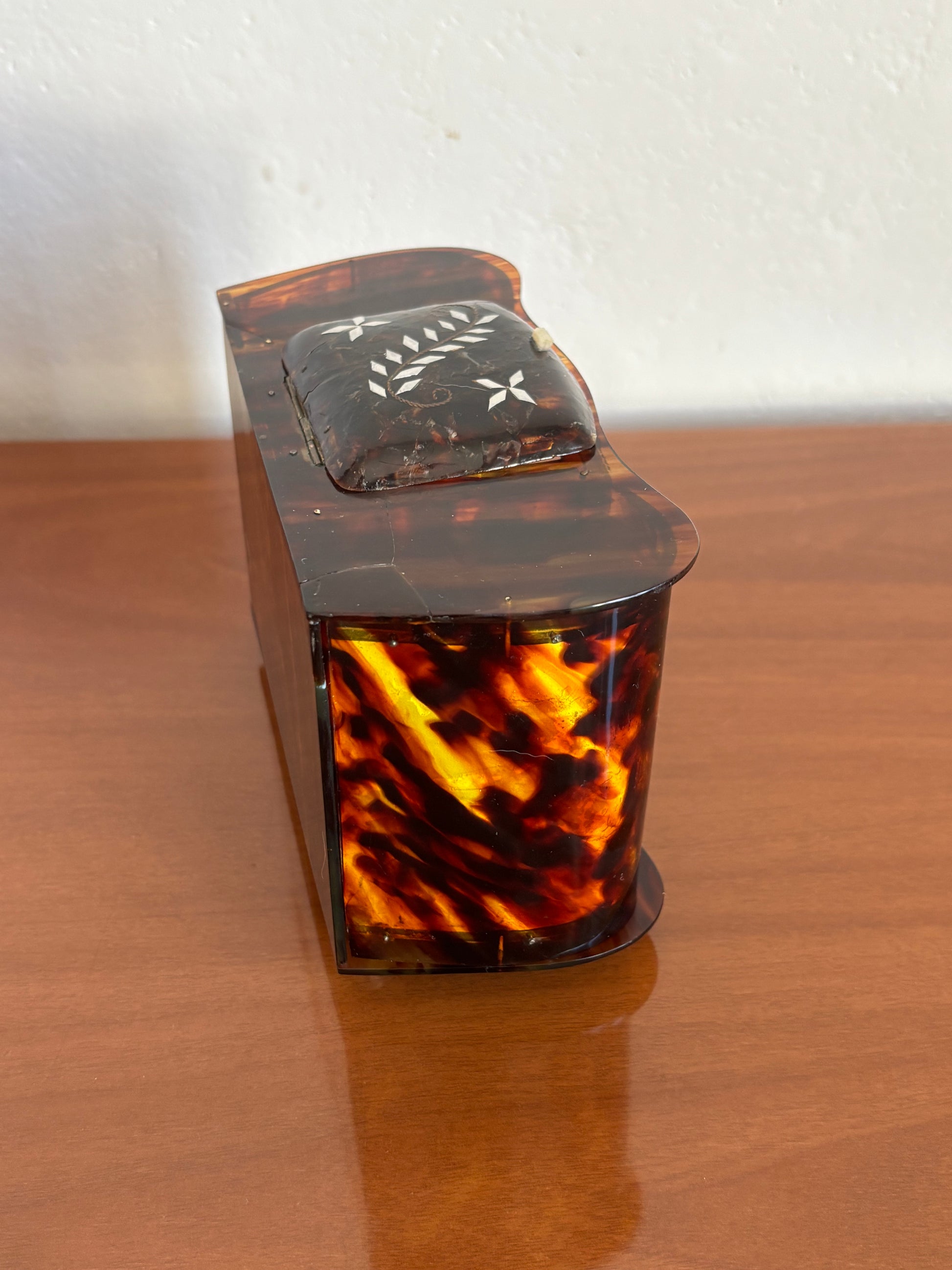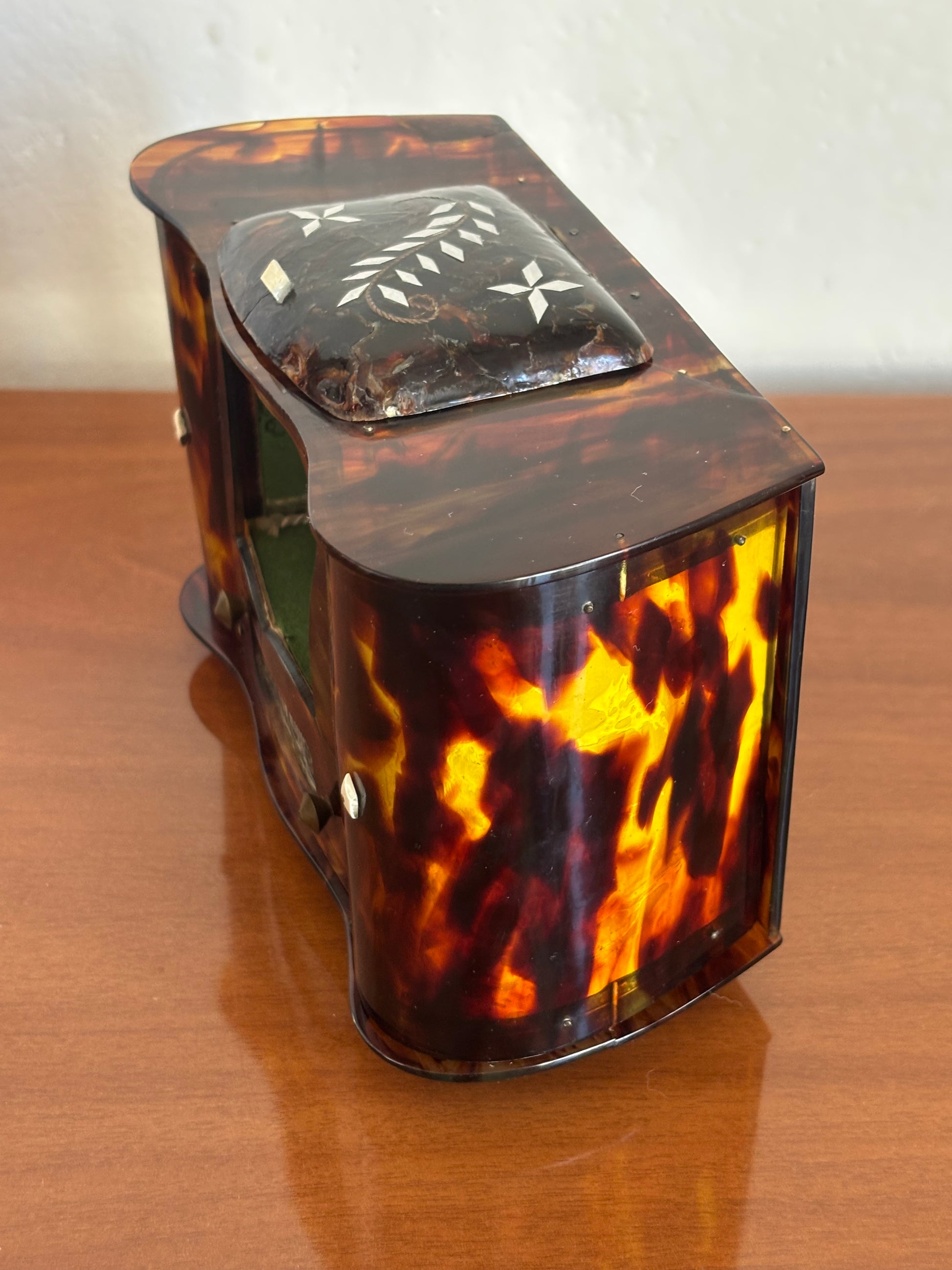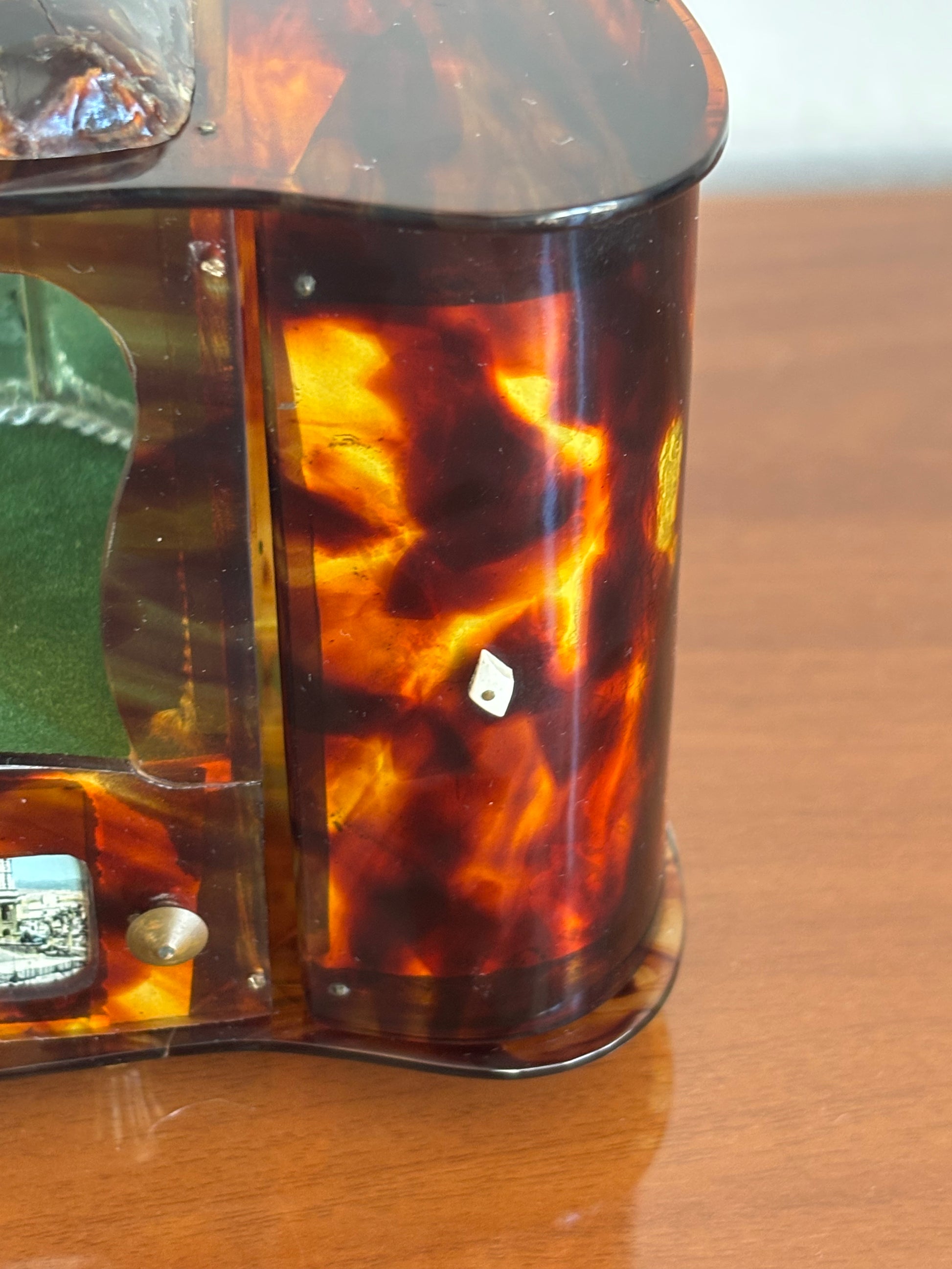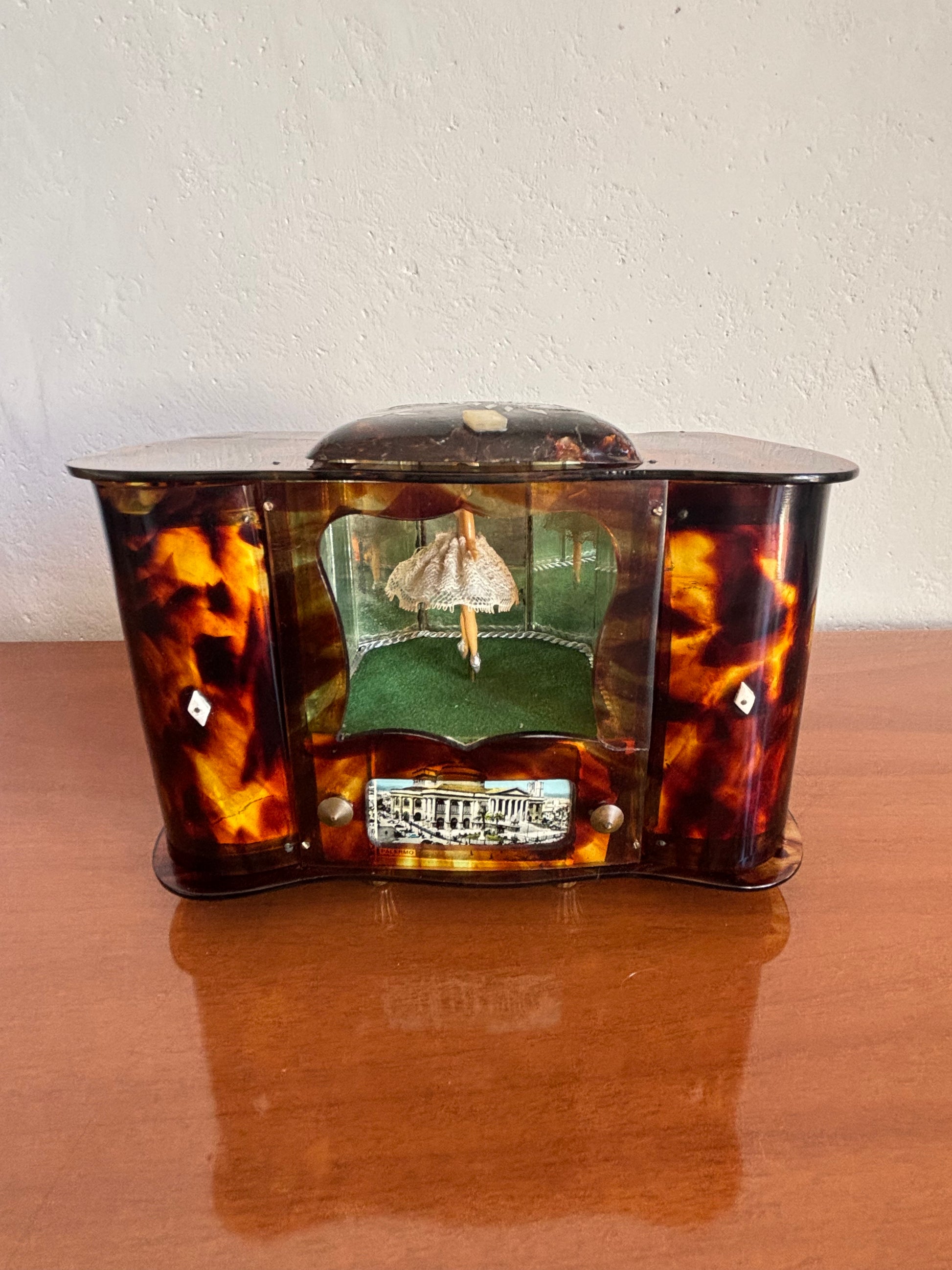 Questo raro portagioie della metà del ’900, con carillon funzionante, è un pezzo da collezione affascinante, caratterizzato dalla particolare forma a mobile bar e da un’estetica tipica degli oggetti souvenir dell’epoca.
