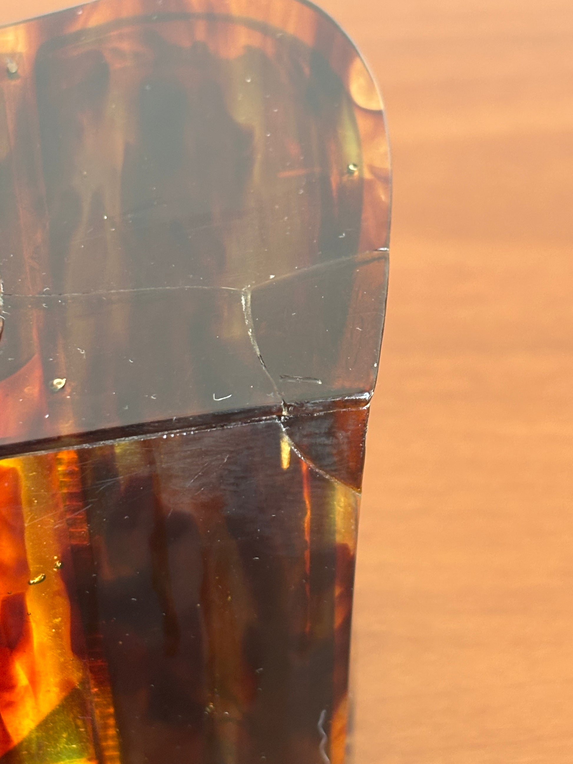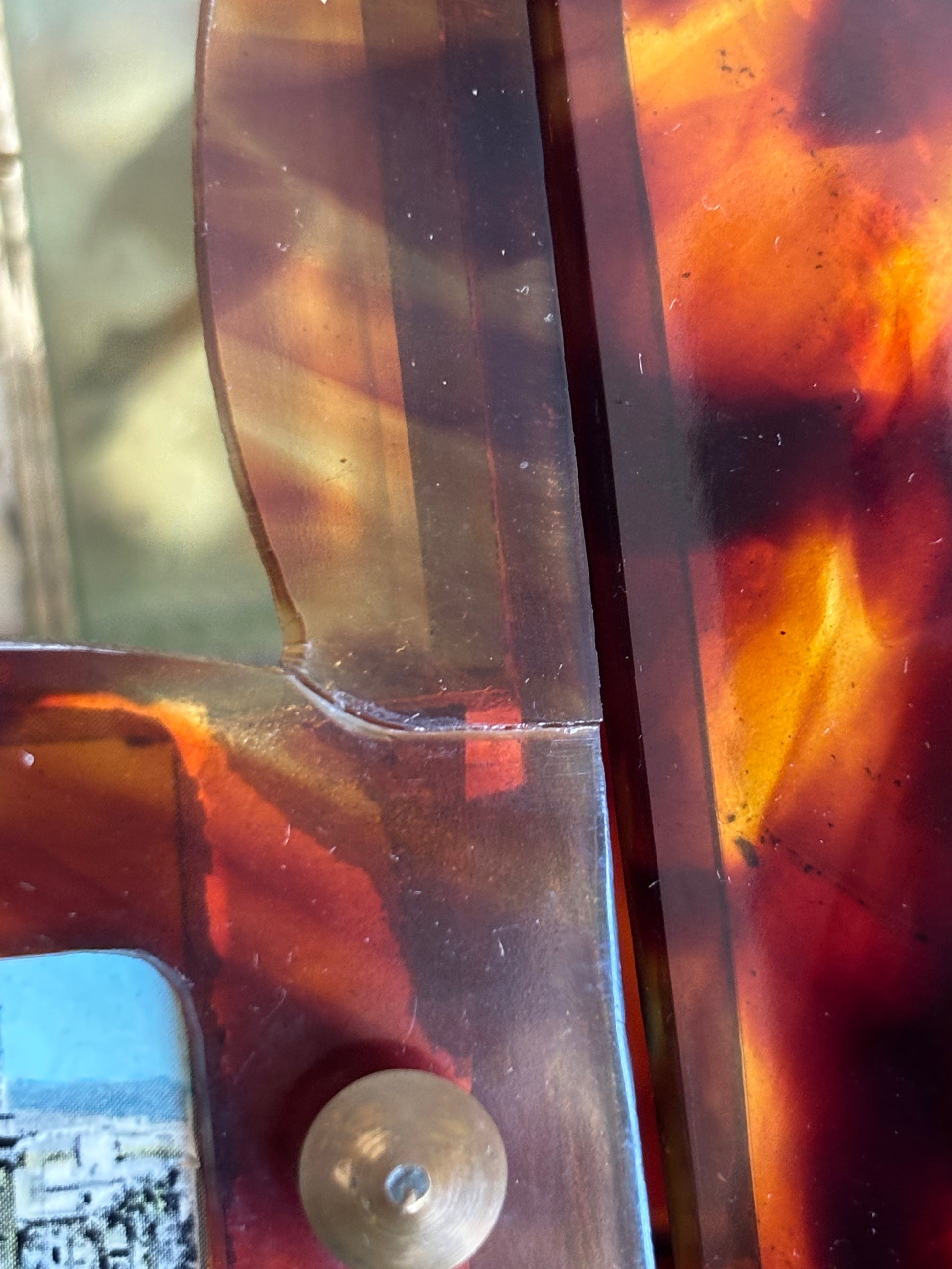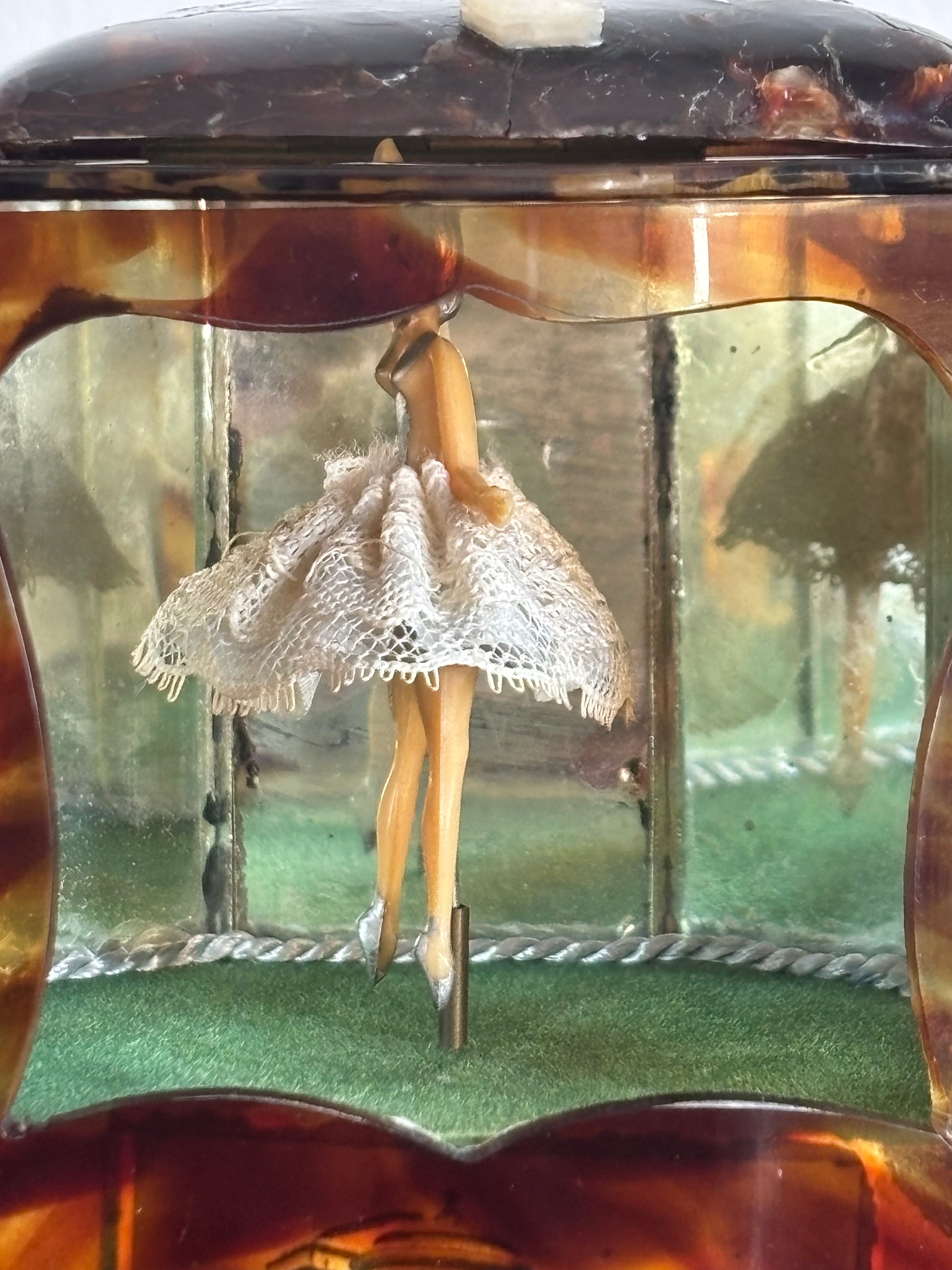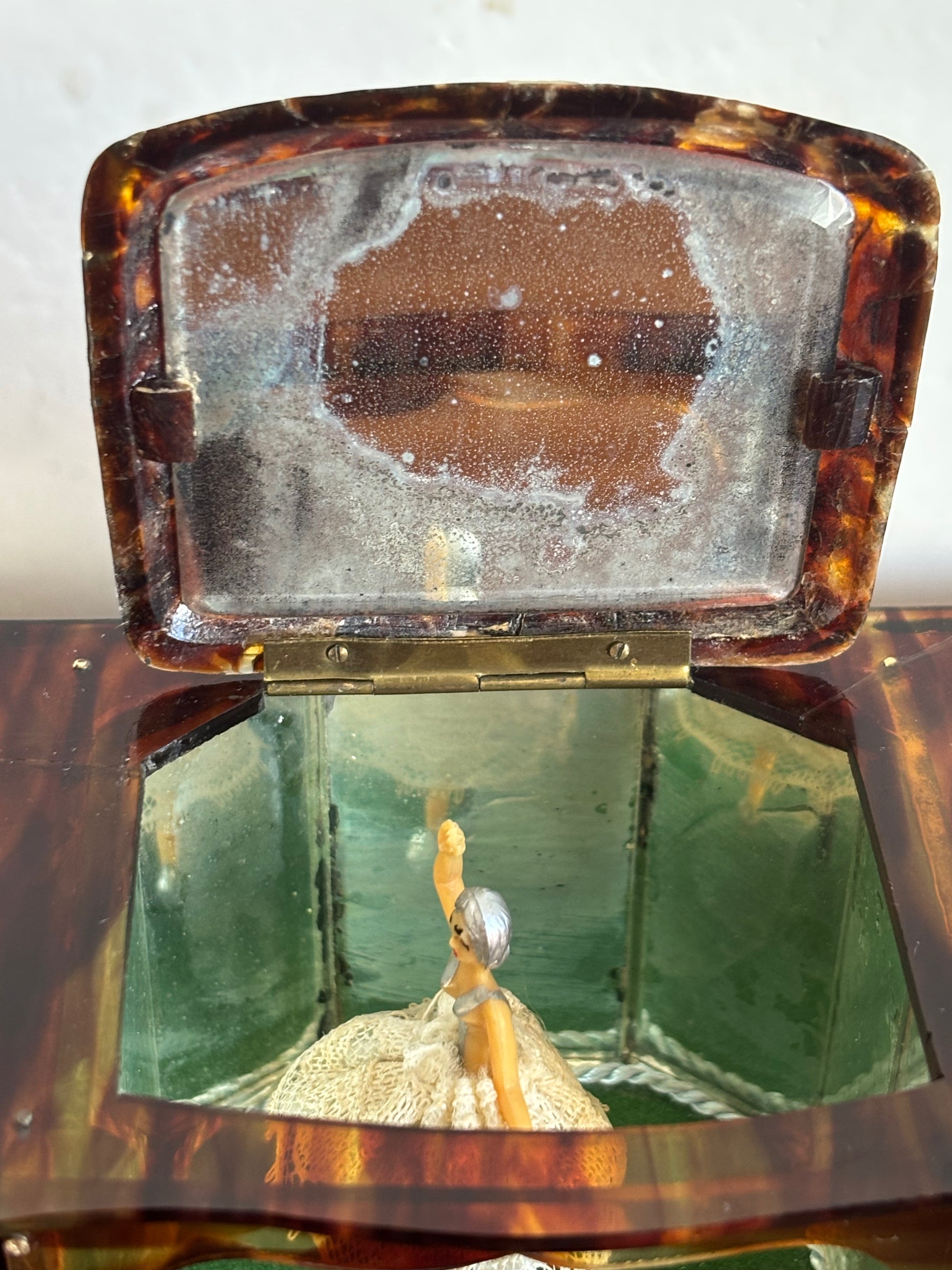Il portagioie mostra segni di usura dovuti al tempo, in particolare sugli specchi e sulla plastica, oltre a un intervento ricostruttivo su uno degli angoli, come si vede dalle fotografie. Nonostante ciò, l’insieme rimane solido, suggestivo e perfettamente funzionante dal punto di vista meccanico, con il carillon che accompagna la rotazione della ballerina con un movimento fluido e armonioso.