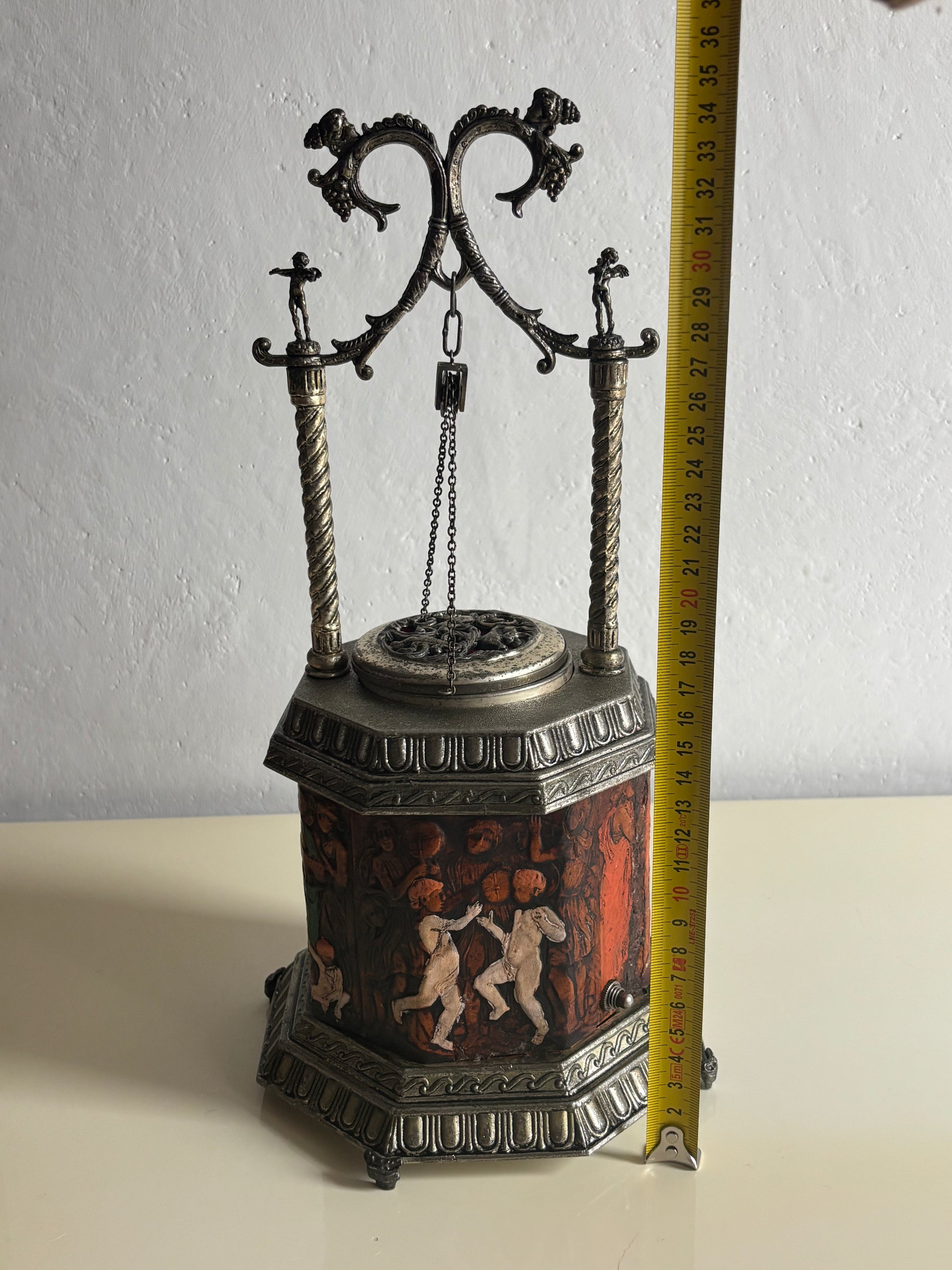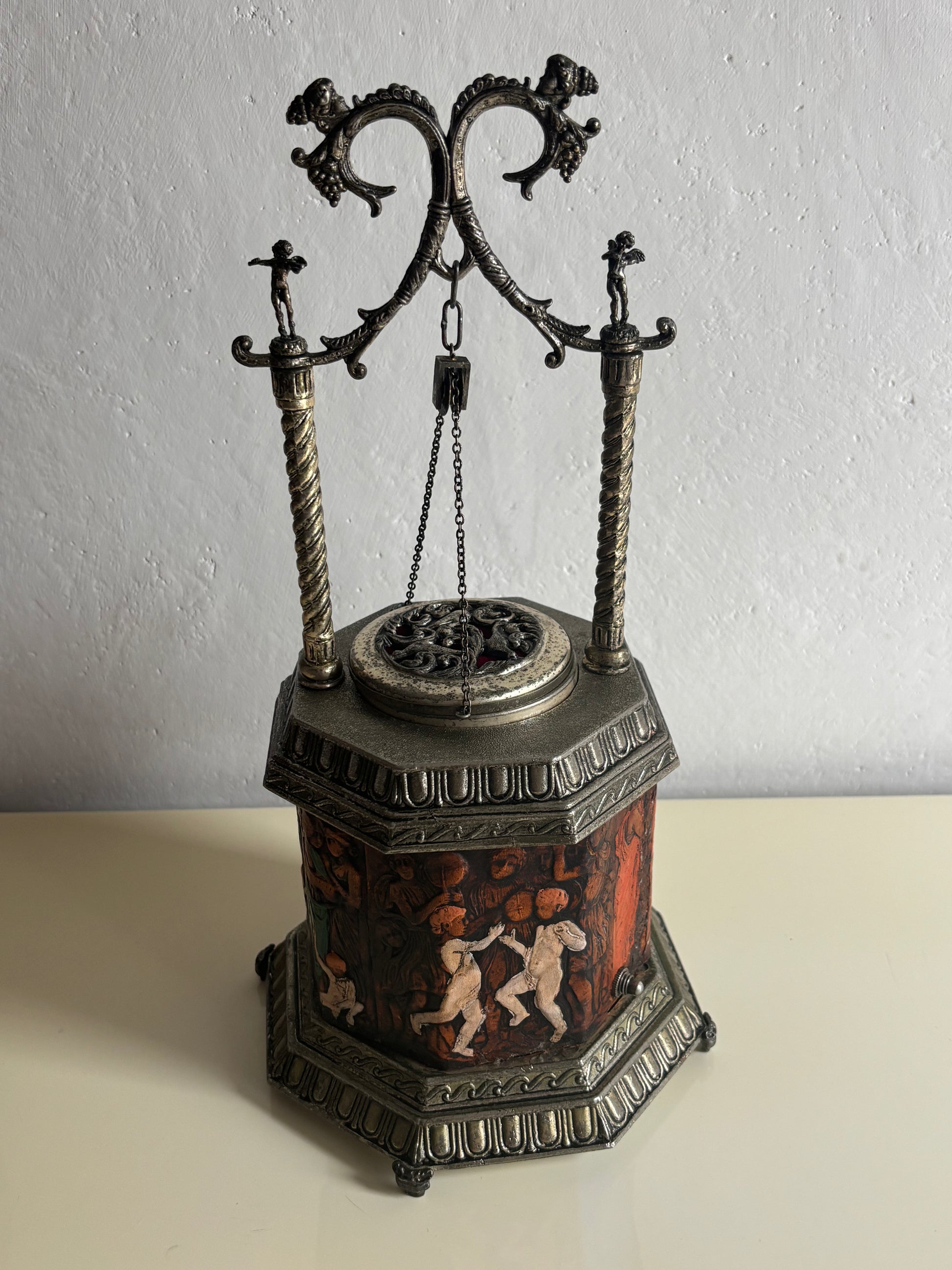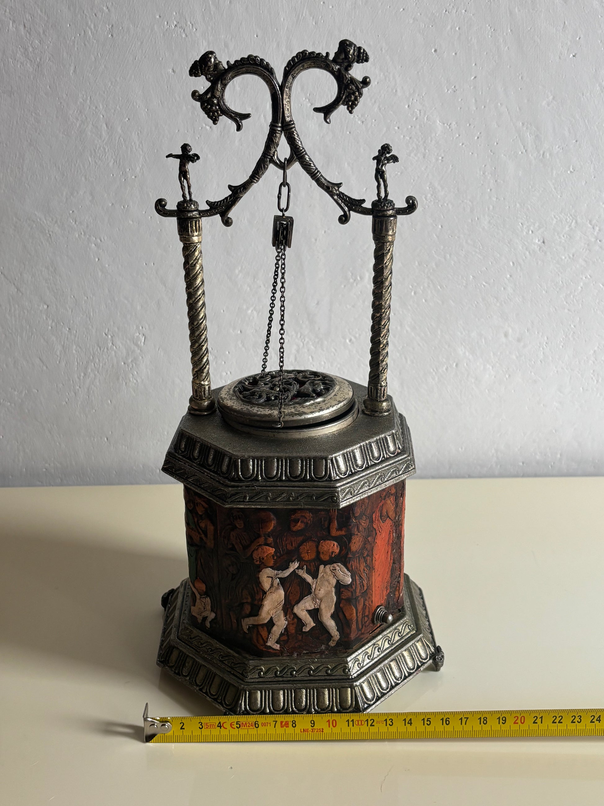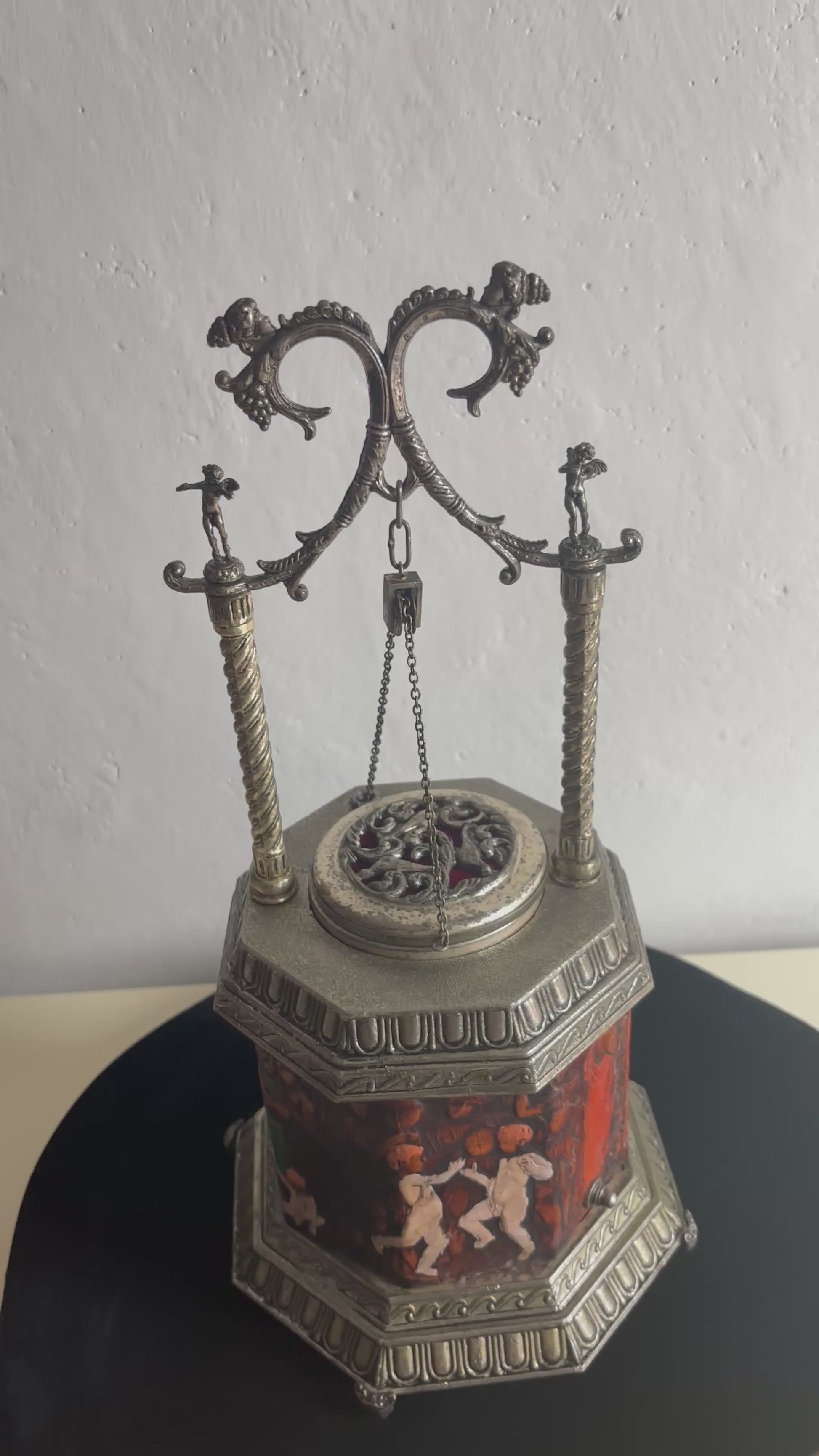 Il meccanismo a carillon è perfettamente funzionante e si attiva in sincronia con l’apertura del coperchio: premendo l’interruttore, il “pozzo” centrale si solleva rivelando il vano porta sigarette, accompagnato da una melodia delicata che aggiunge un tocco teatrale e nostalgico all’esperienza.