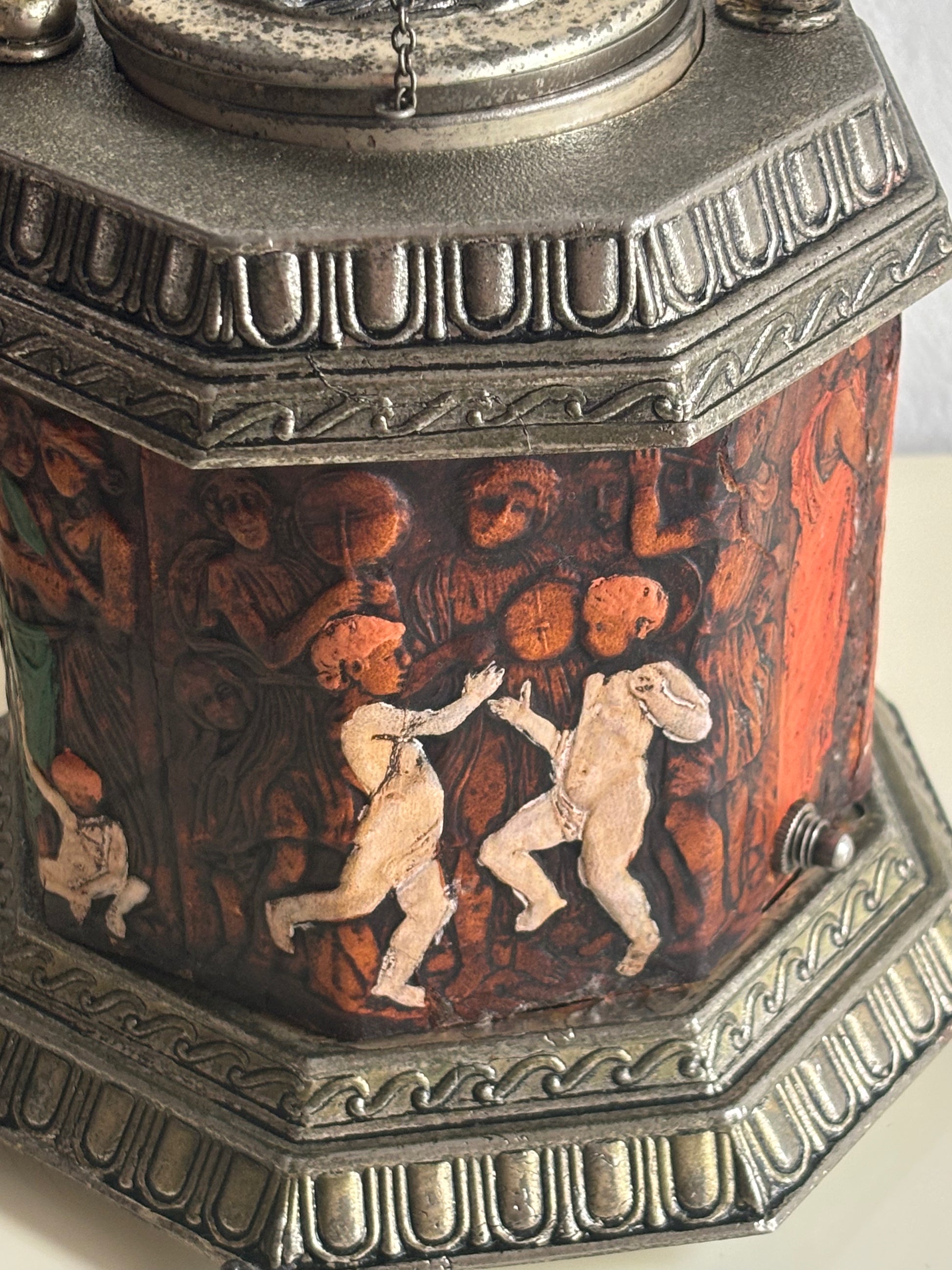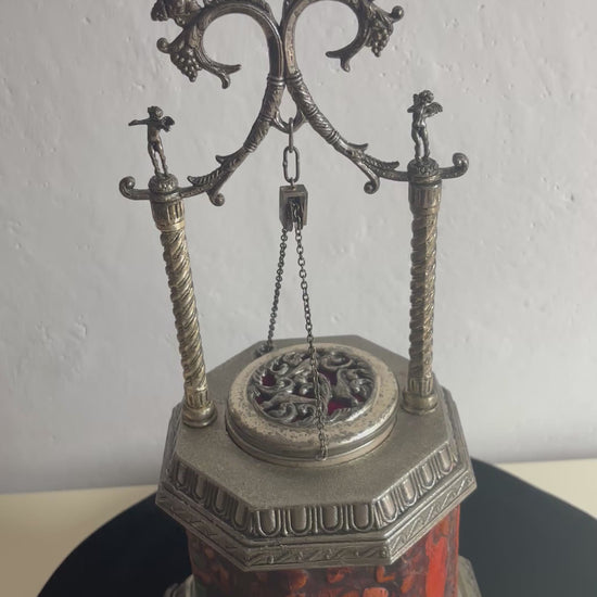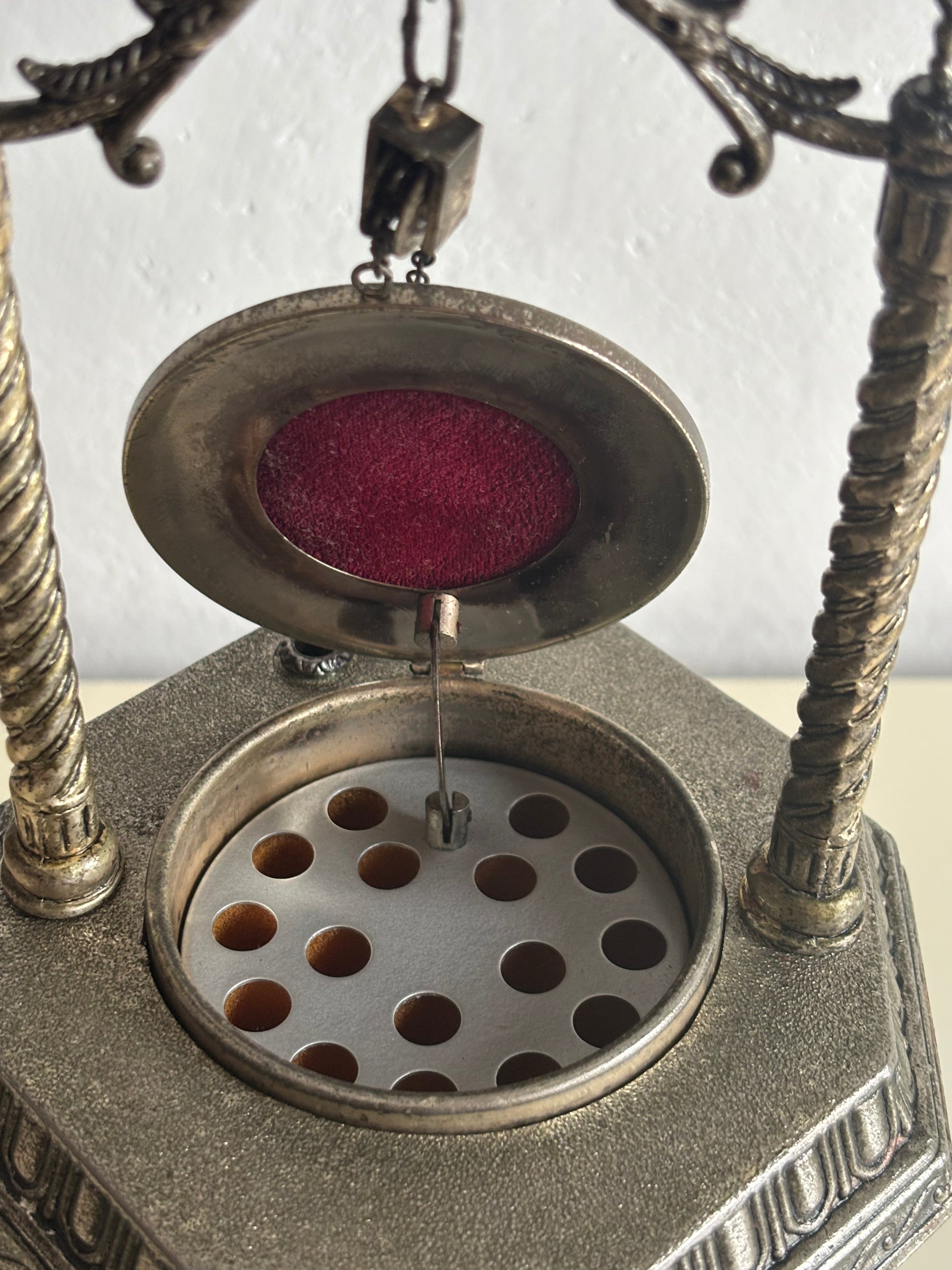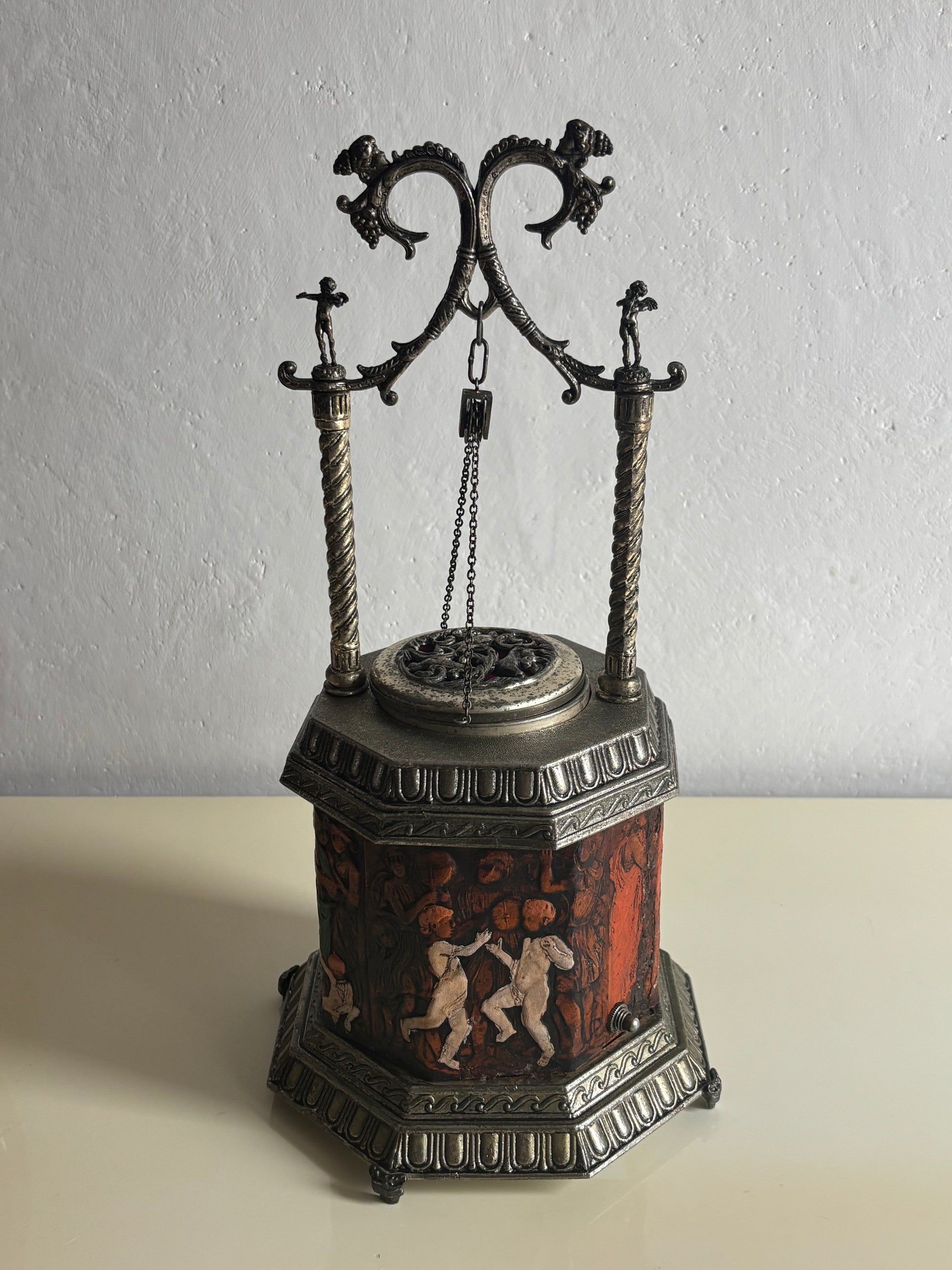 Il meccanismo a carillon è perfettamente funzionante e si attiva in sincronia con l’apertura del coperchio: premendo l’interruttore, il “pozzo” centrale si solleva rivelando il vano porta sigarette, accompagnato da una melodia delicata che aggiunge un tocco teatrale e nostalgico all’esperienza.
