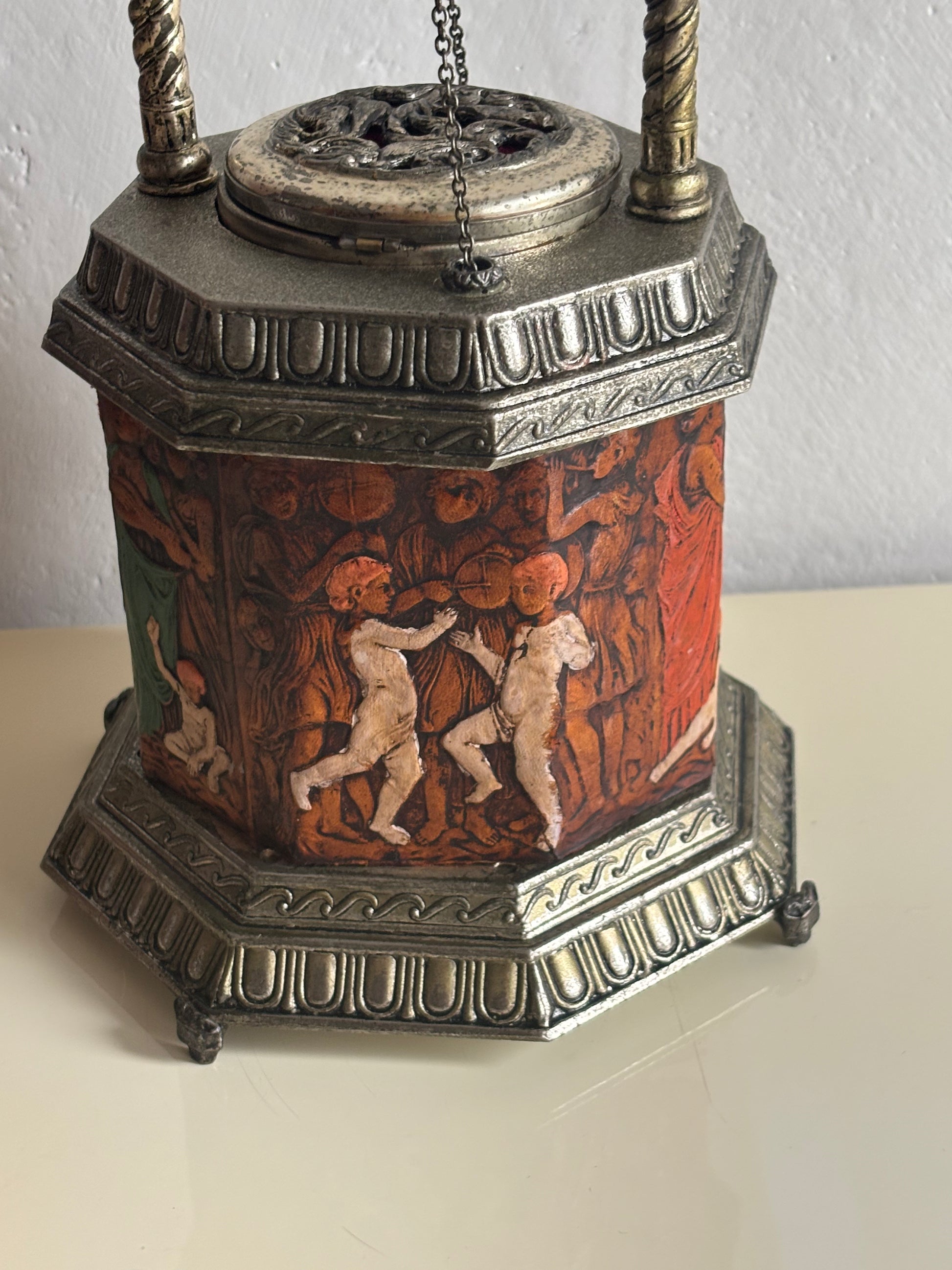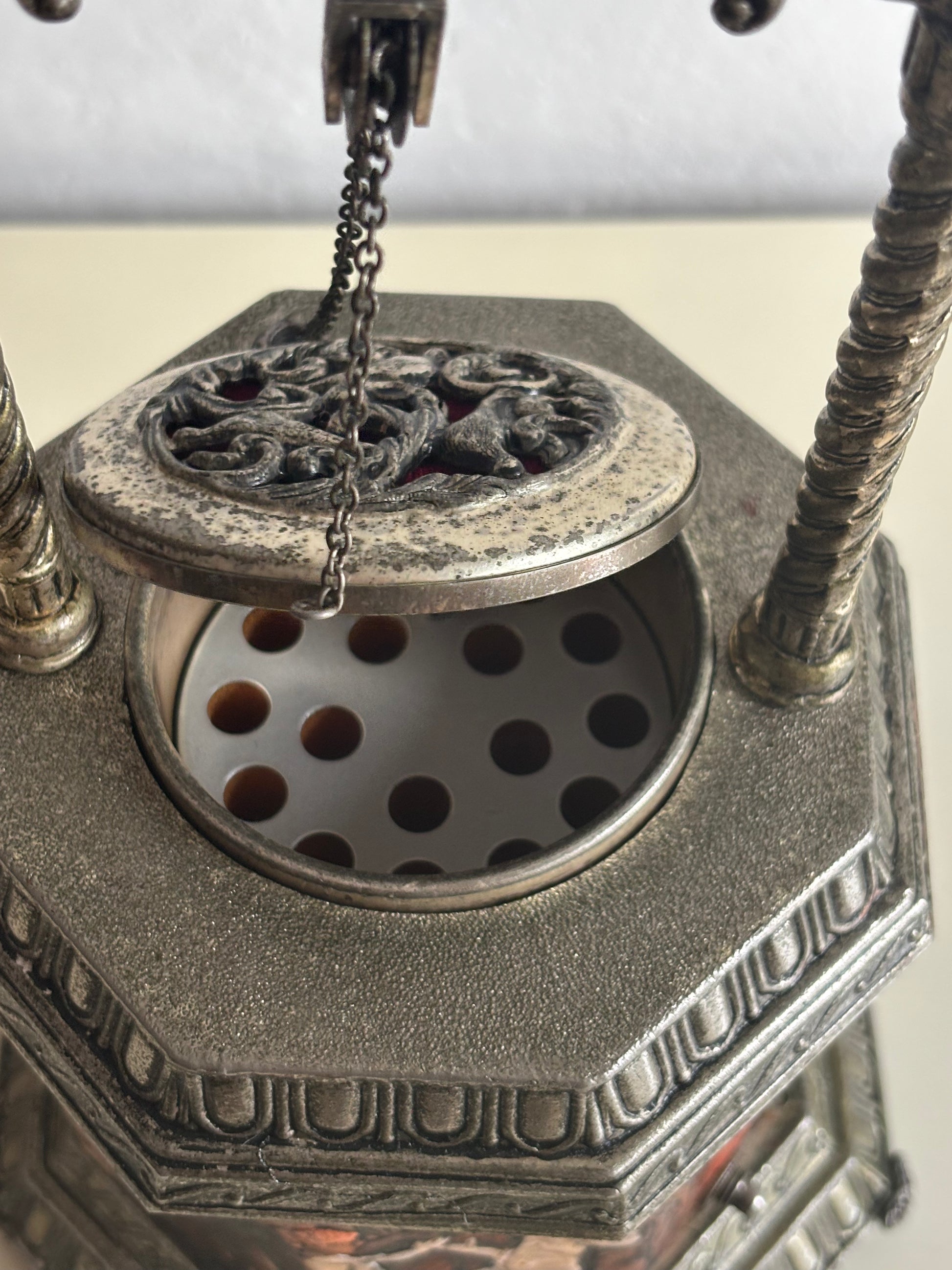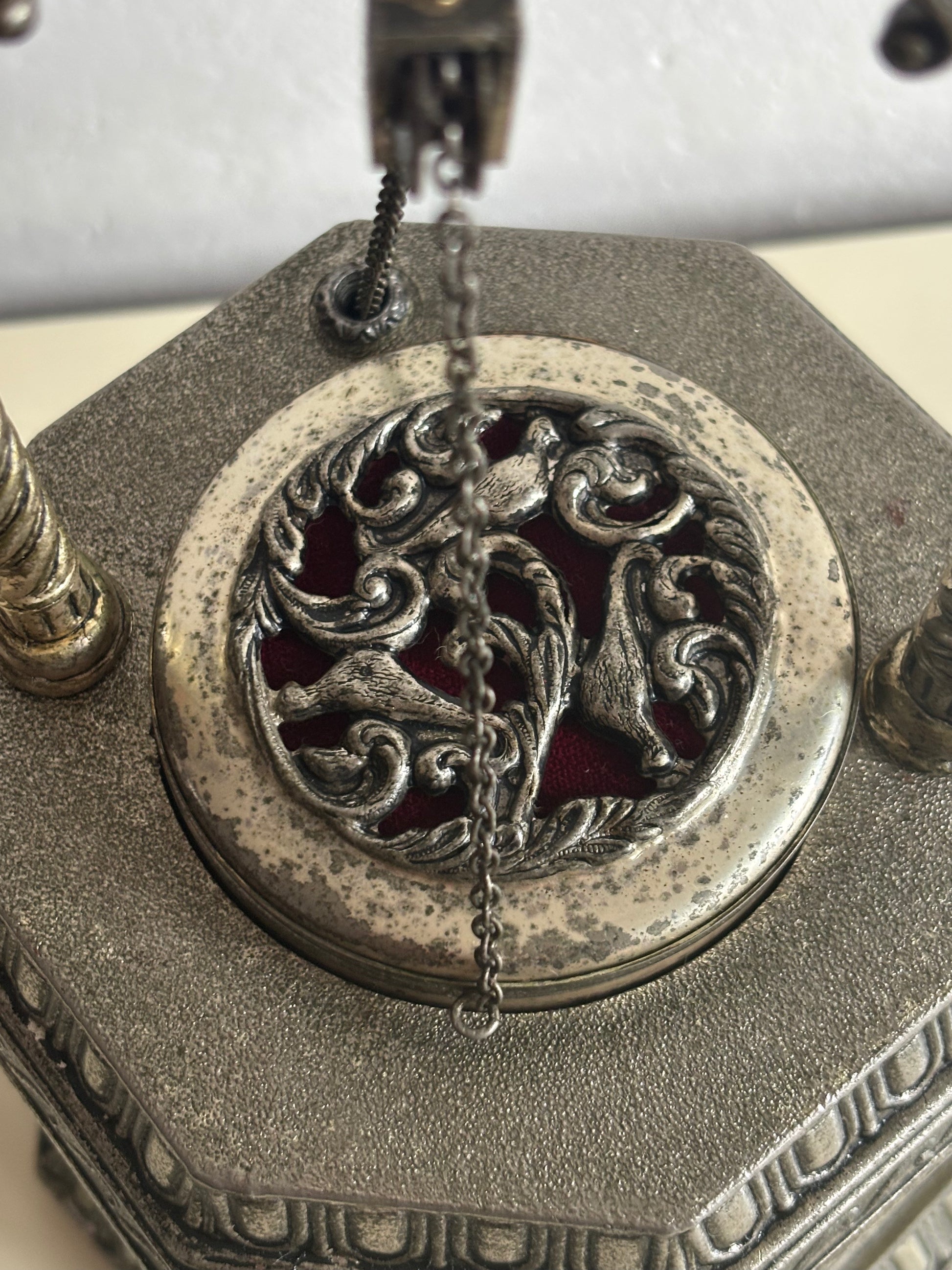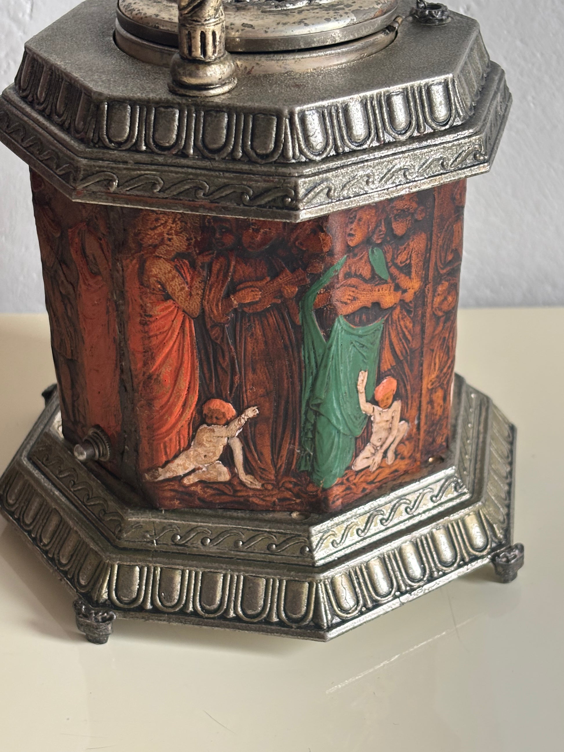 Il meccanismo a carillon è perfettamente funzionante e si attiva in sincronia con l’apertura del coperchio: premendo l’interruttore, il “pozzo” centrale si solleva rivelando il vano porta sigarette, accompagnato da una melodia delicata che aggiunge un tocco teatrale e nostalgico all’esperienza.