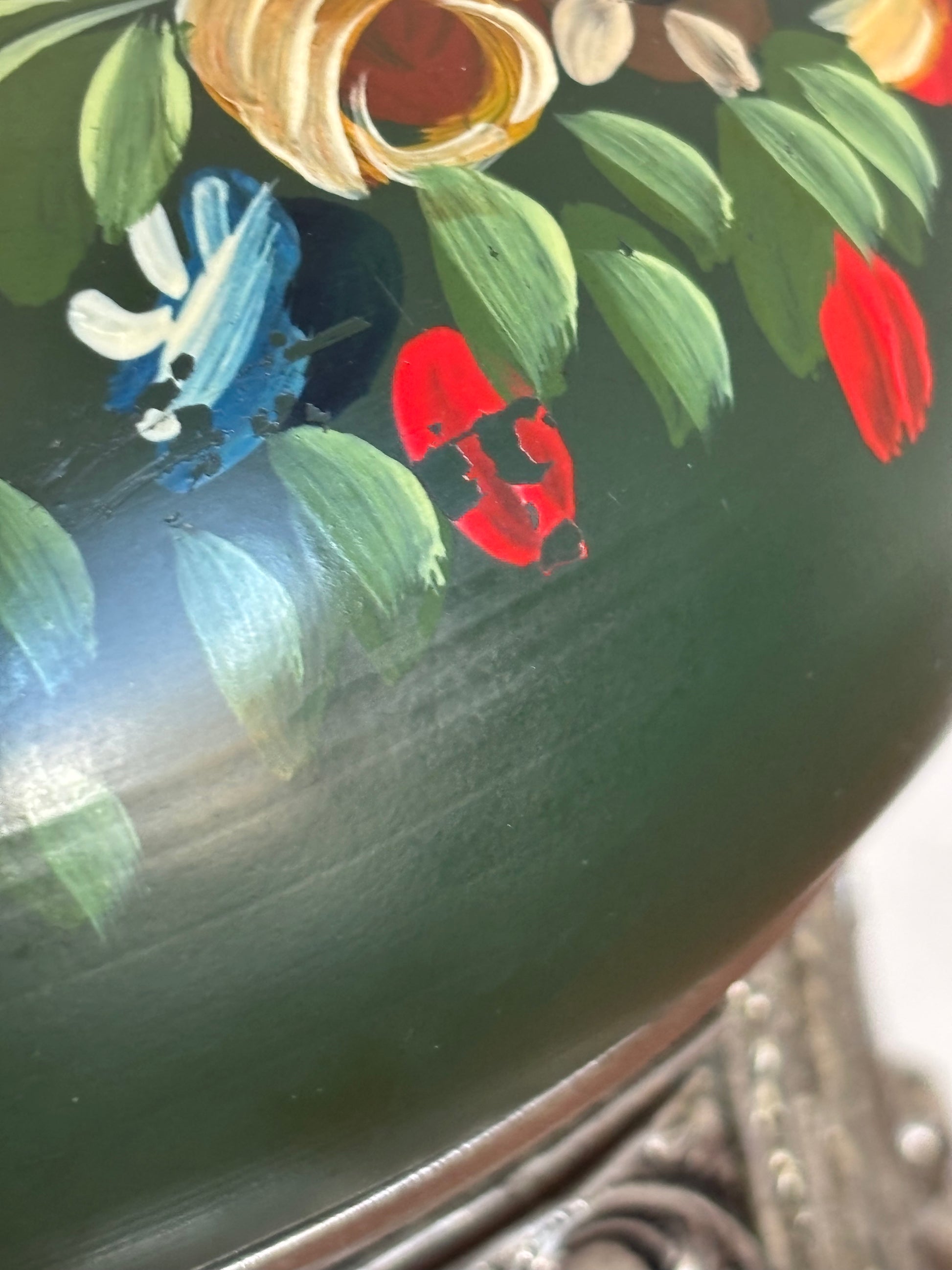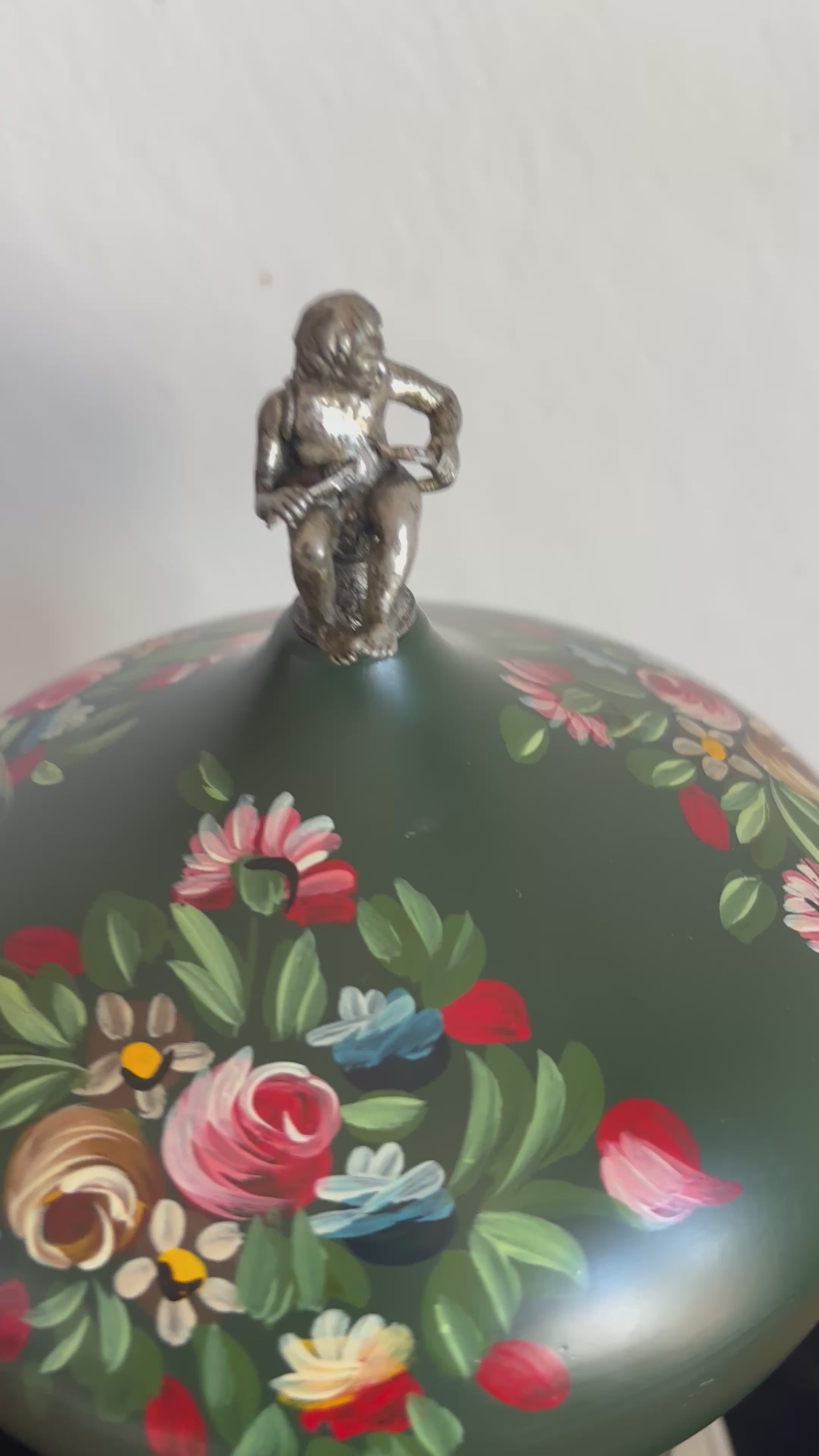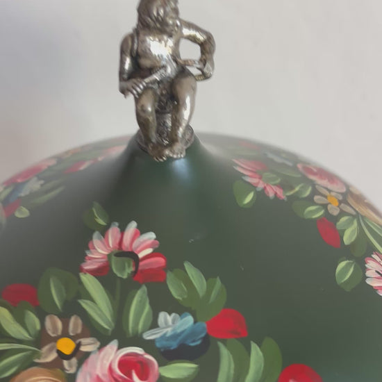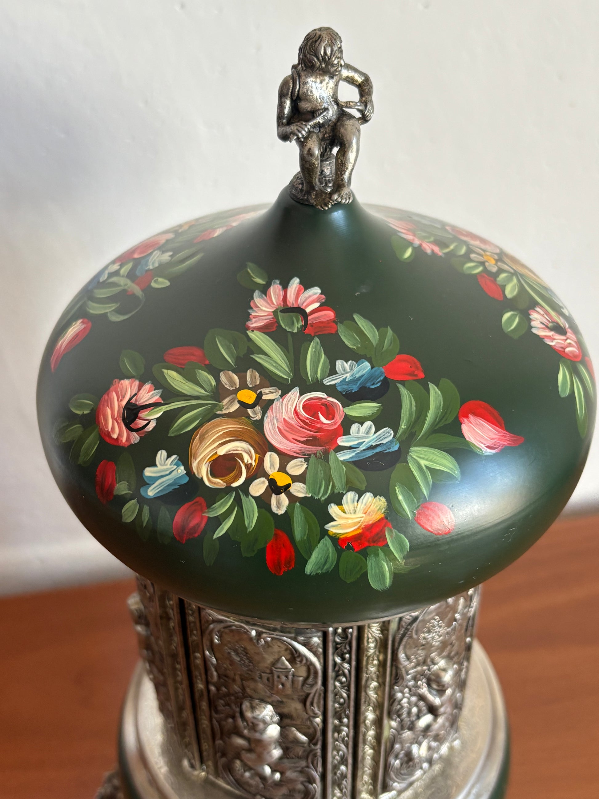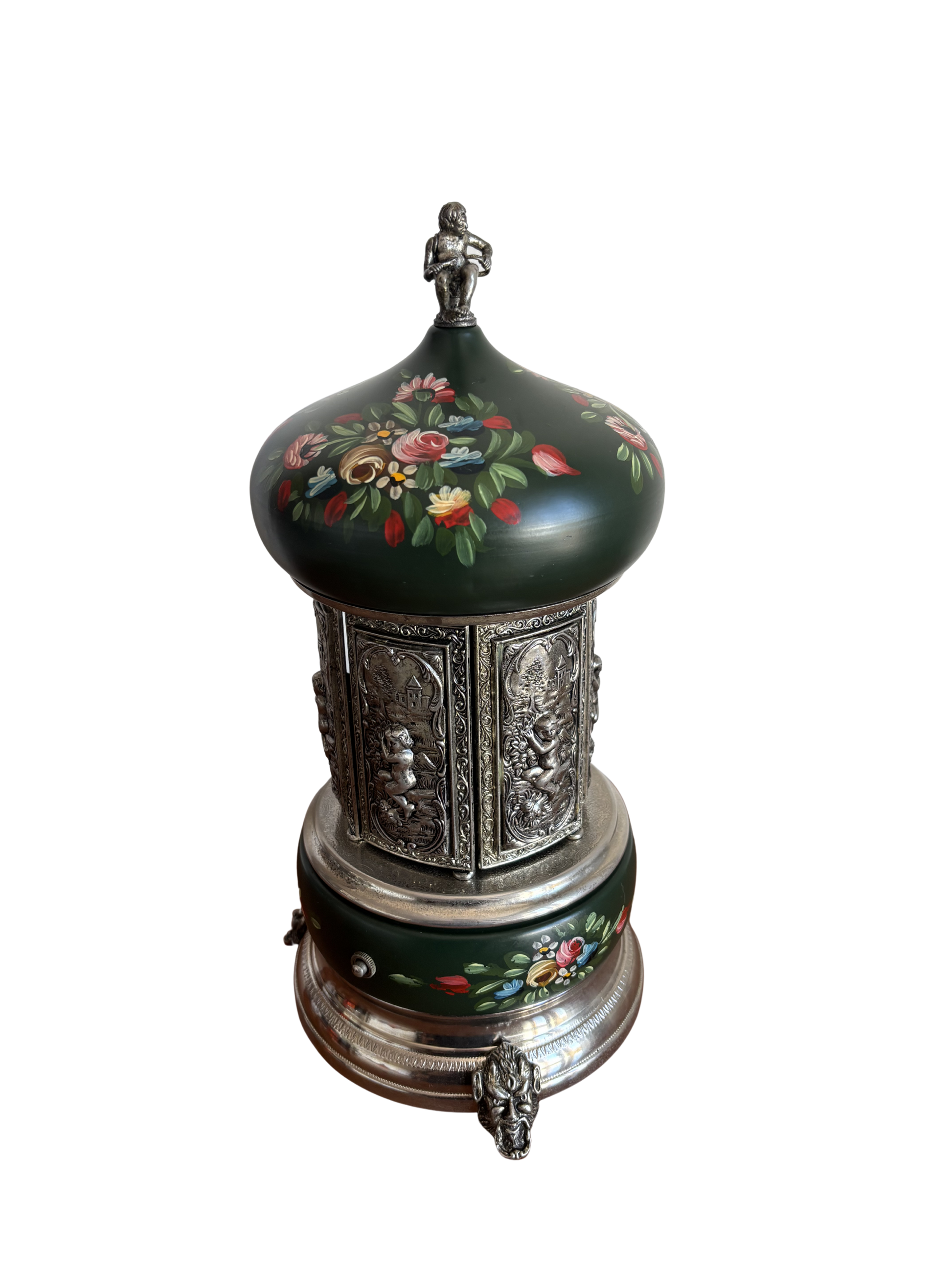 Realizzato in metallo, presenta pannelli finemente lavorati con scene figurative in rilievo e una cupola superiore impreziosita da un piccolo elemento scultoreo. Le decorazioni floreali dipinte a mano aggiungono un tocco di colore e artigianalità, creando un contrasto armonioso con la struttura metallica.
