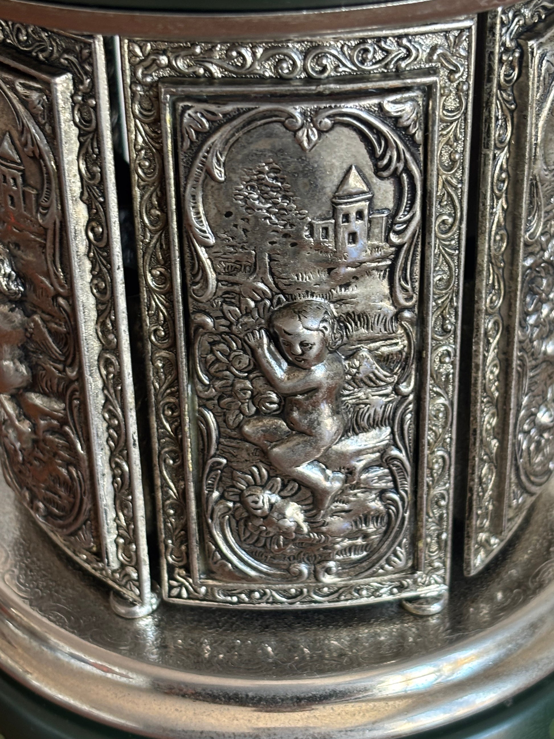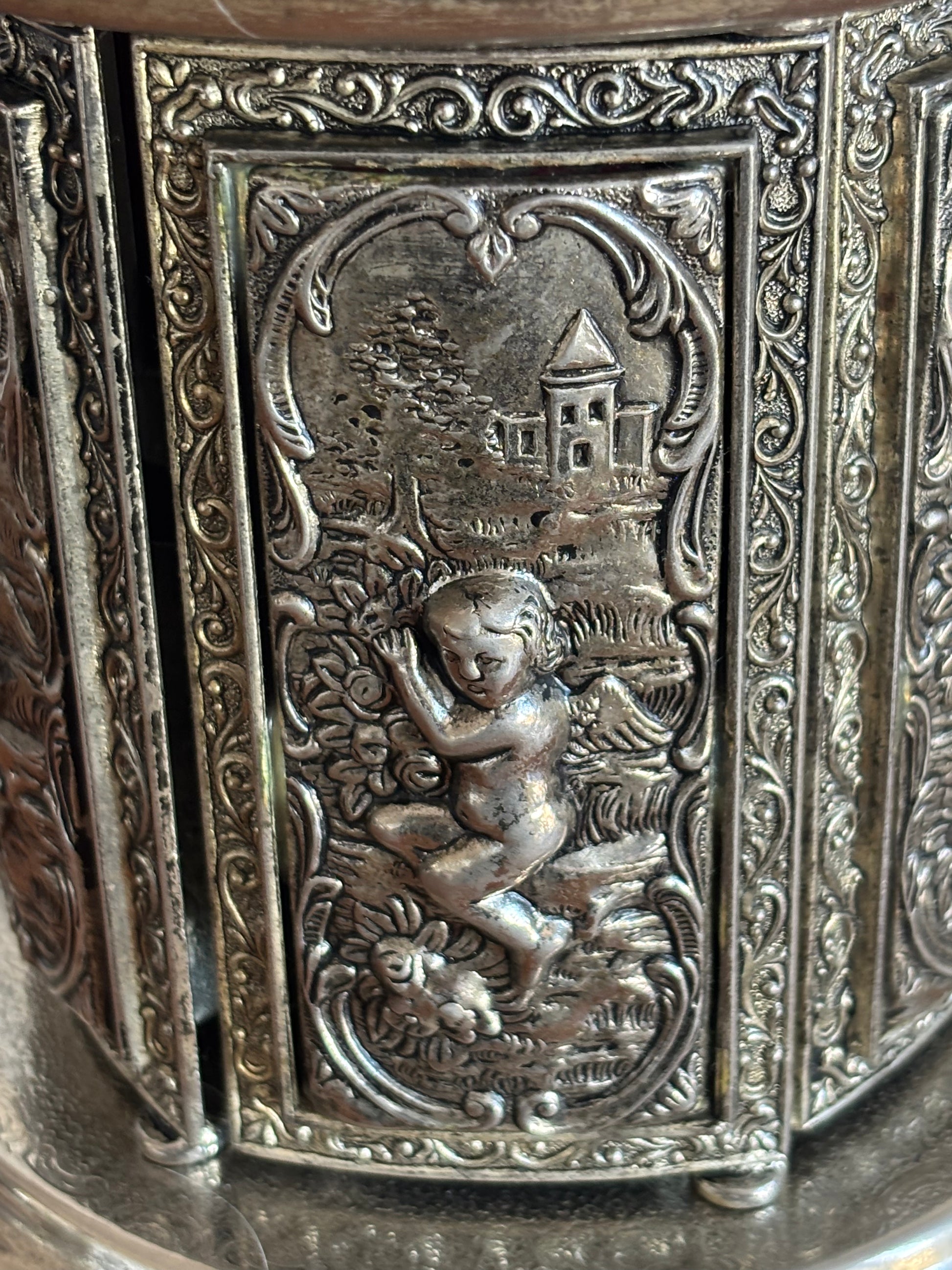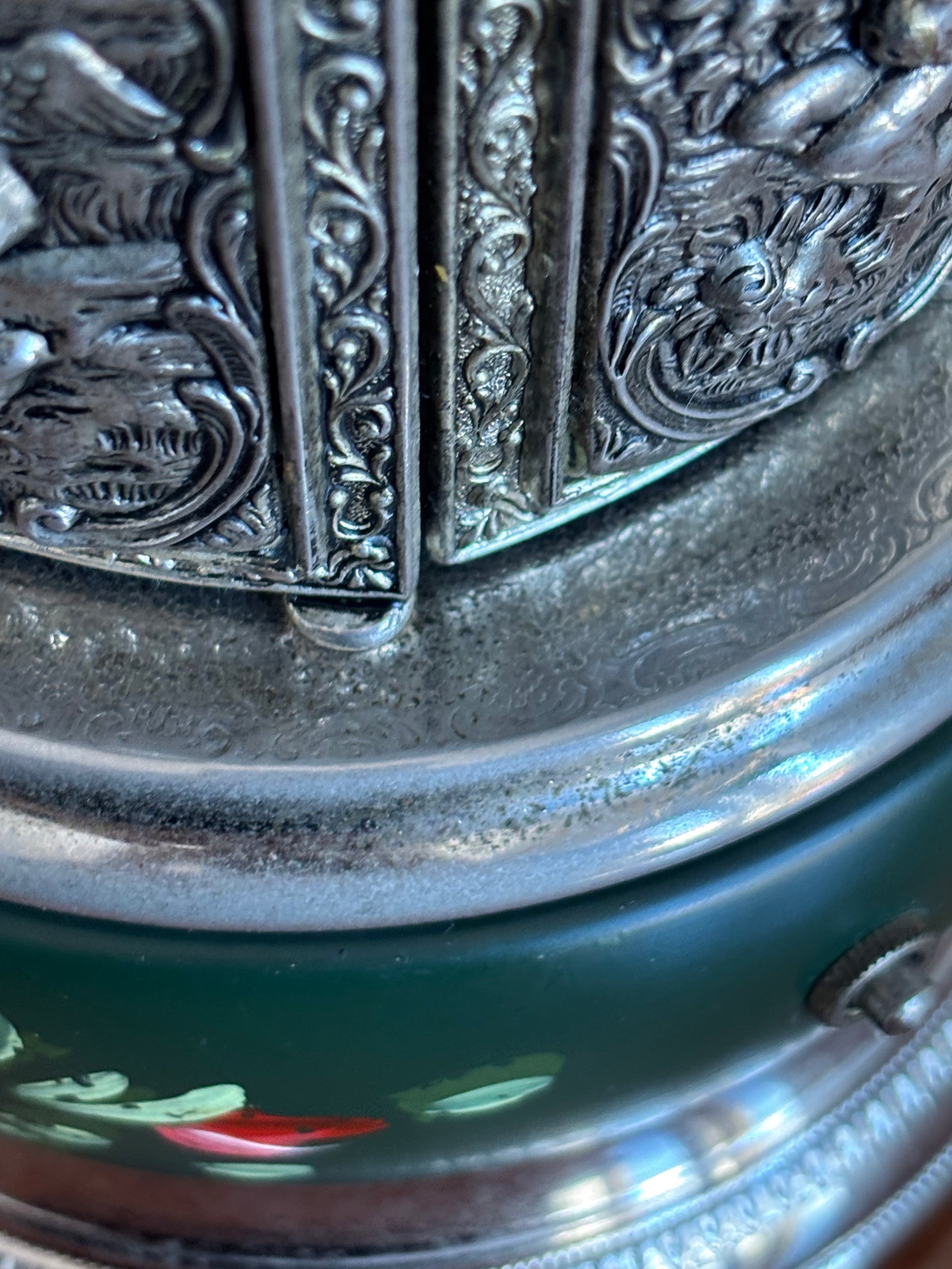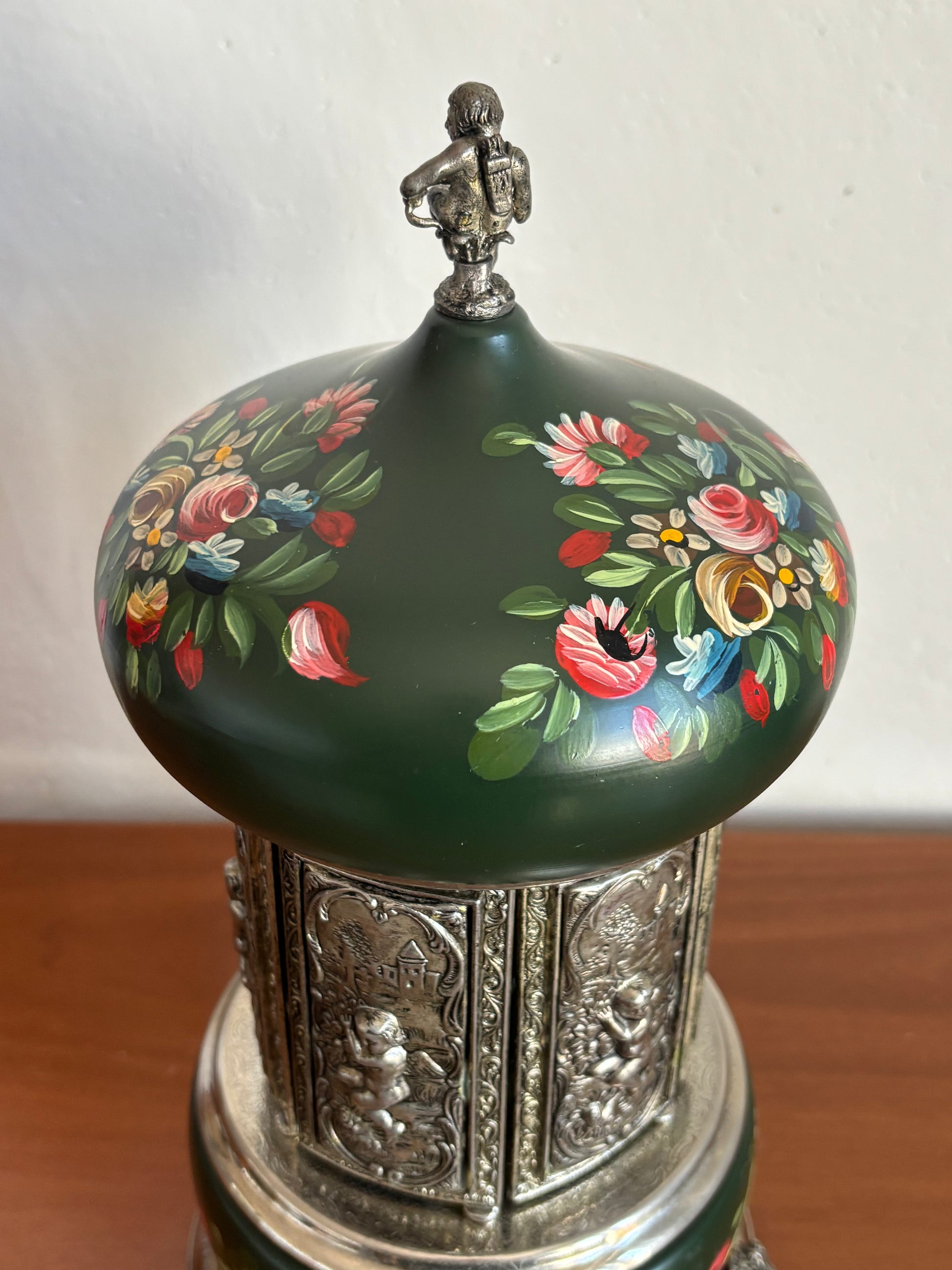 Realizzato in metallo, presenta pannelli finemente lavorati con scene figurative in rilievo e una cupola superiore impreziosita da un piccolo elemento scultoreo. Le decorazioni floreali dipinte a mano aggiungono un tocco di colore e artigianalità, creando un contrasto armonioso con la struttura metallica.