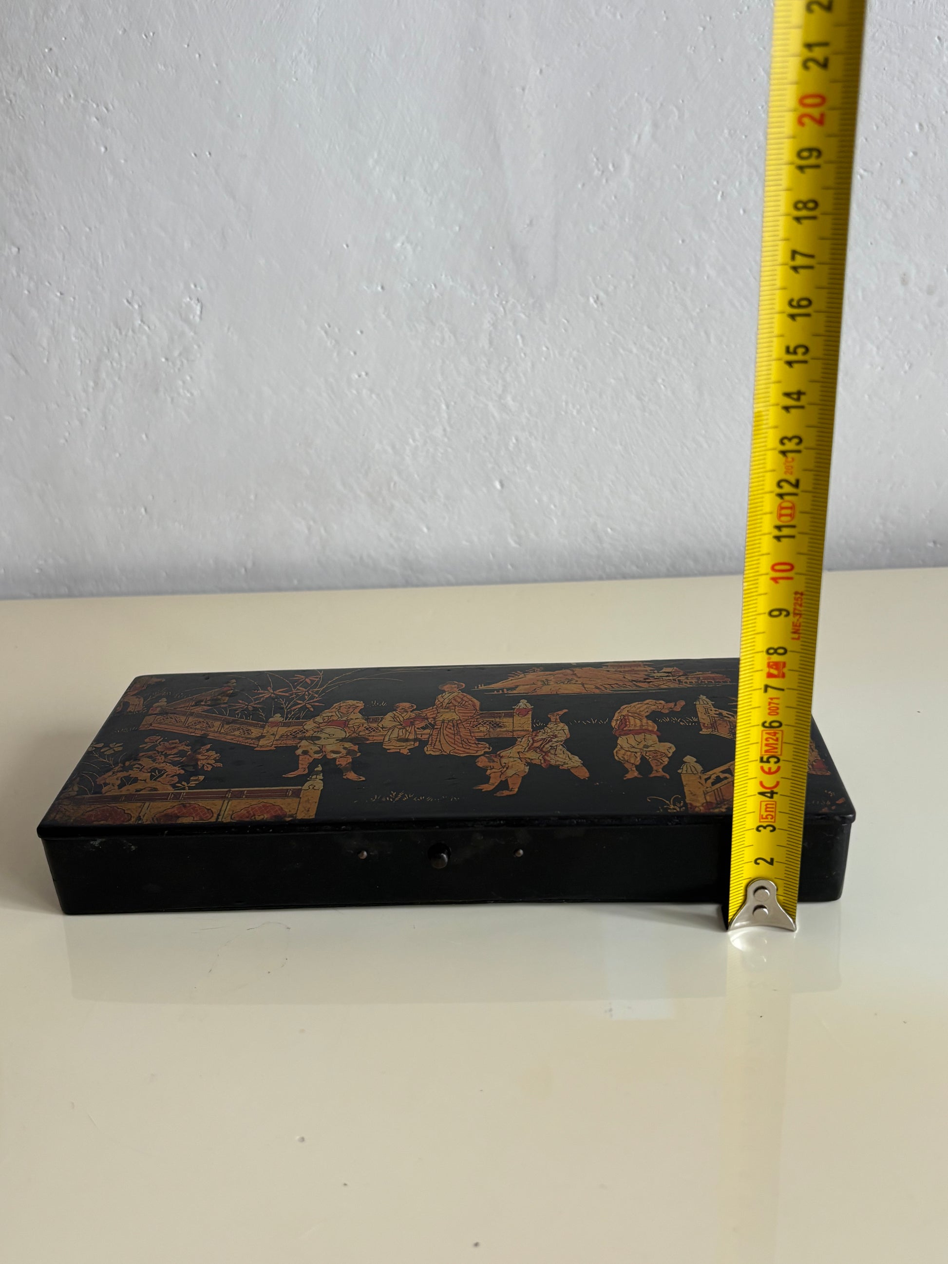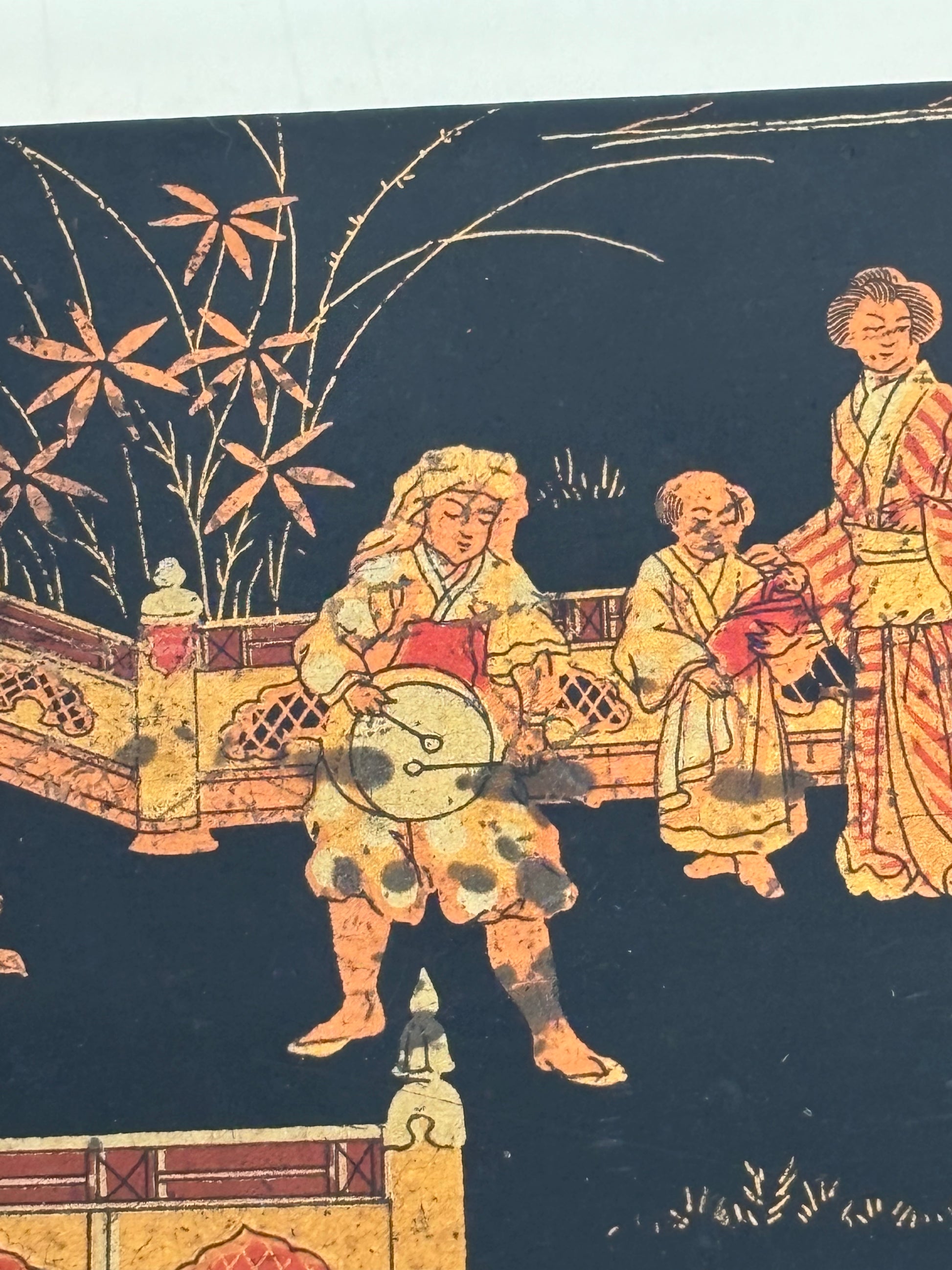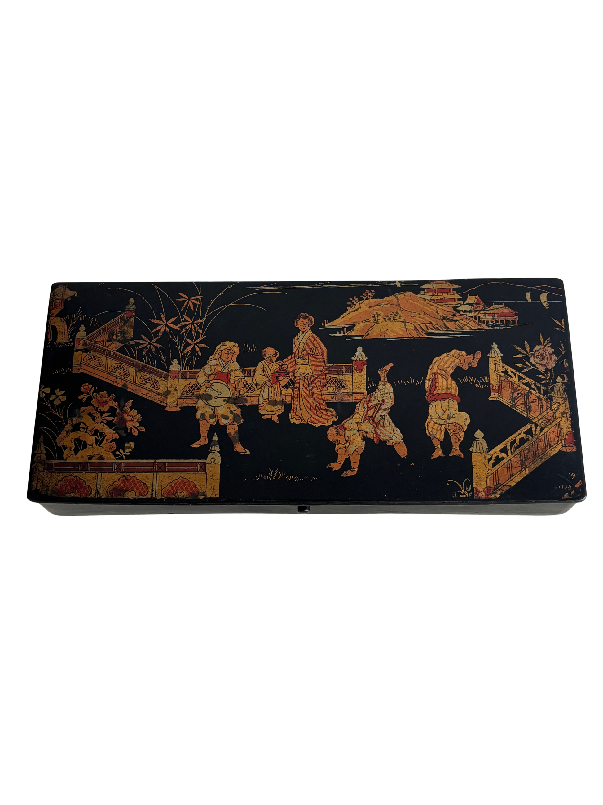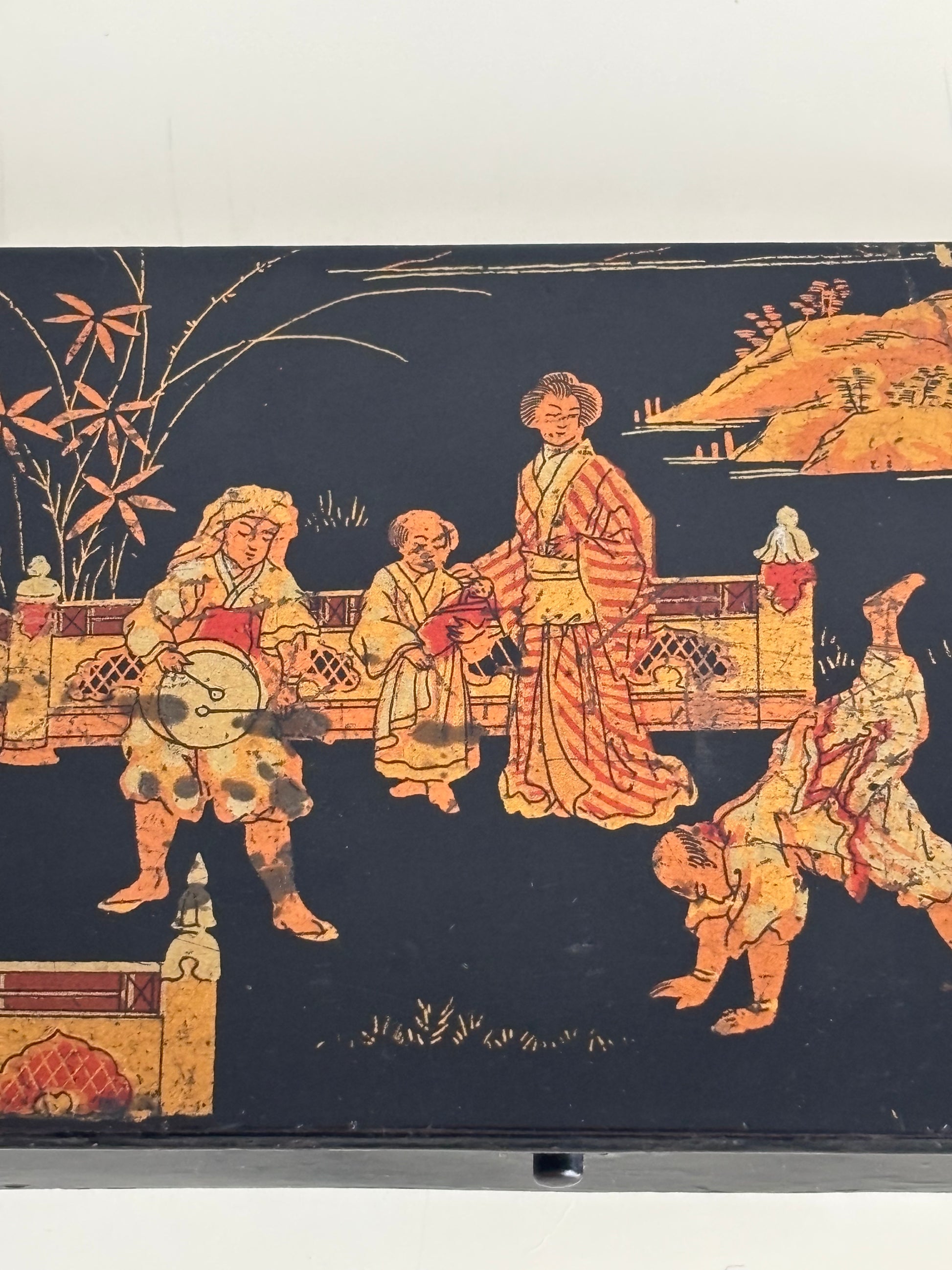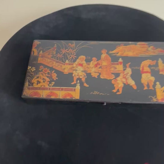 Elegante porta penne in stile giapponese risalente al periodo Napoleone III, databile tra il 1850 e il 1880, realizzato in cartapesta laccata nera e decorato con una raffinata scena figurativa di gusto giapponese. Il coperchio è impreziosito da una complessa rappresentazione di personaggi in abiti tradizionali, architetture e paesaggi ispirati all’Estremo Oriente, secondo l’estetica del japonisme che influenzò profondamente le arti decorative europee della seconda metà del XIX secolo.