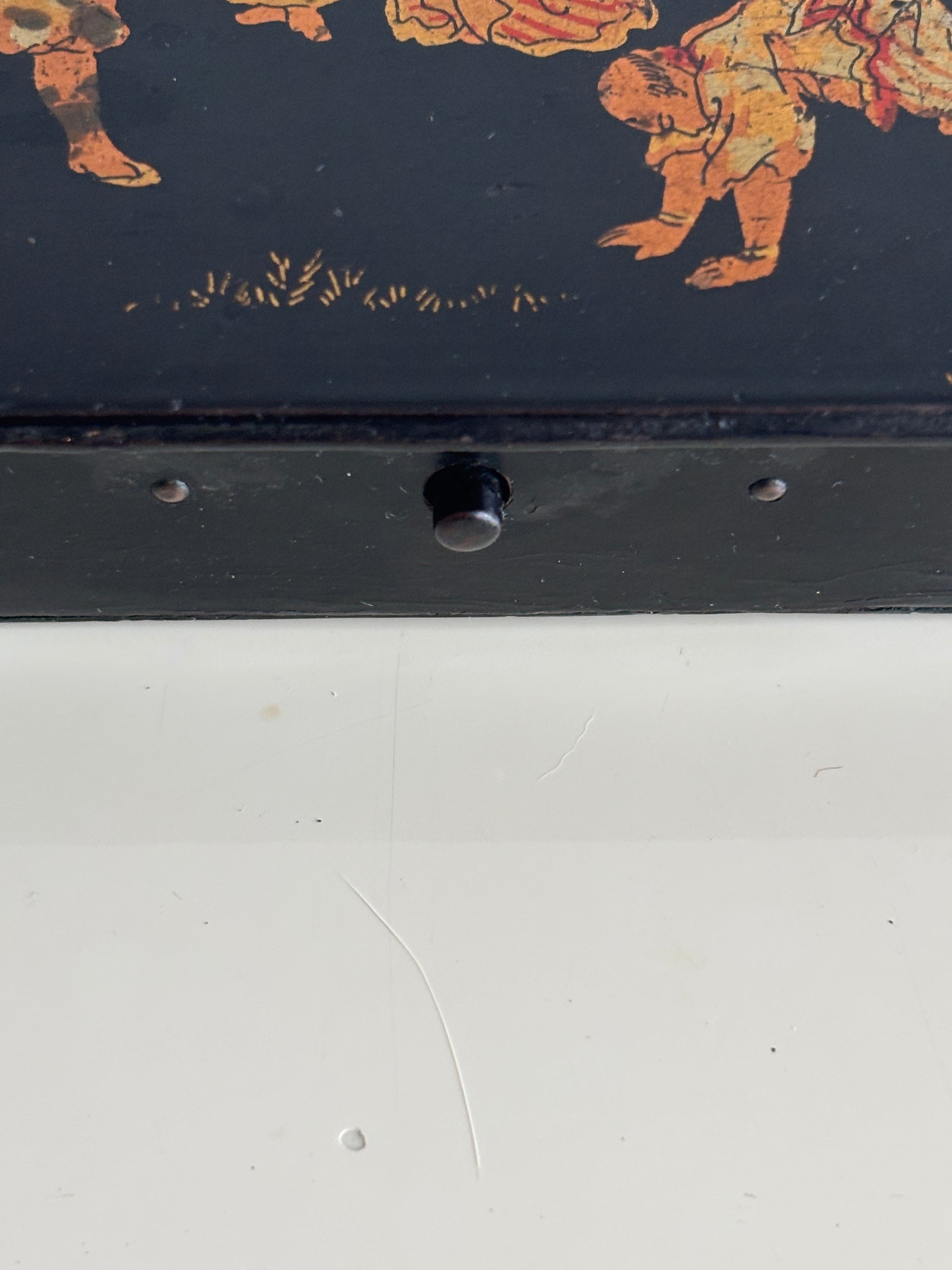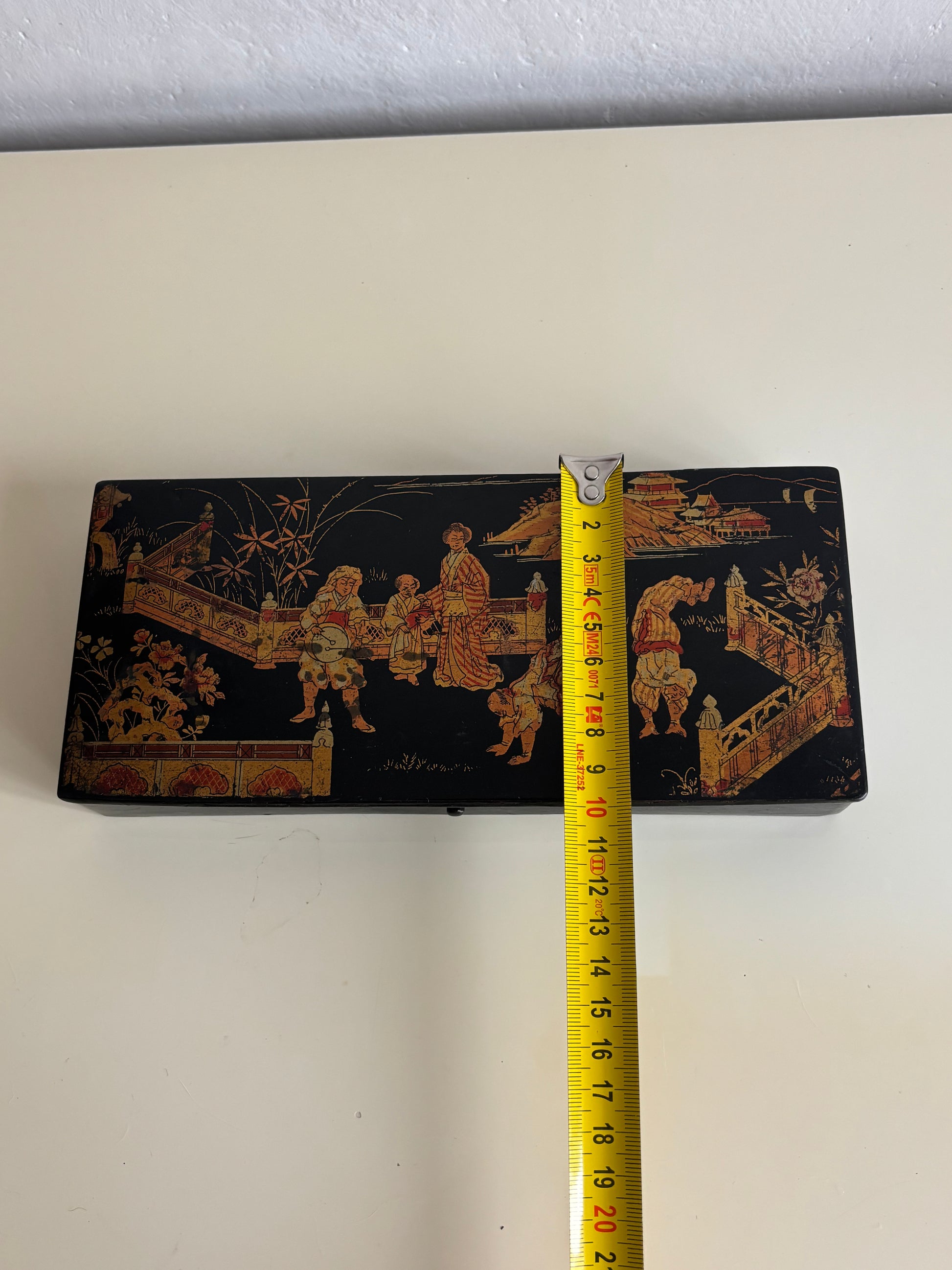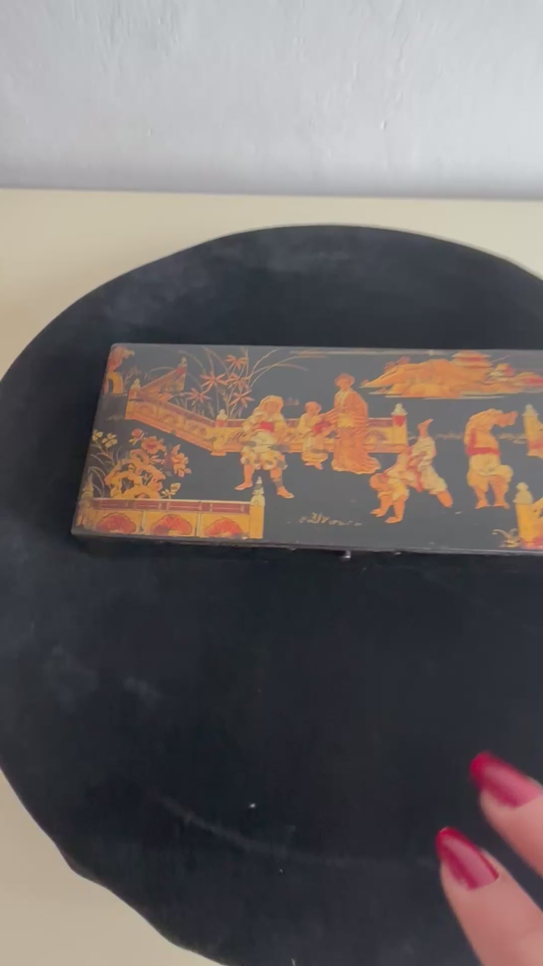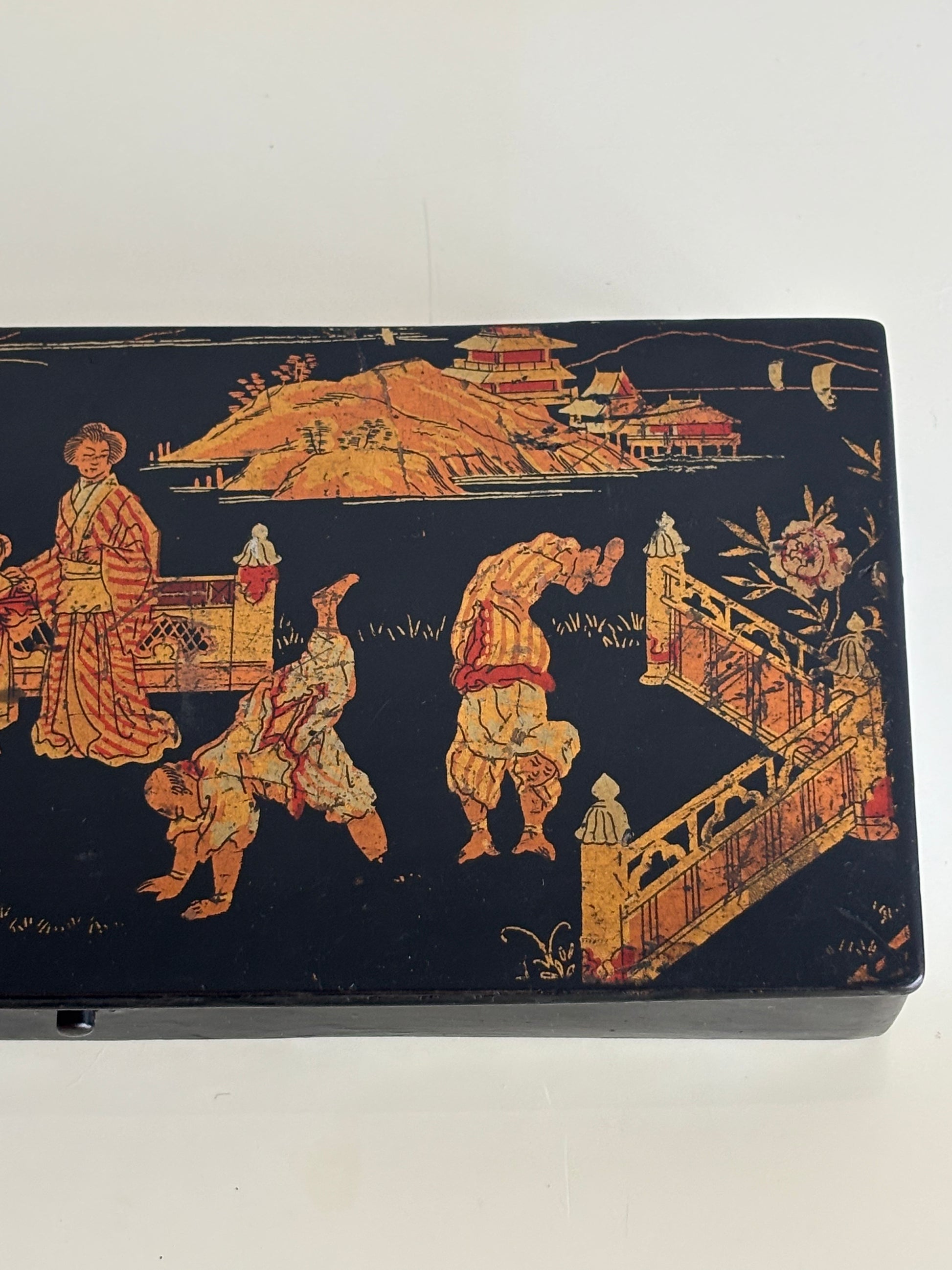Elegante porta penne in stile giapponese risalente al periodo Napoleone III, databile tra il 1850 e il 1880, realizzato in cartapesta laccata nera e decorato con una raffinata scena figurativa di gusto giapponese. Il coperchio è impreziosito da una complessa rappresentazione di personaggi in abiti tradizionali, architetture e paesaggi ispirati all’Estremo Oriente, secondo l’estetica del japonisme che influenzò profondamente le arti decorative europee della seconda metà del XIX secolo.