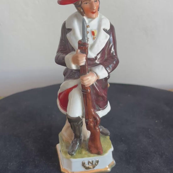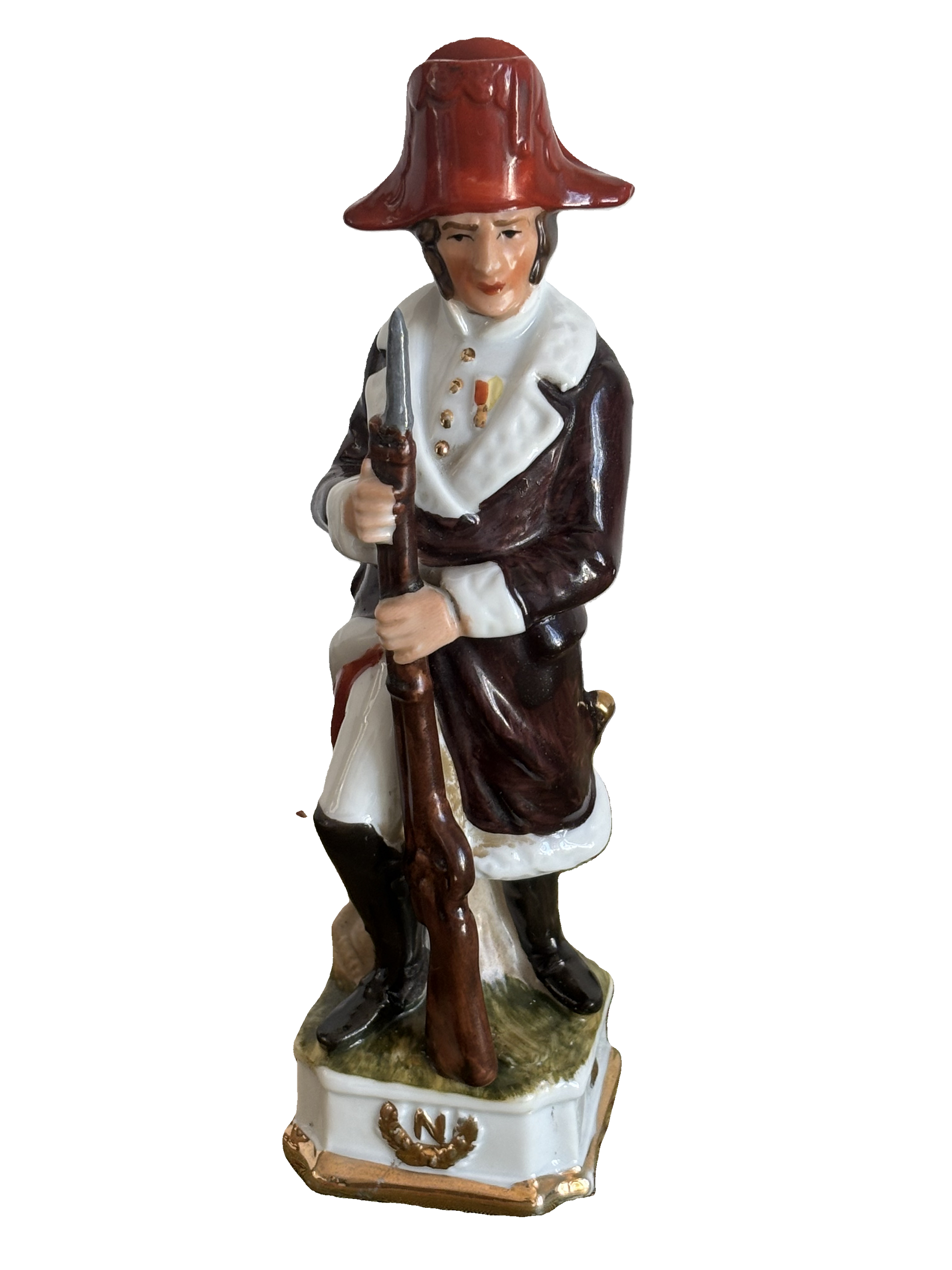 Il soldatino è rappresentato in posizione eretta, con il fucile in mano e la baionetta, mentre indossa una divisa con cappotto marrone e cappello rosso tipico dell’epoca napoleonica.