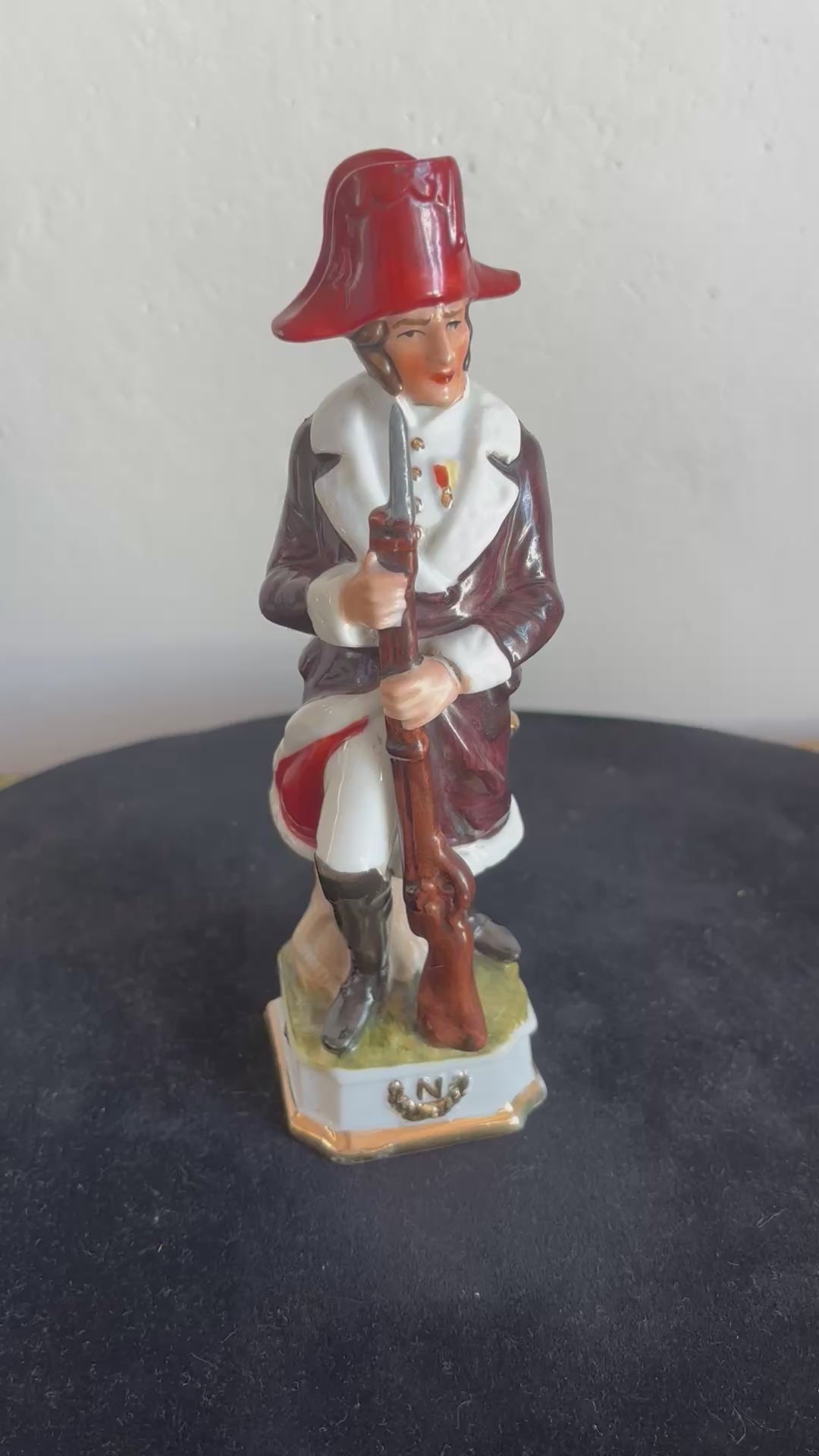 Elegante statuina in ceramica raffigurante un soldato napoleonico in uniforme storica. Questo pezzo, non marchiato, è una imitazione delle celebri produzioni Capodimonte, note per la loro qualità artigianale e l’eleganza delle forme.