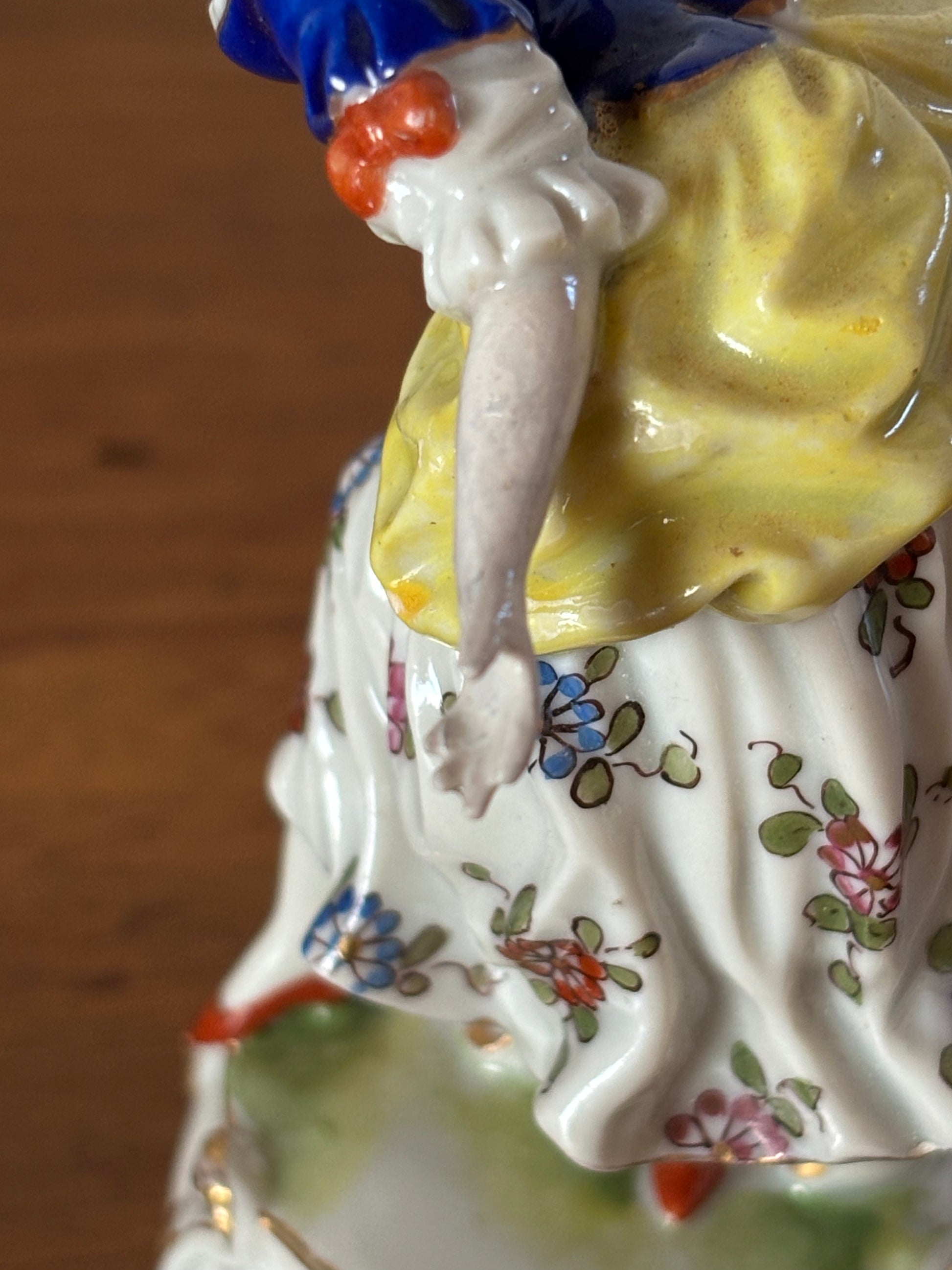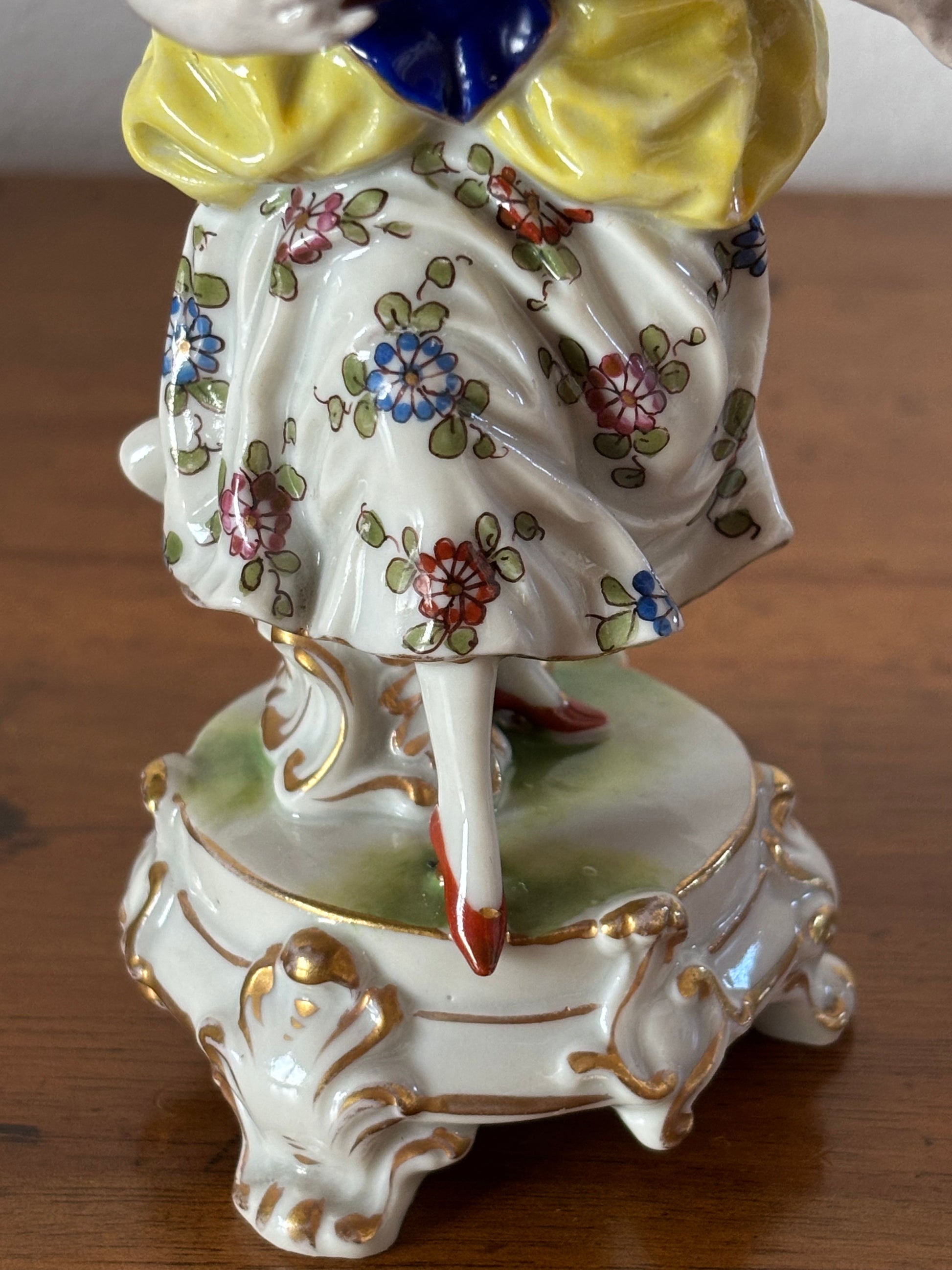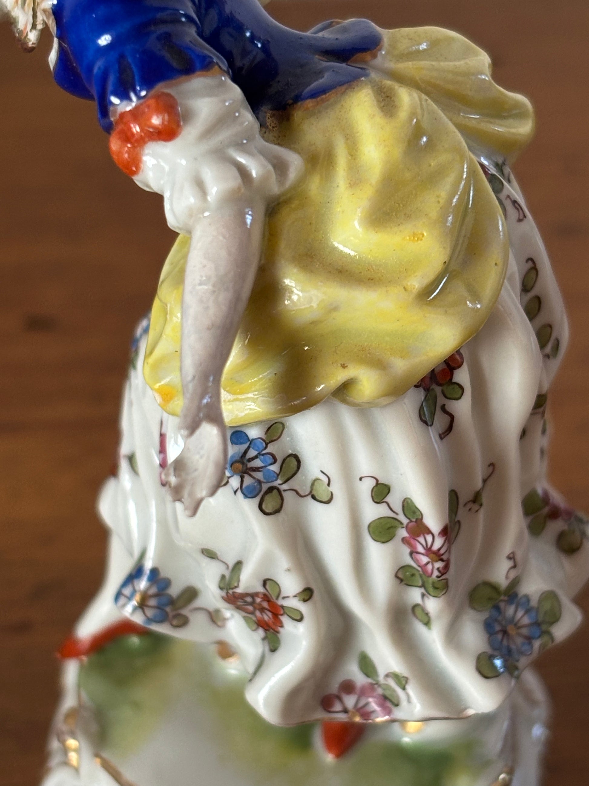La figura femminile è modellata con grande eleganza, caratterizzata da abiti riccamente decorati, colori vivaci e una postura dinamica che riflette pienamente lo stile rococò tipico della produzione di Ludwigsburg. I dettagli floreali e le sfumature delicate mettono in risalto la qualità artigianale del pezzo e la cura esecutiva propria delle manifatture del periodo.