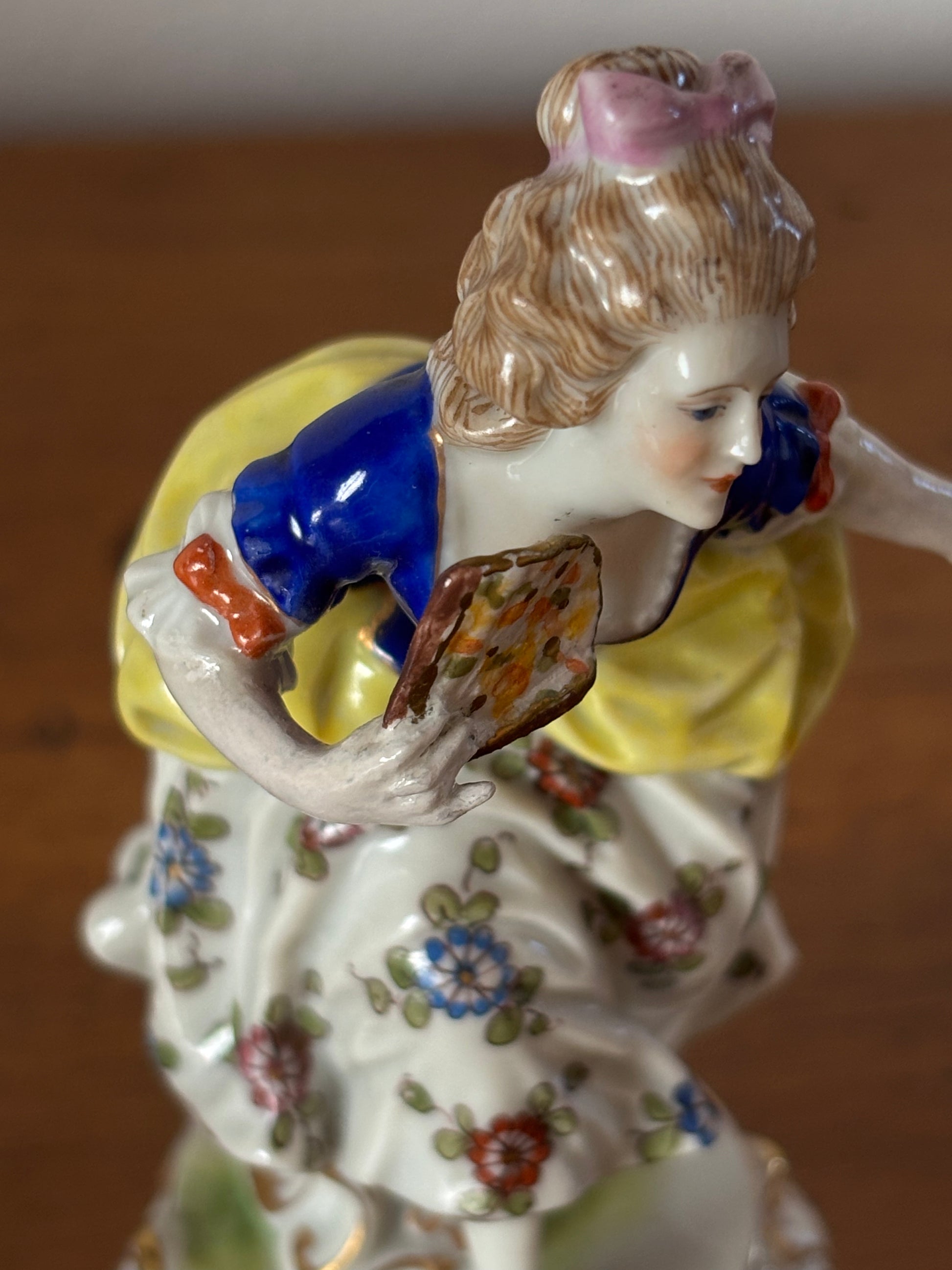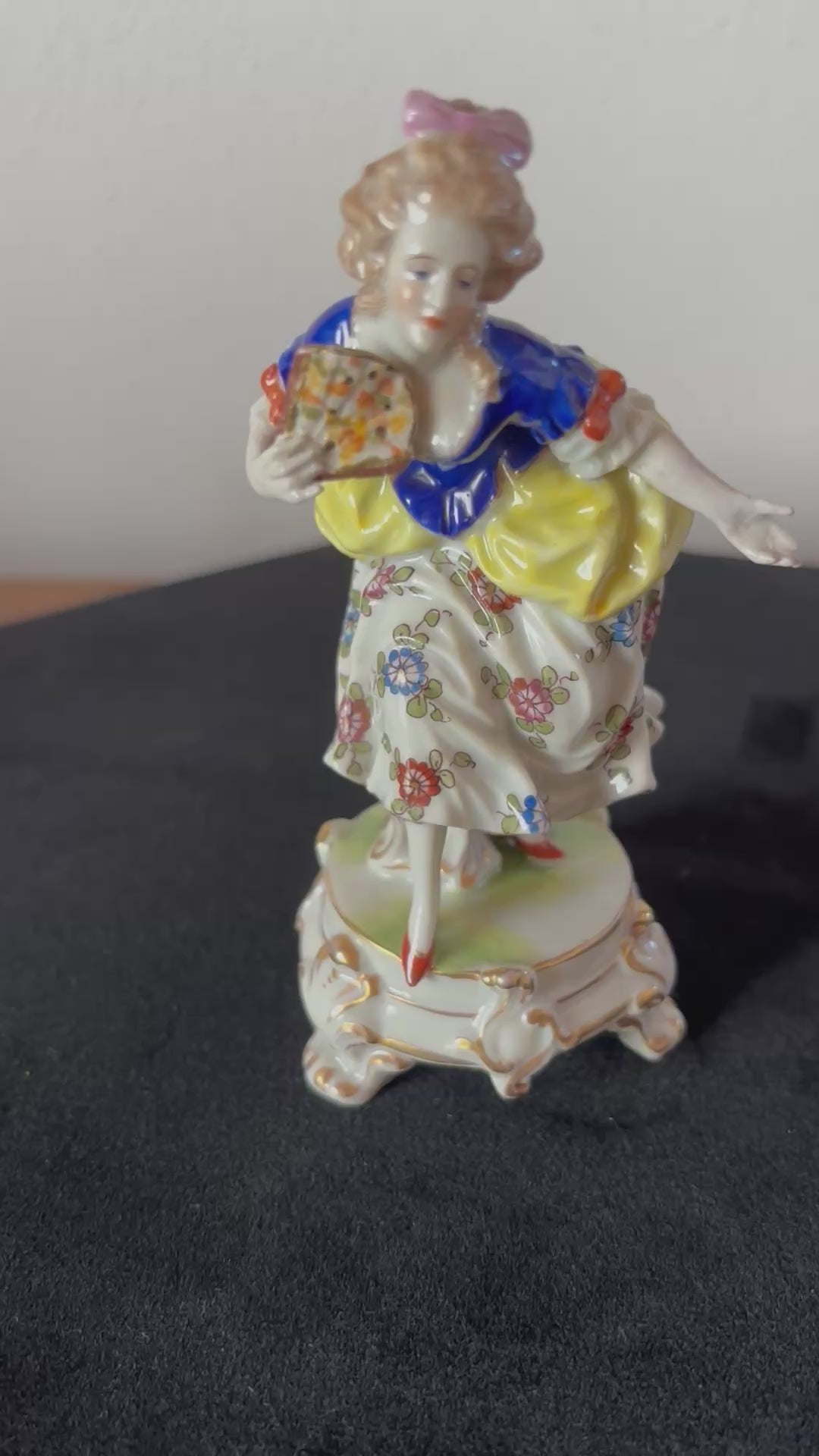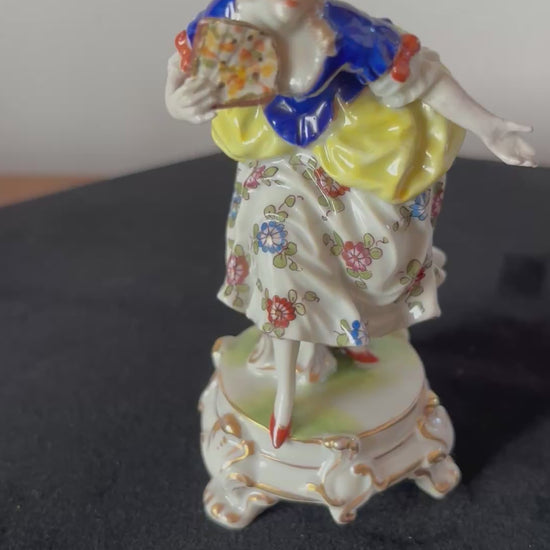 La statuetta ha beneficiato di un restauro conservativo accurato, durante il quale le braccia e il ventaglio della dama sono stati ricostruiti con attenzione, rispettando proporzioni, cromie e stile originari. L’intervento è stato eseguito in modo discreto e perfettamente integrato, preservando l’armonia estetica e il valore storico dell’opera.