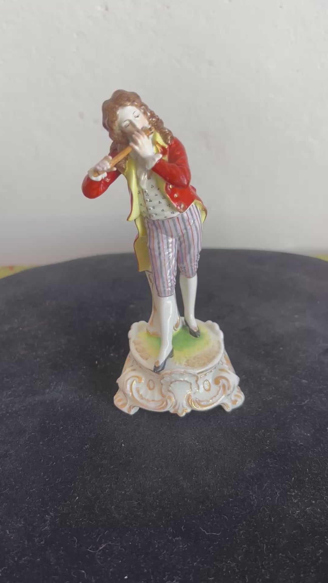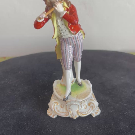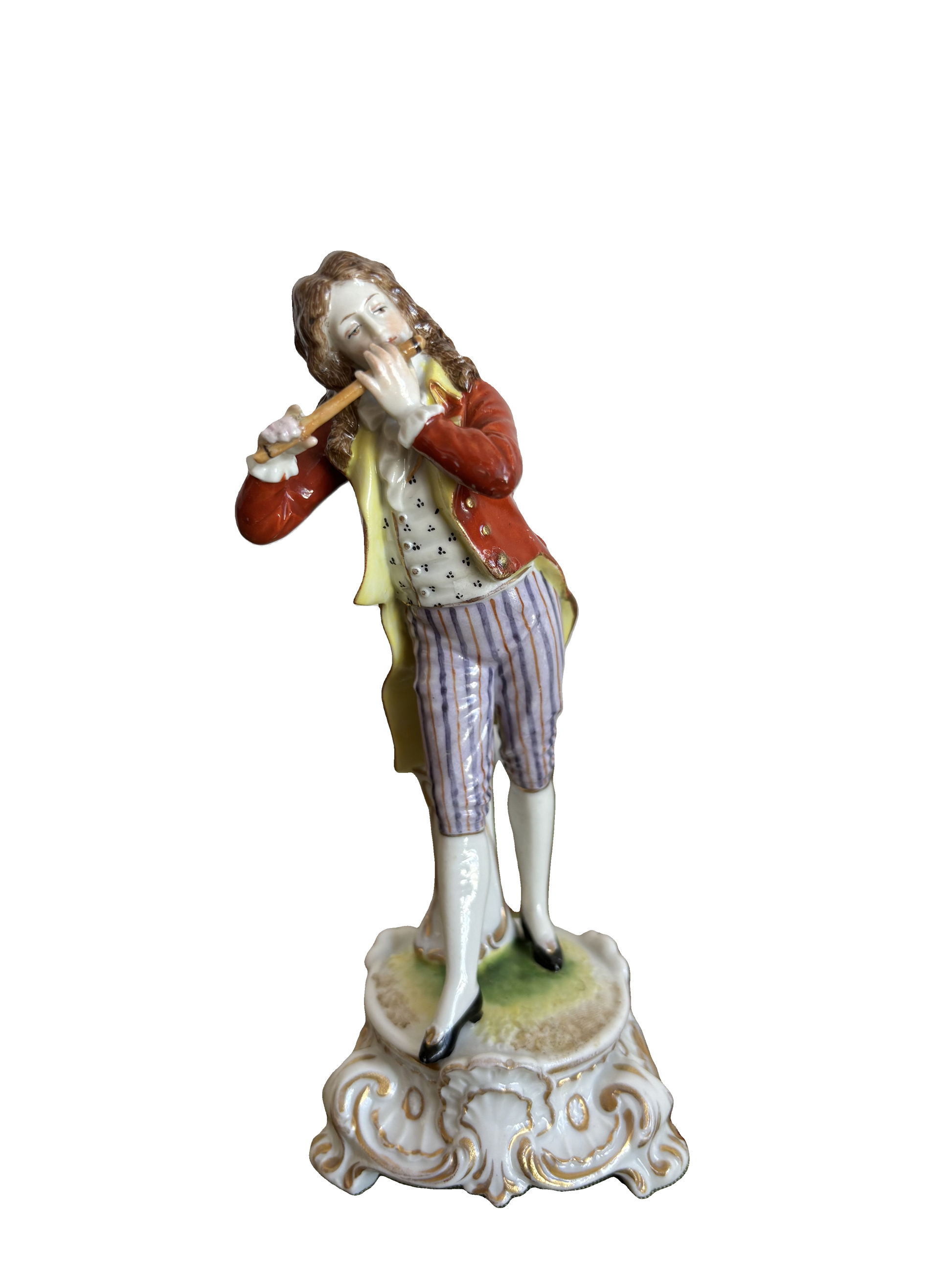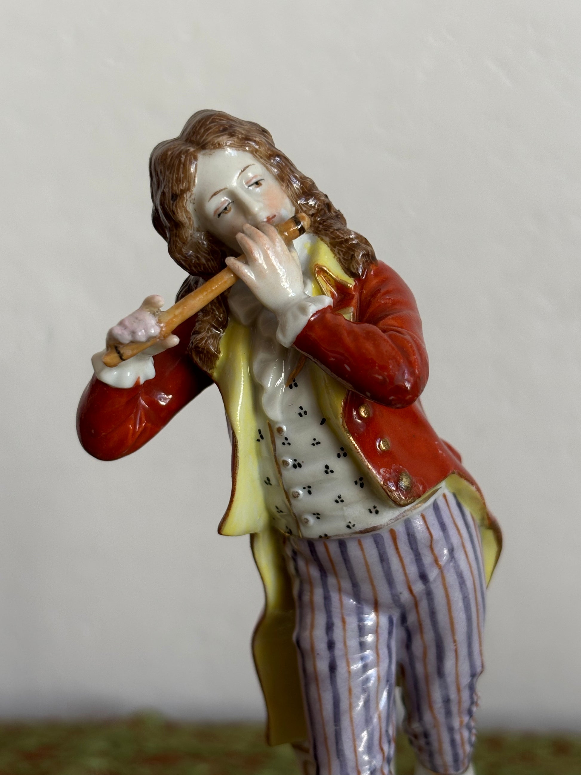 Elegante statuetta in porcellana raffigurante un musicista settecentesco intento a suonare il flauto, caratterizzata da un livello di maestria e attenzione ai dettagli davvero notevoli. L’espressione del volto, la postura dinamica e la raffinatezza dei particolari della giacca, delle calze e della base riccamente decorata evidenziano una lavorazione di alta qualità, tipica delle prestigiose manifatture europee.
