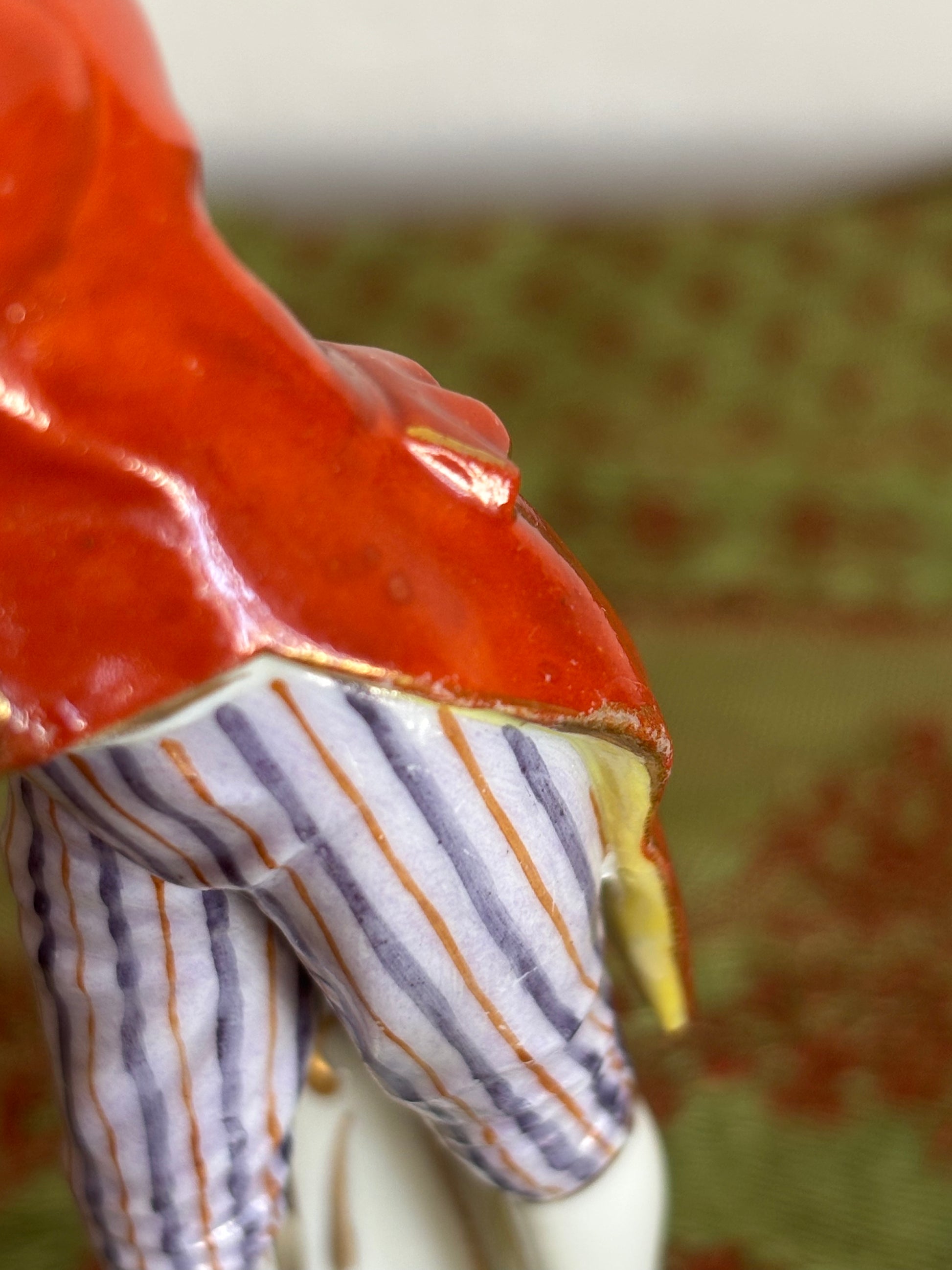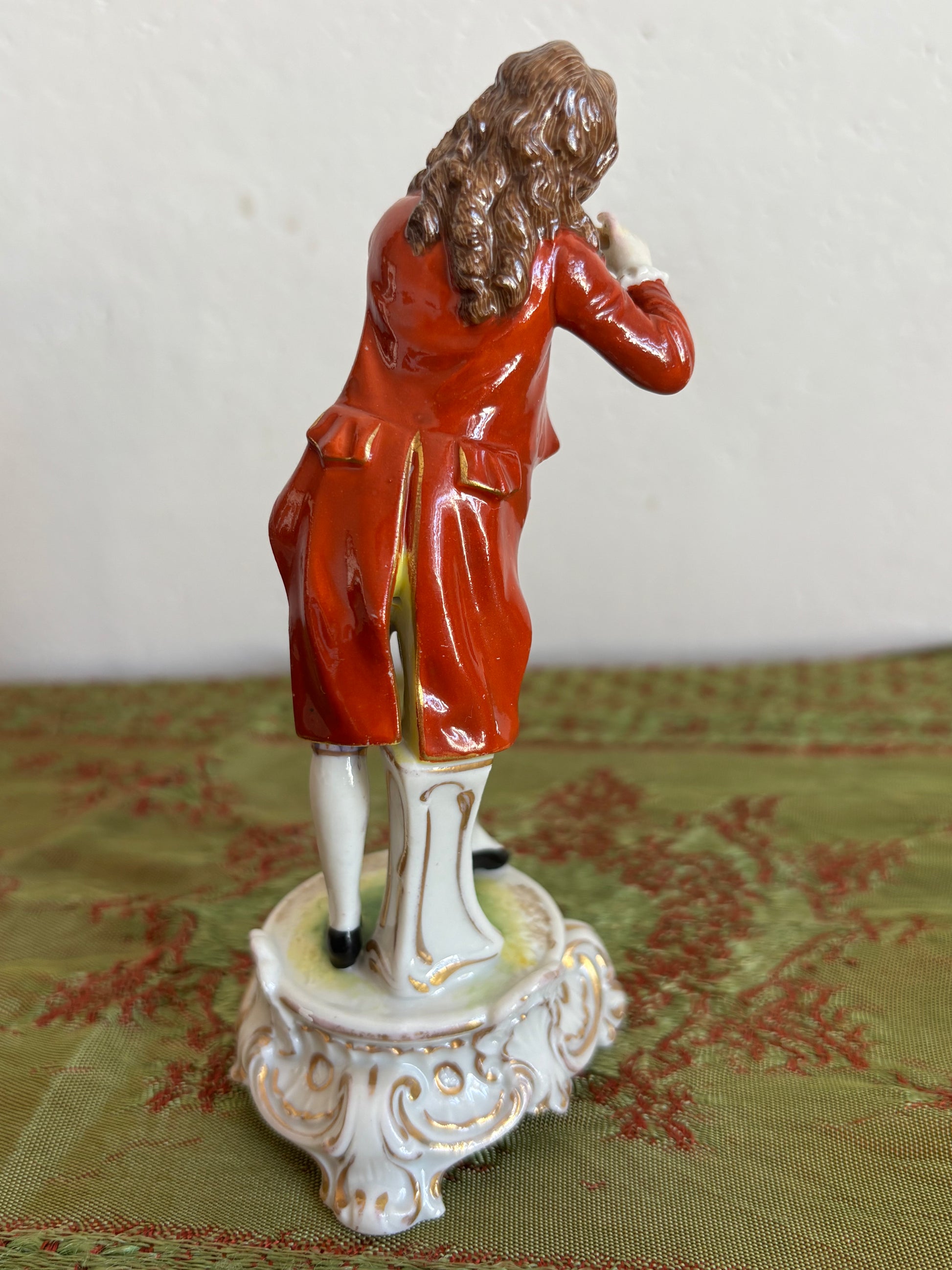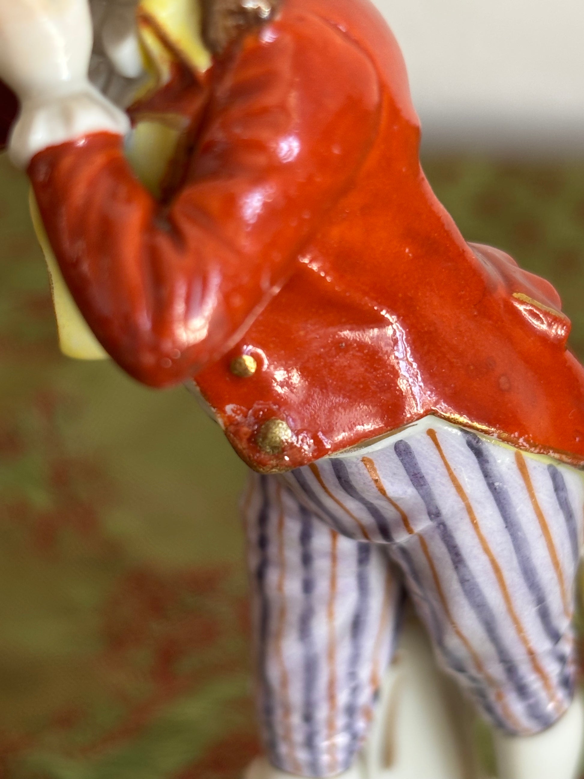 La statuetta è marchiata, con un segno che può essere attribuito alla produzione Ludwigsburg, celebre per le sue porcellane artistiche di pregio. Alcune parti sono state restaurate: le mani e il beccuccio del flauto sono stati ricostruiti con grande cura, mentre la giacca presenta piccoli interventi di restauro che mantengono l’integrità estetica dell’opera.