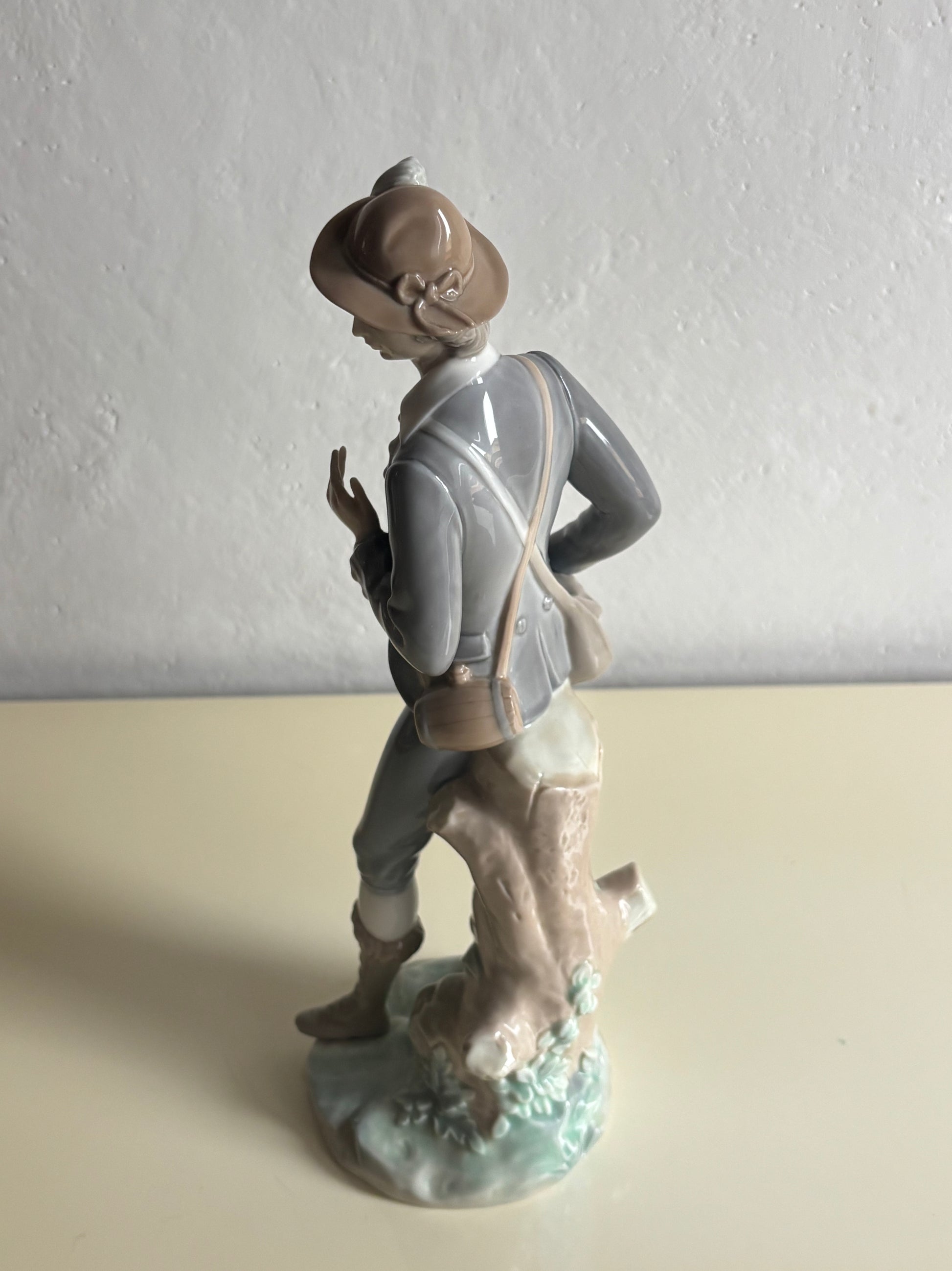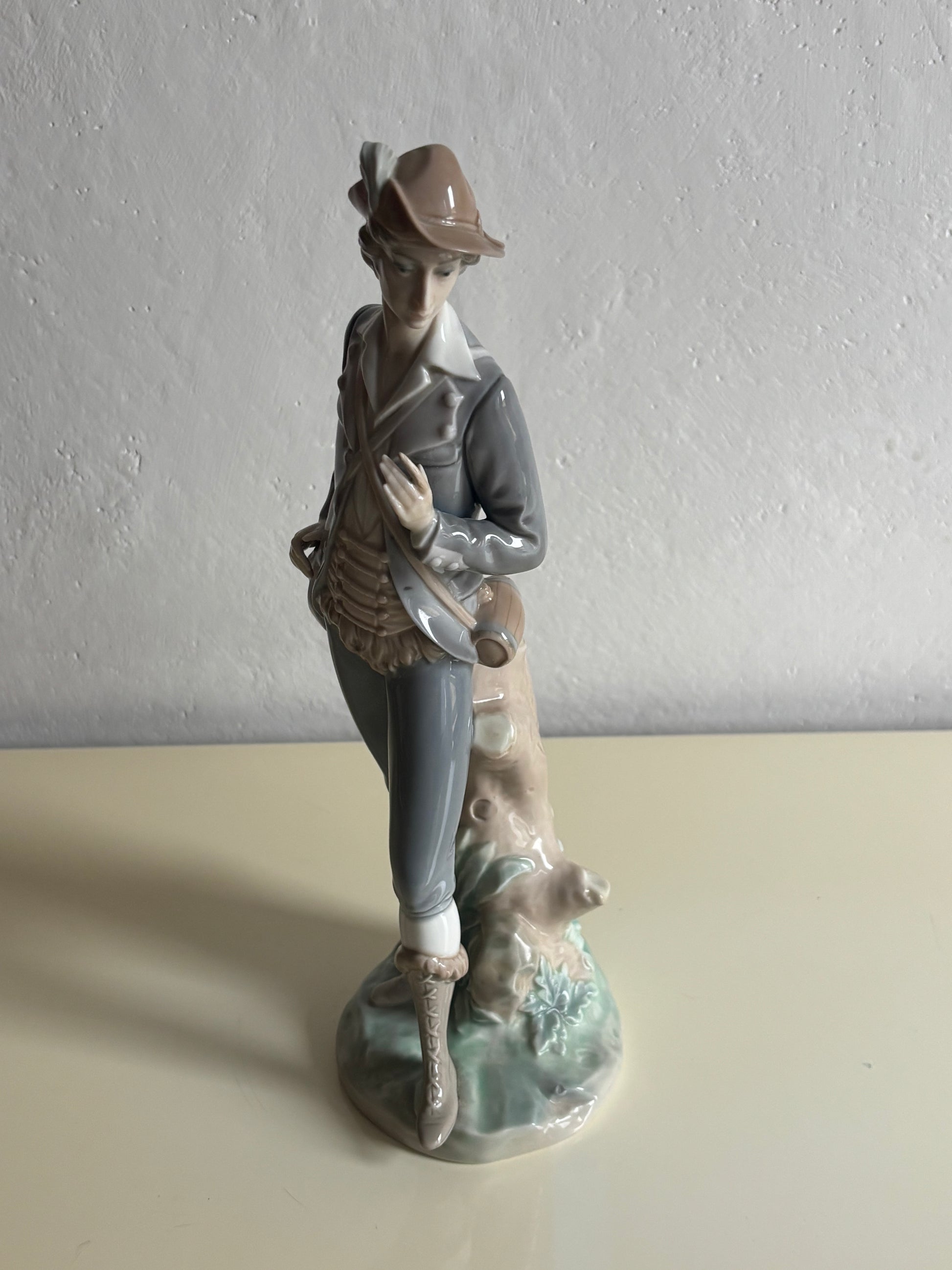 Statuetta originale Lladró in ceramica smaltata, modello “Country Man”, raffigurante un elegante gentiluomo in abiti settecenteschi, con tricorno piumato, giacca lunga e stivali alti.