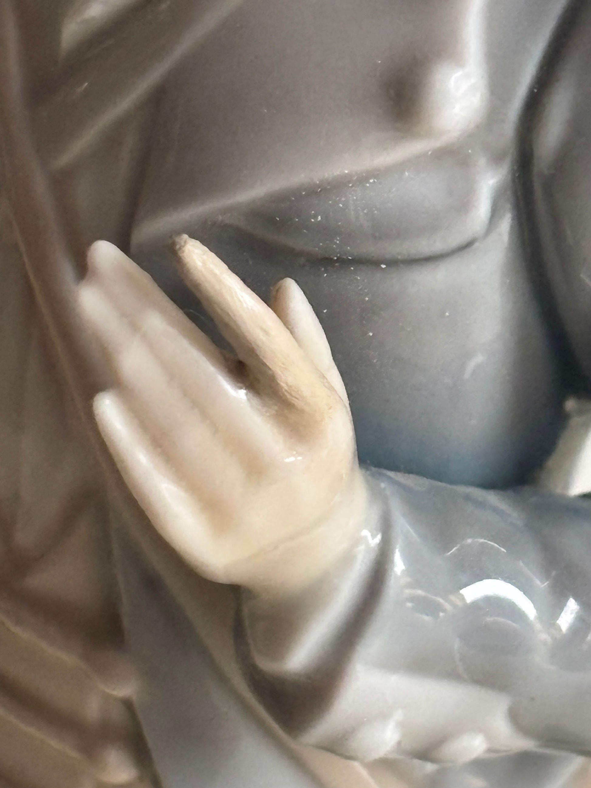 L’oggetto è in buone condizioni generali, con la ricostruzione di un singolo dito della mano originariamente mancante: l’intervento è stato eseguito con discrezione, preservando l’armonia complessiva della figura.